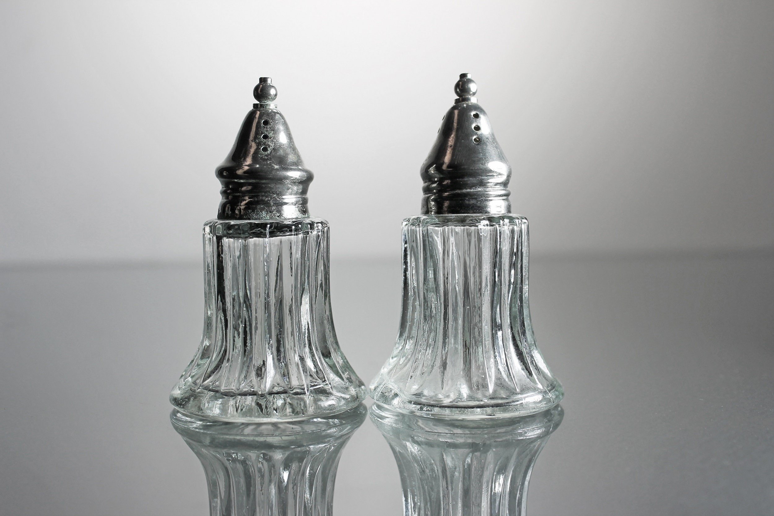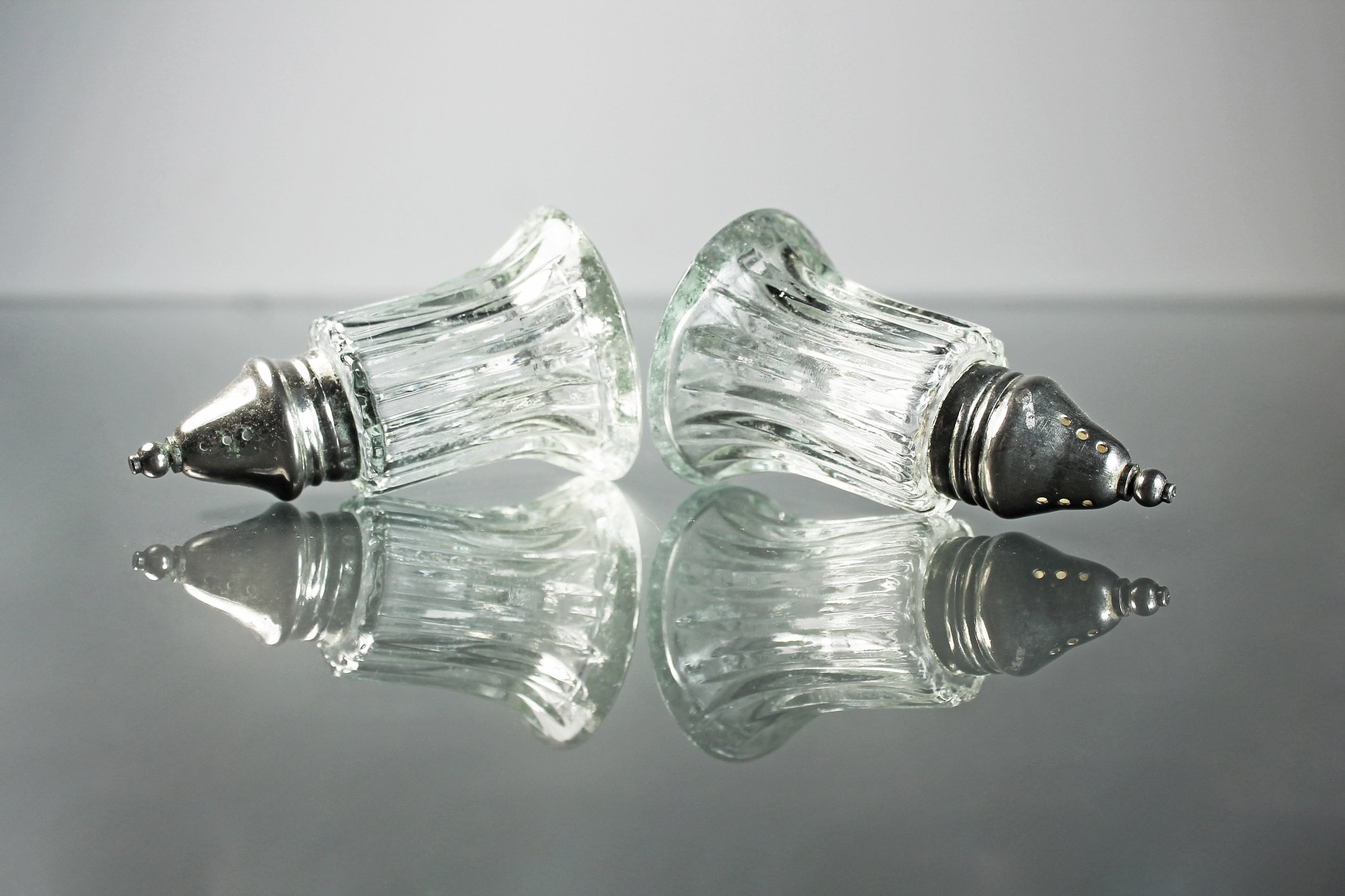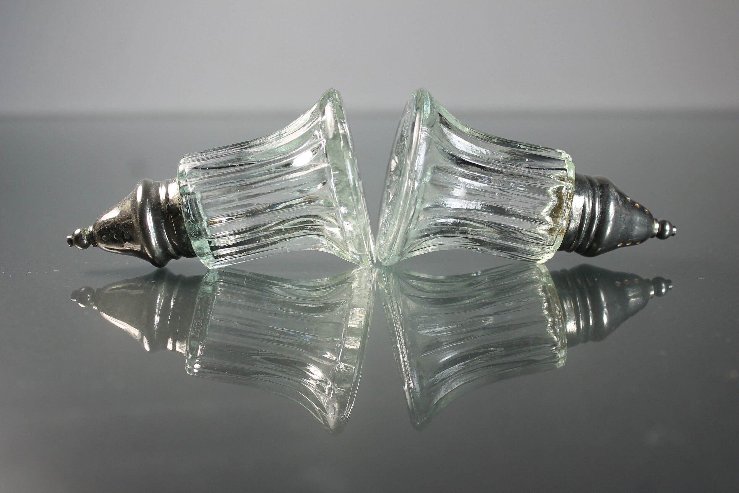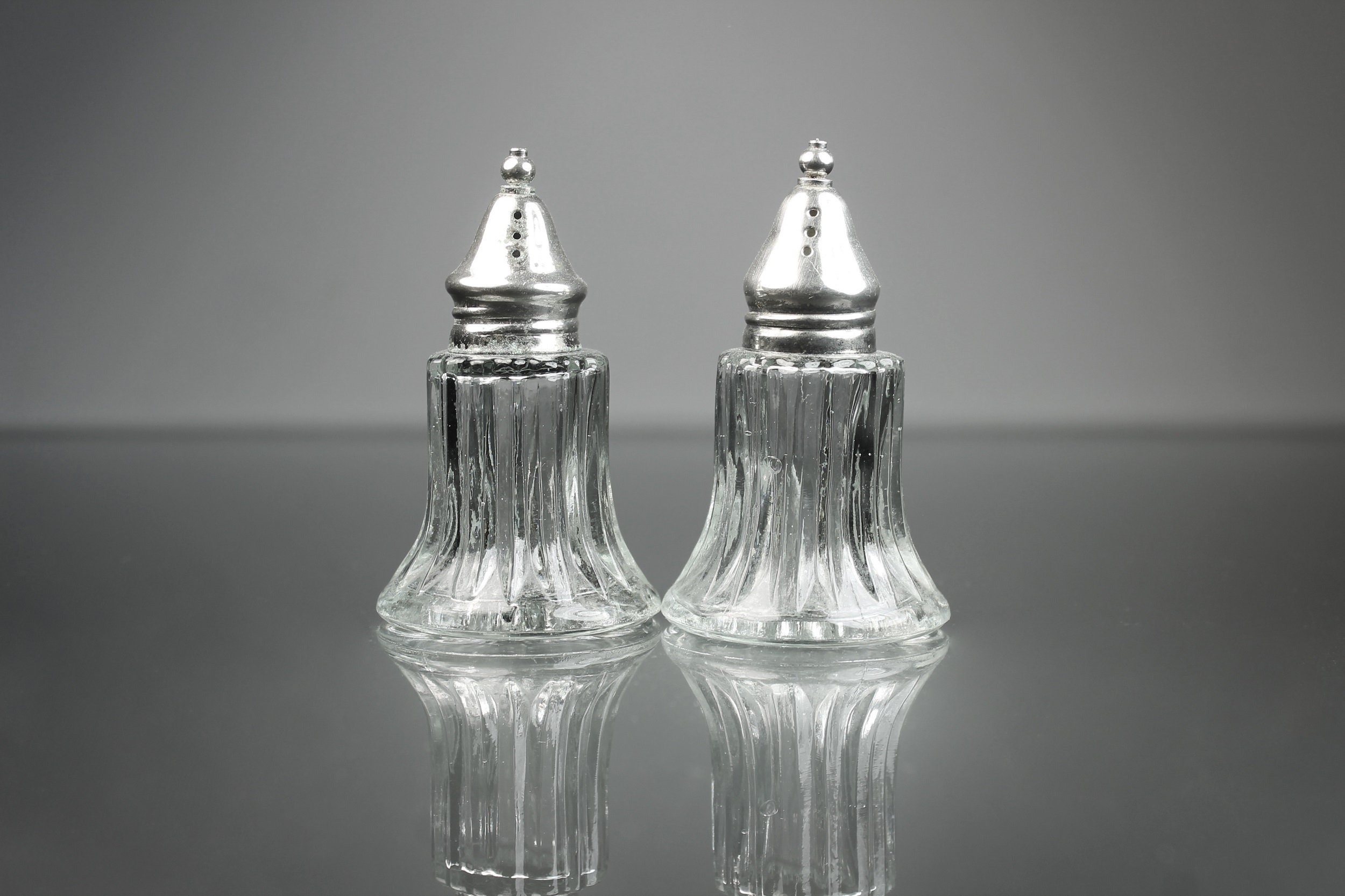 A lovely set of clear glass salt and pepper shakers with silver tops. This set is made of heavy glass and has a ribbed pattern. These would definitely brighten up any special occasion table and are sturdy enough to use every day. They would look wonderful on a buffet, table, or sideboard.
