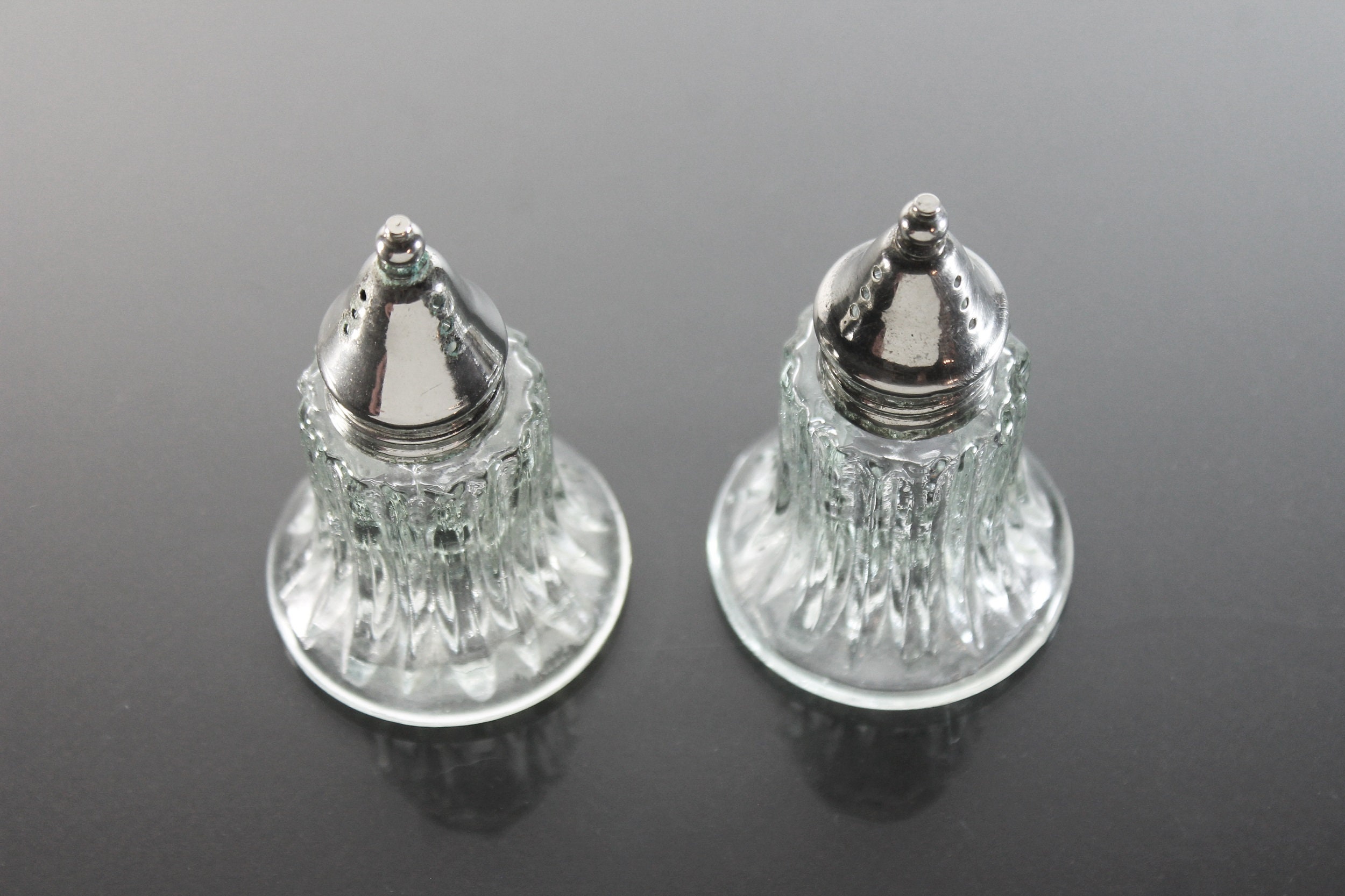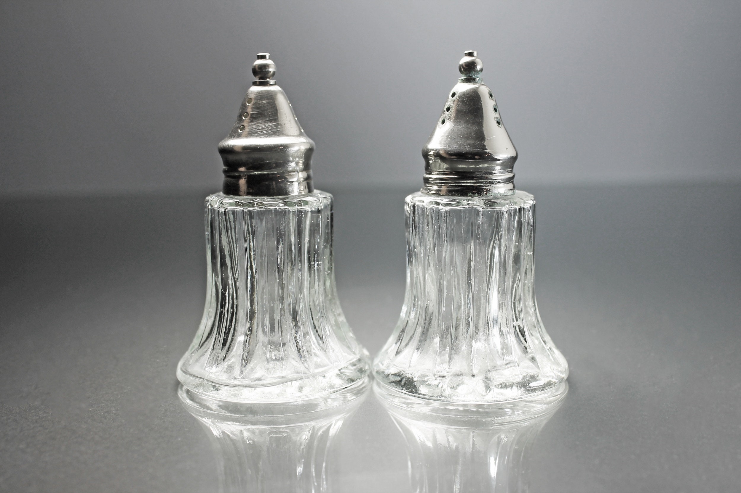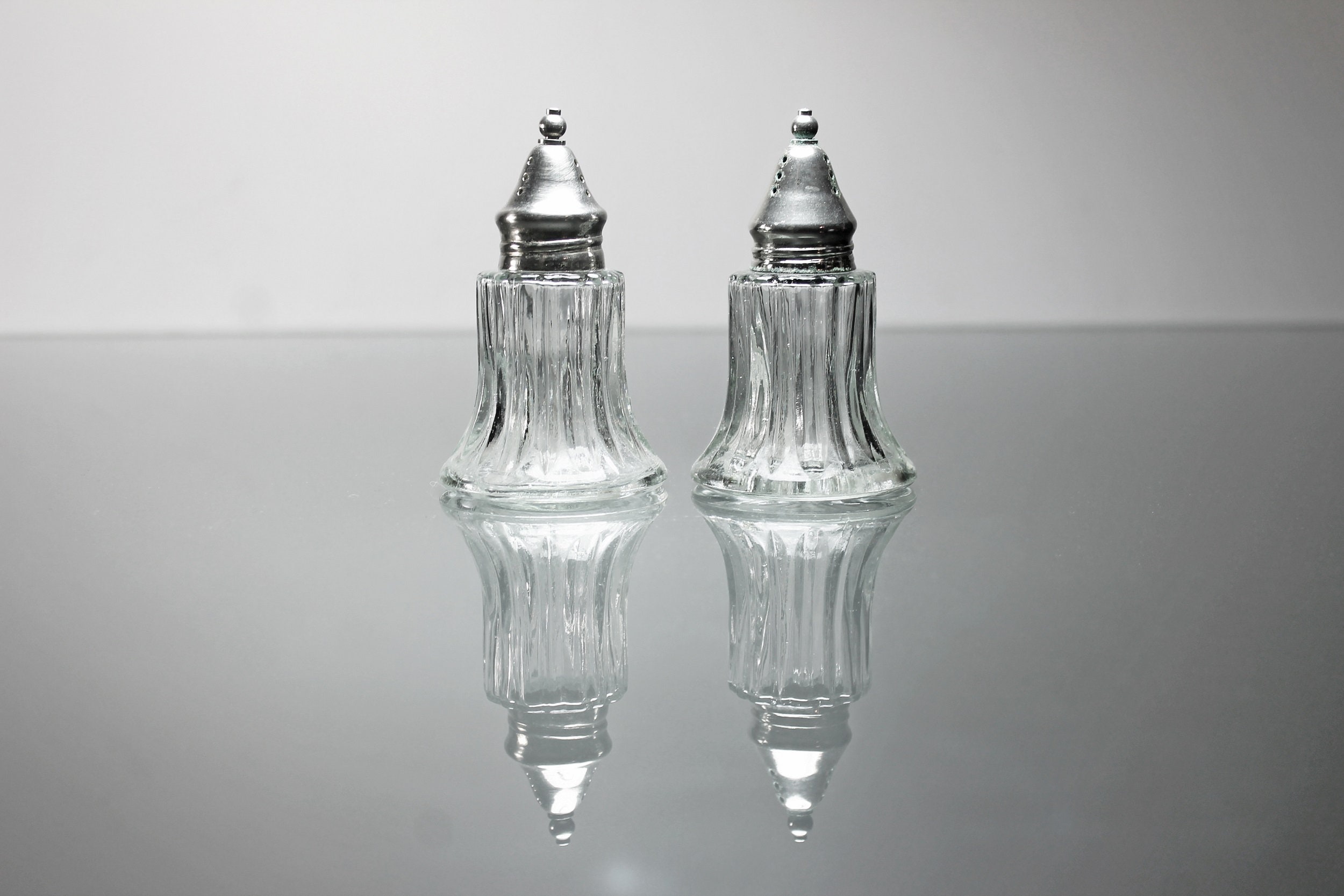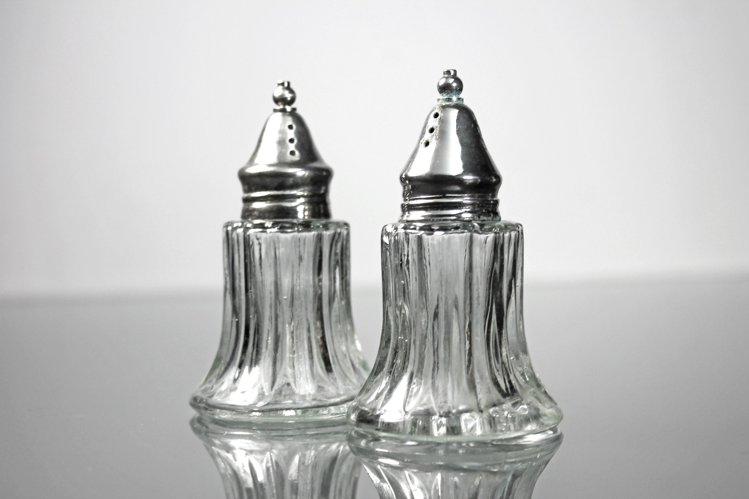A lovely set of clear glass salt and pepper shakers with silver tops. This set is made of heavy glass and has a ribbed pattern. These would definitely brighten up any special occasion table and are sturdy enough to use every day. They would look wonderful on a buffet, table, or sideboard.