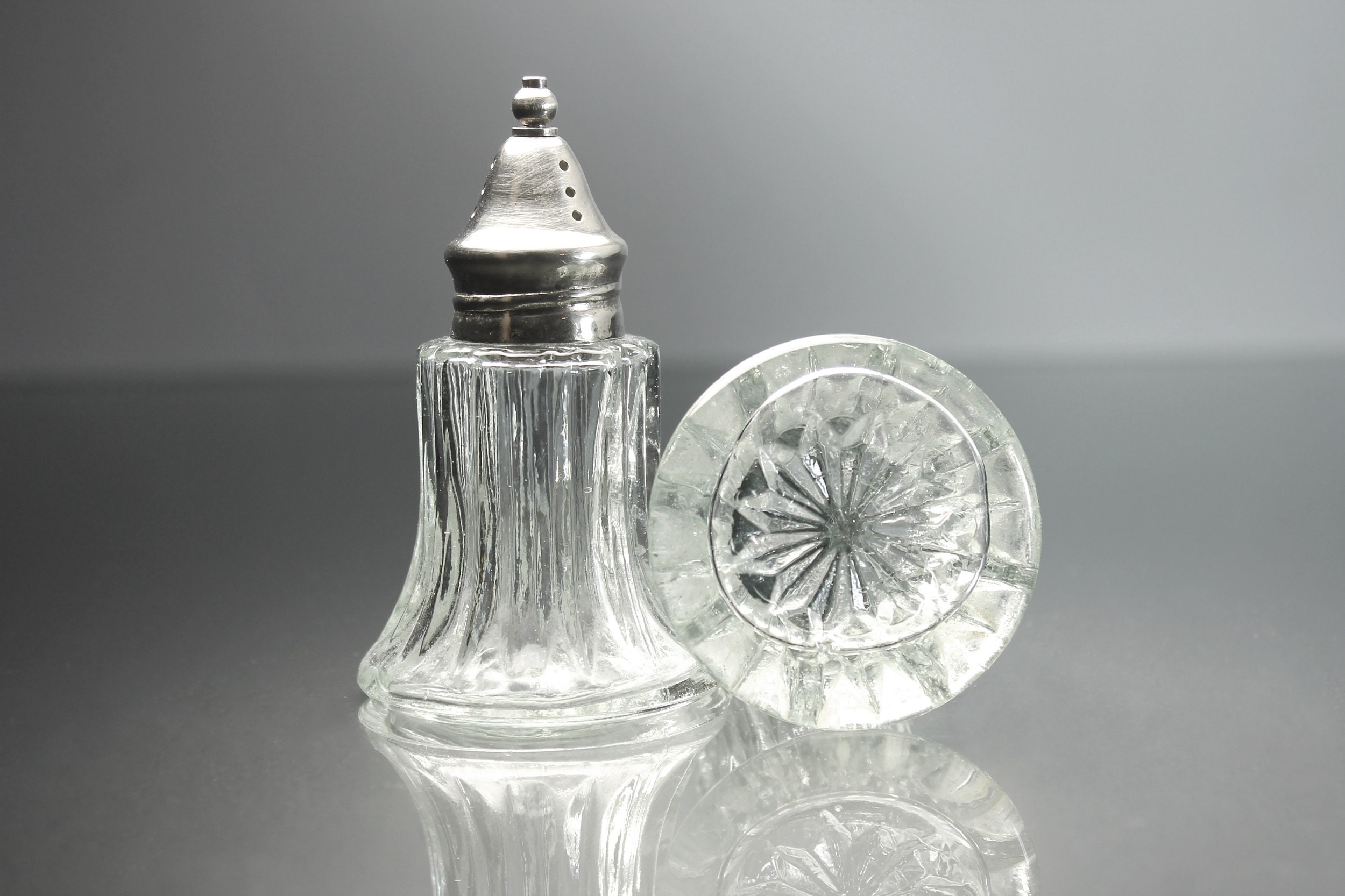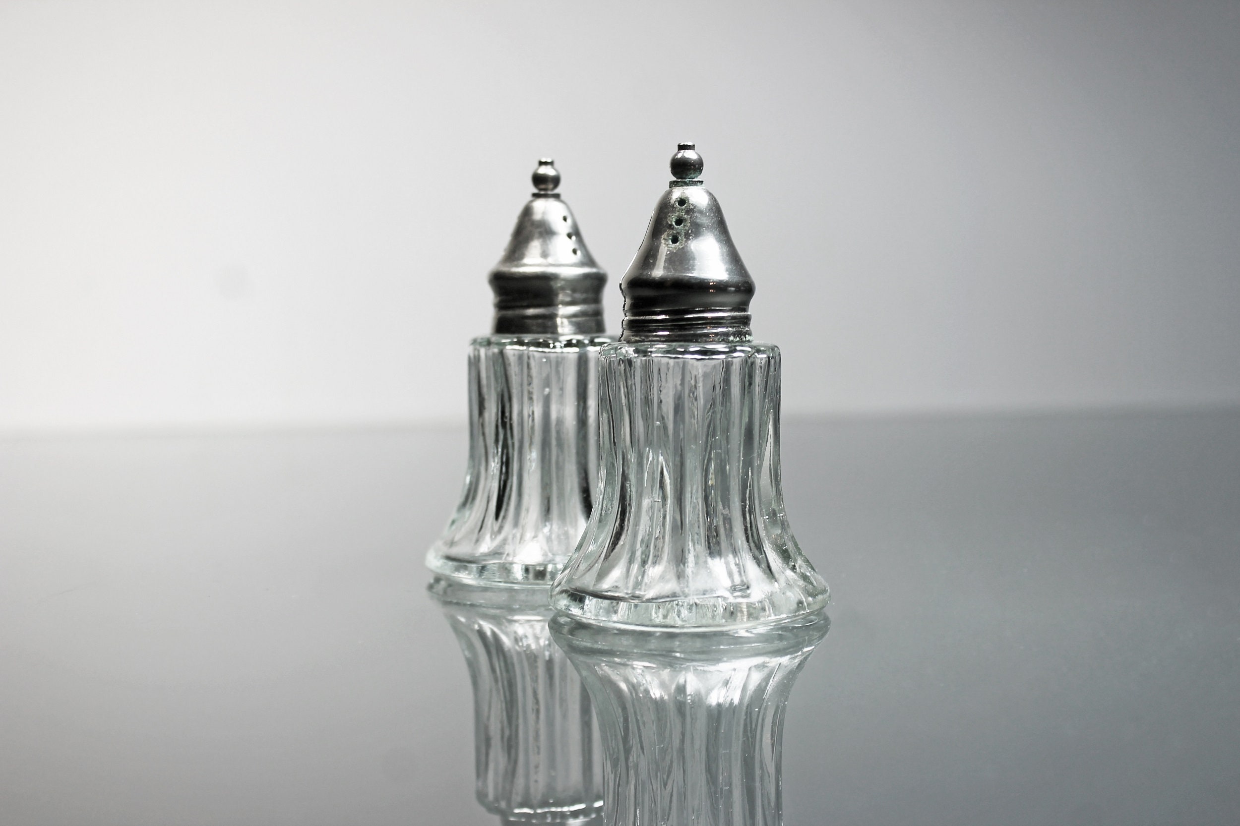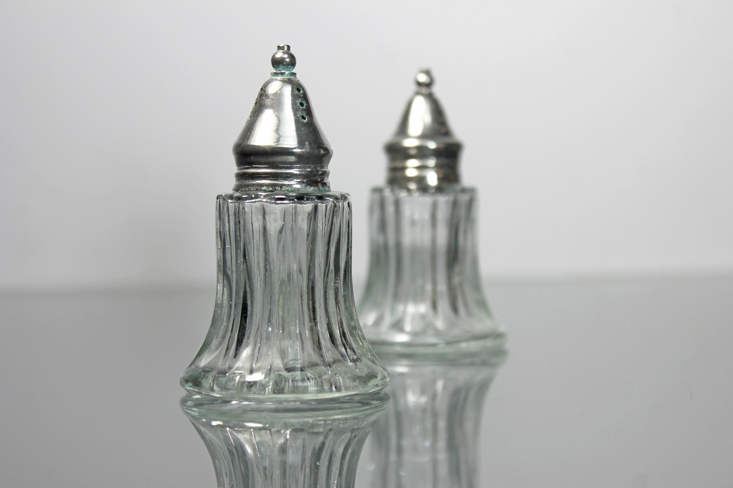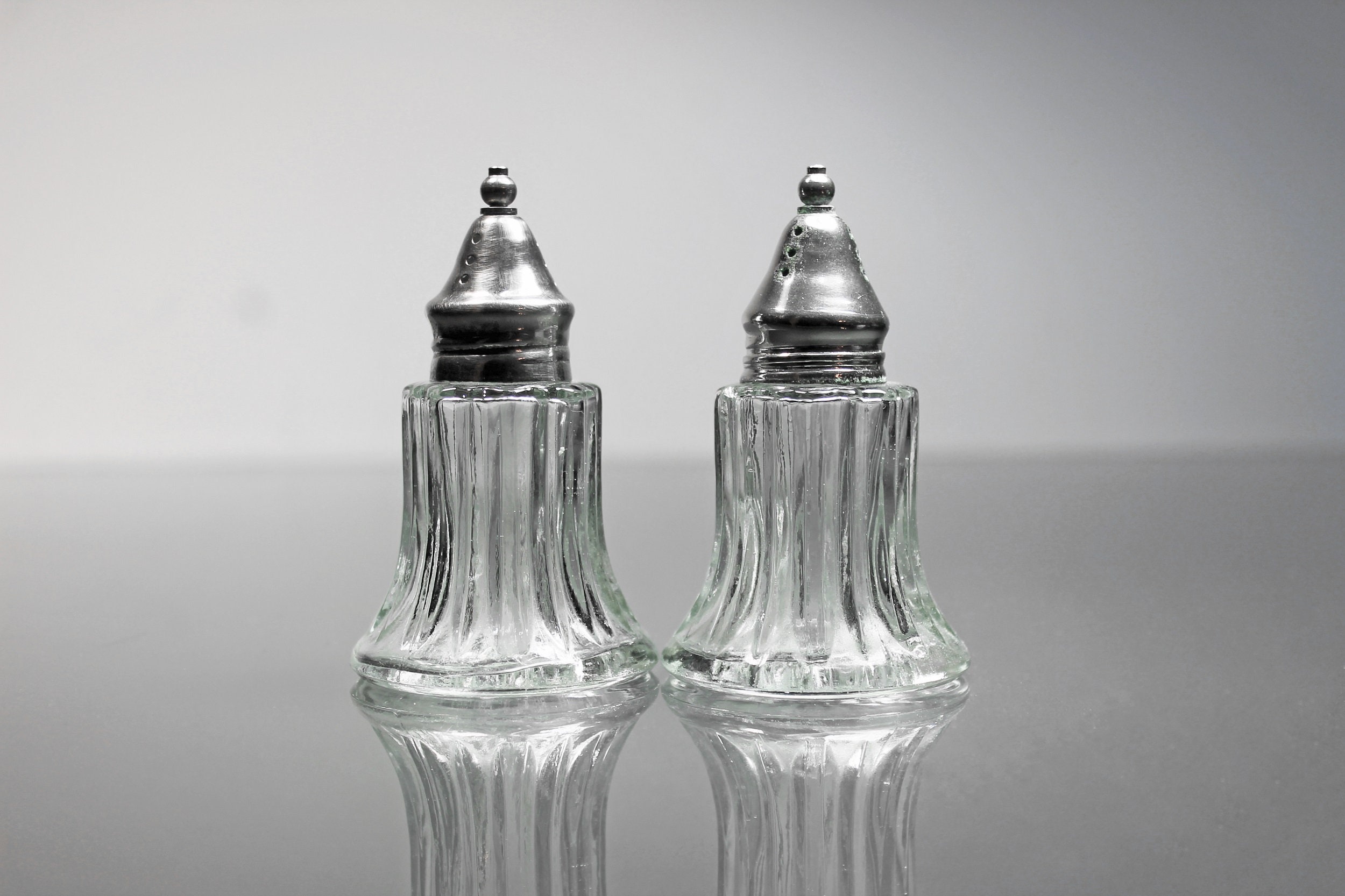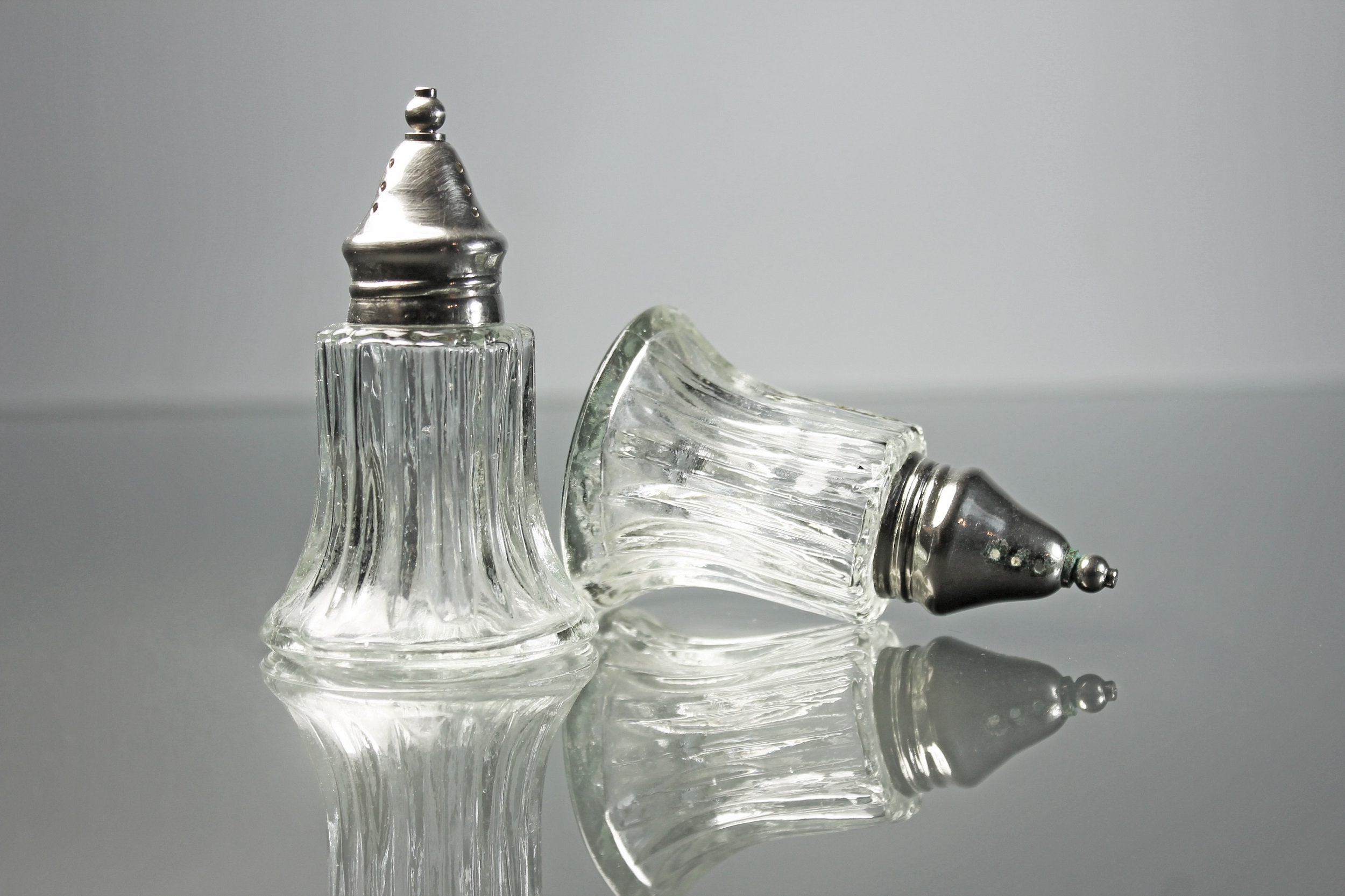 A lovely set of clear glass salt and pepper shakers with silver tops. This set is made of heavy glass and has a ribbed pattern. These would definitely brighten up any special occasion table and are sturdy enough to use every day. They would look wonderful on a buffet, table, or sideboard.