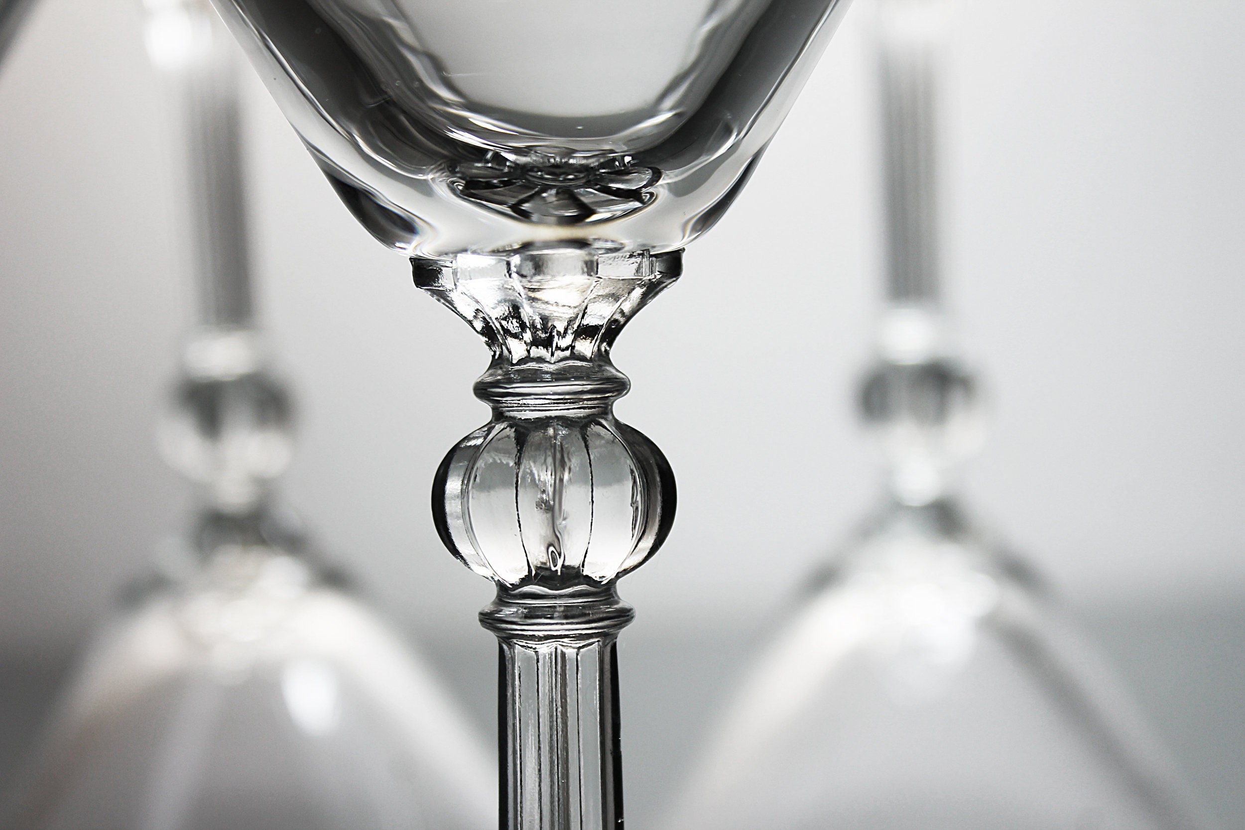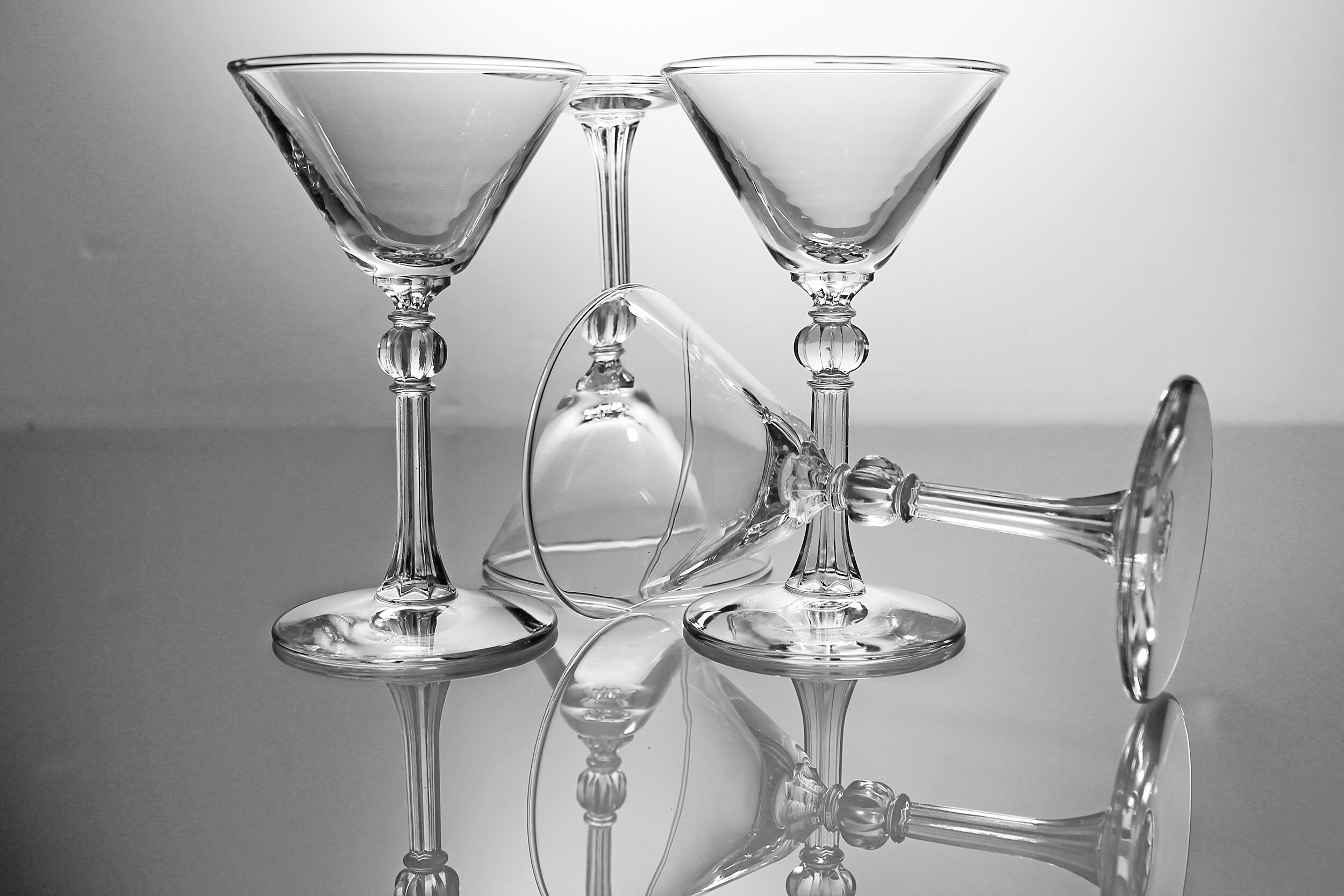 A gorgeous set of four martini glasses by Libbey. The pattern is called Stardust and consists of a clear bowl and ribbed stem with cut ball. The glasses would be great for serving various cocktails or liquors. These would be a beautiful addition to a home bar, they date from the 1940s. Great for parties!