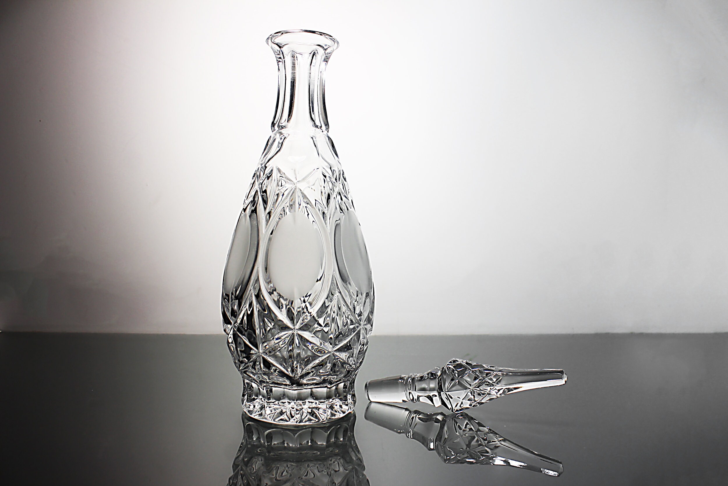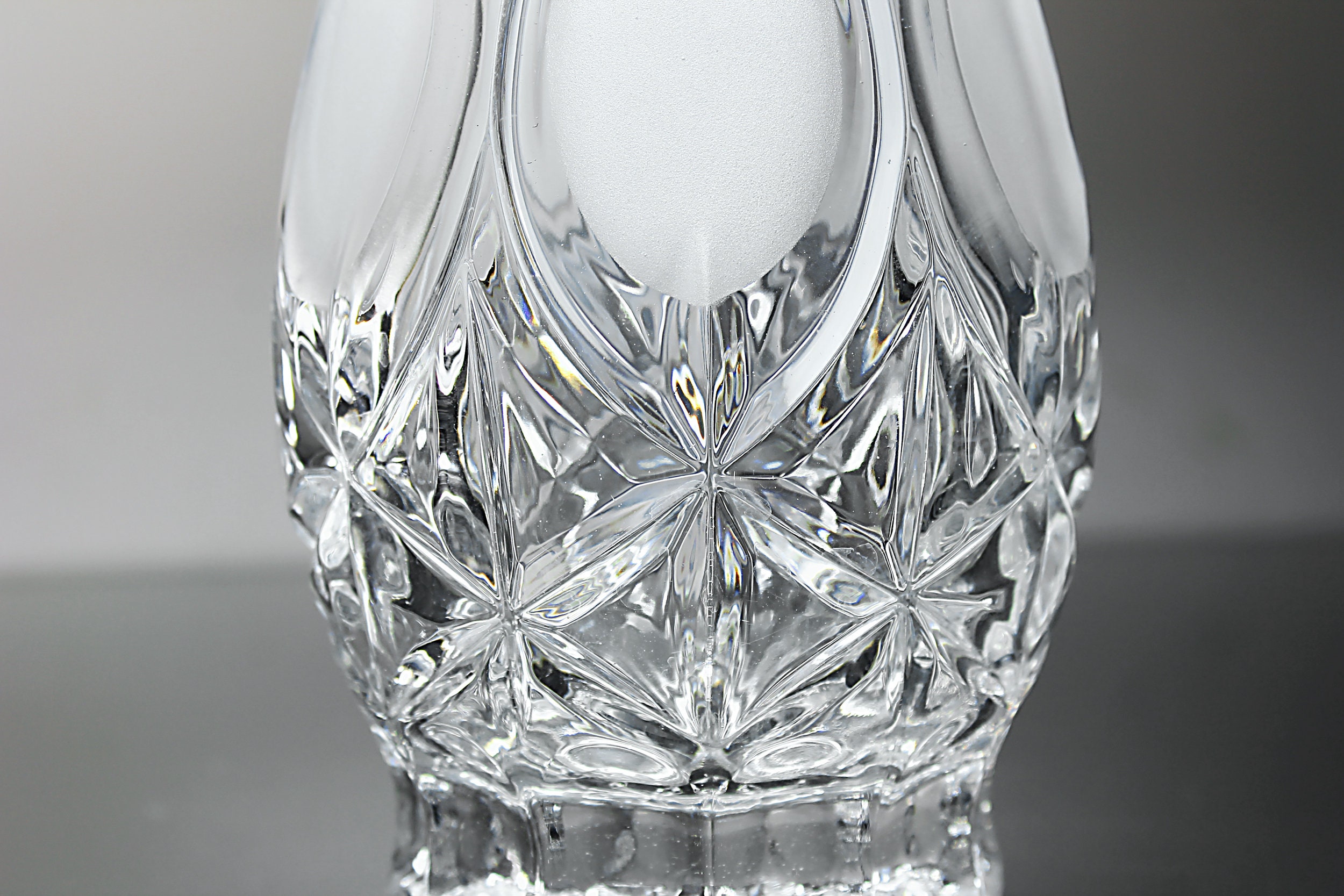 A gorgeous tall decanter by Princess House. The shape of this decanter and its stopper are extremely eye-catching. This decanter has frosted glass ovals which make it easier to hold on to it. It would be a fantastic addition to any home bar or man cave.