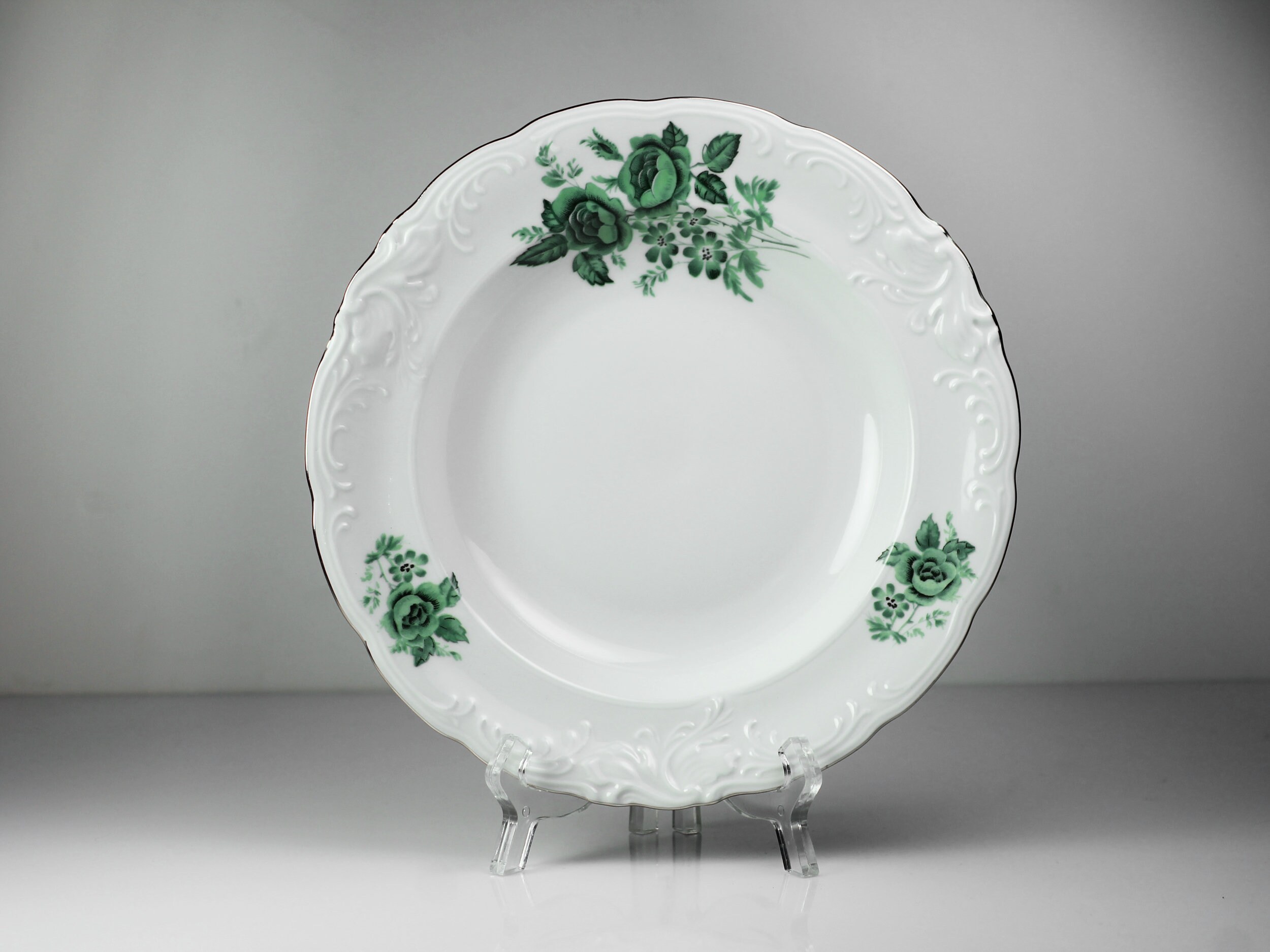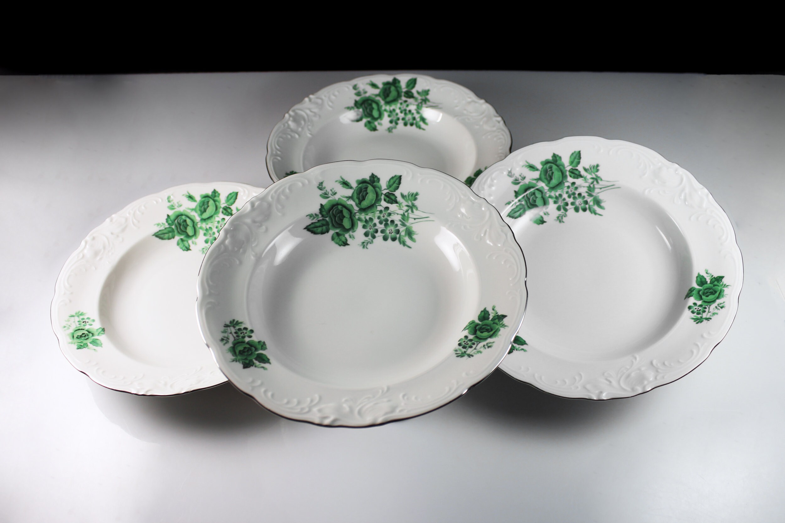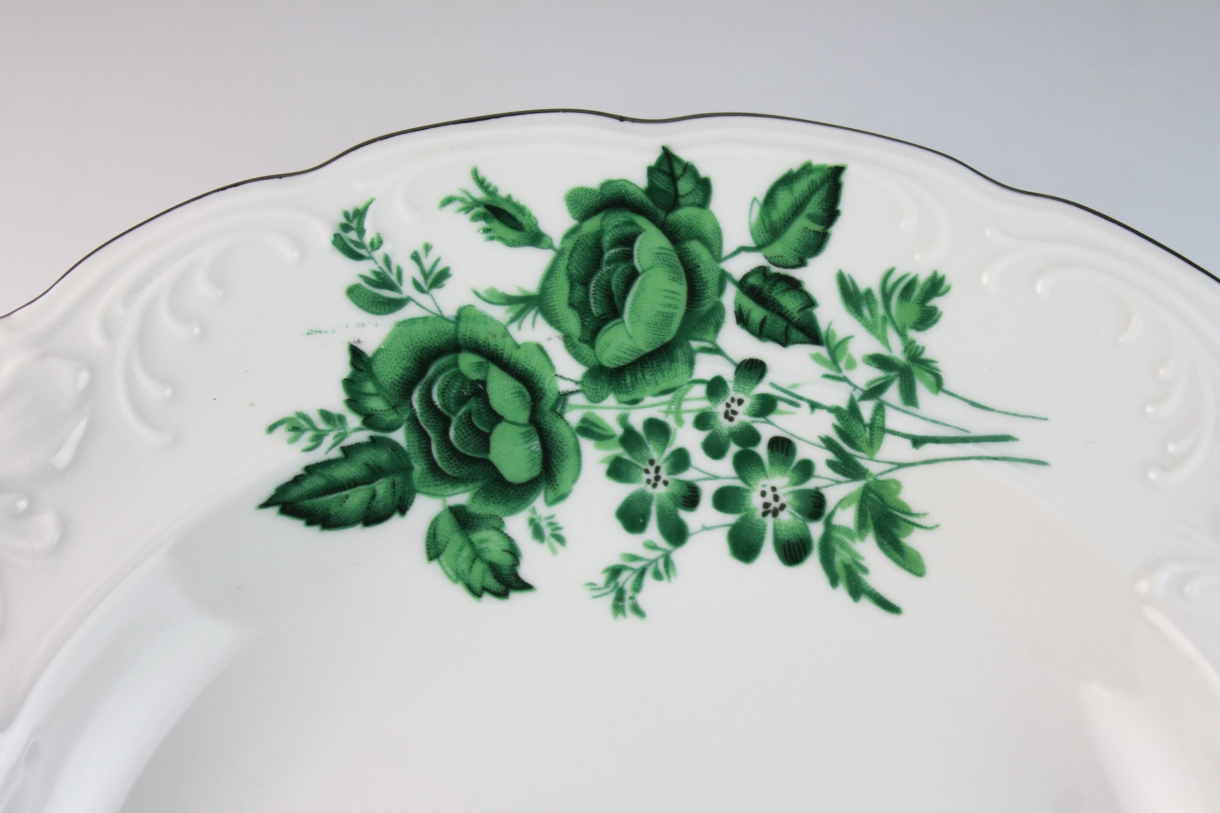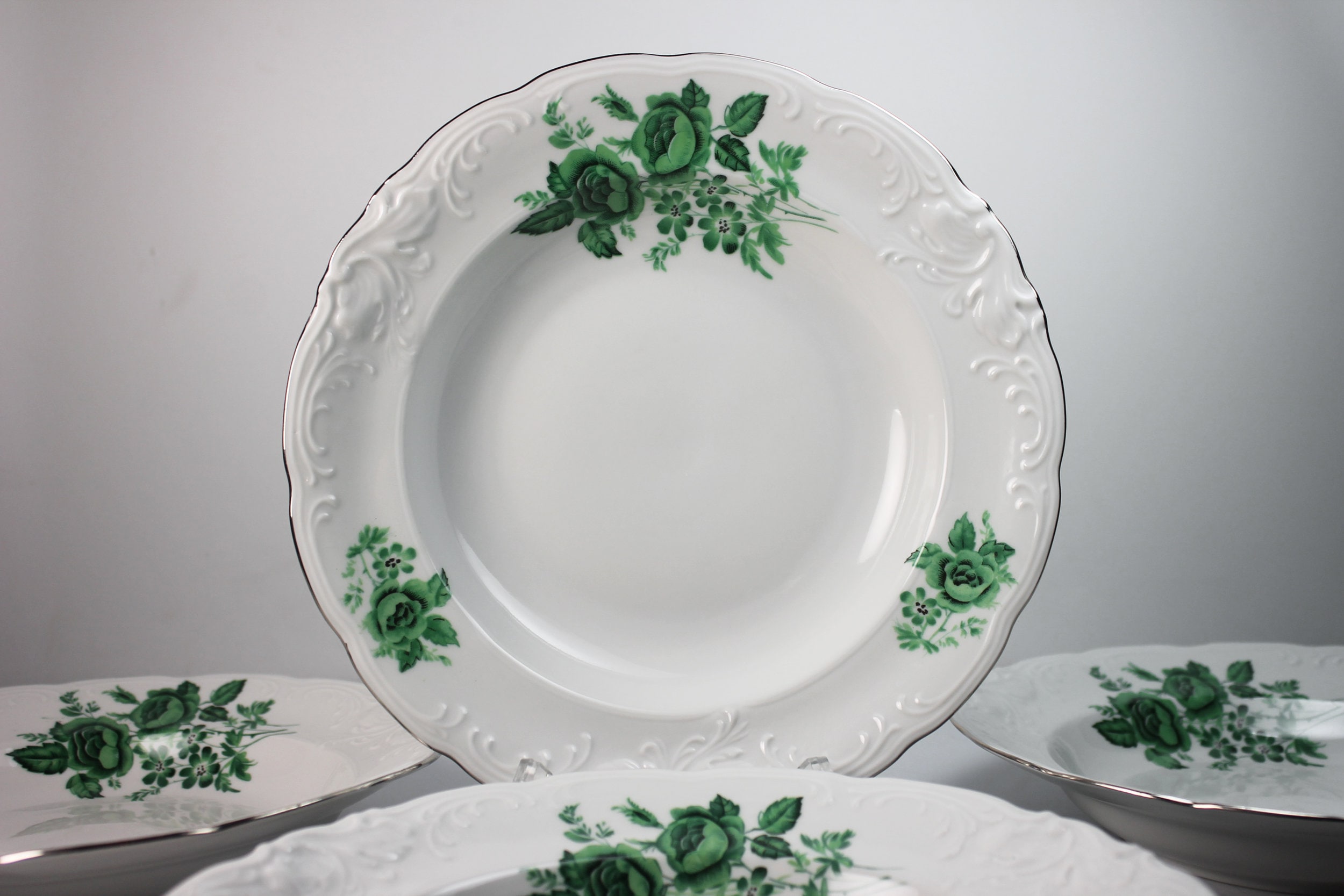 A lovely and elegant set of rim soup bowls by Walbrzych China and made in Poland. The pattern consists of green roses, embossing, and a platinum trim. What an exquisite set of bowls this is with their embossing and platinum trim. Great replacement pieces, start of a set, or to add to a collection.