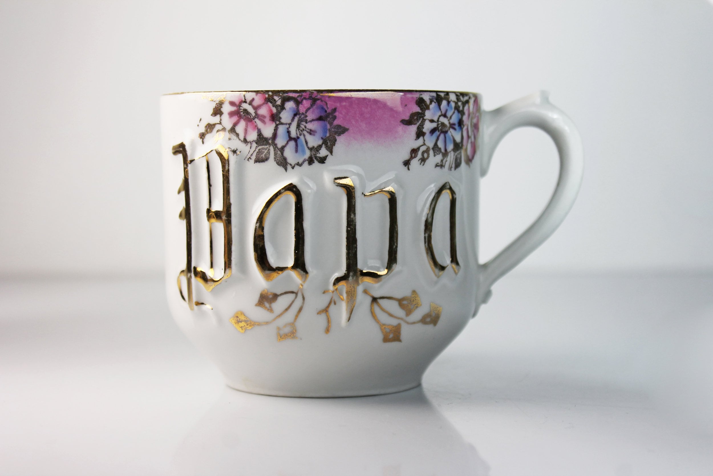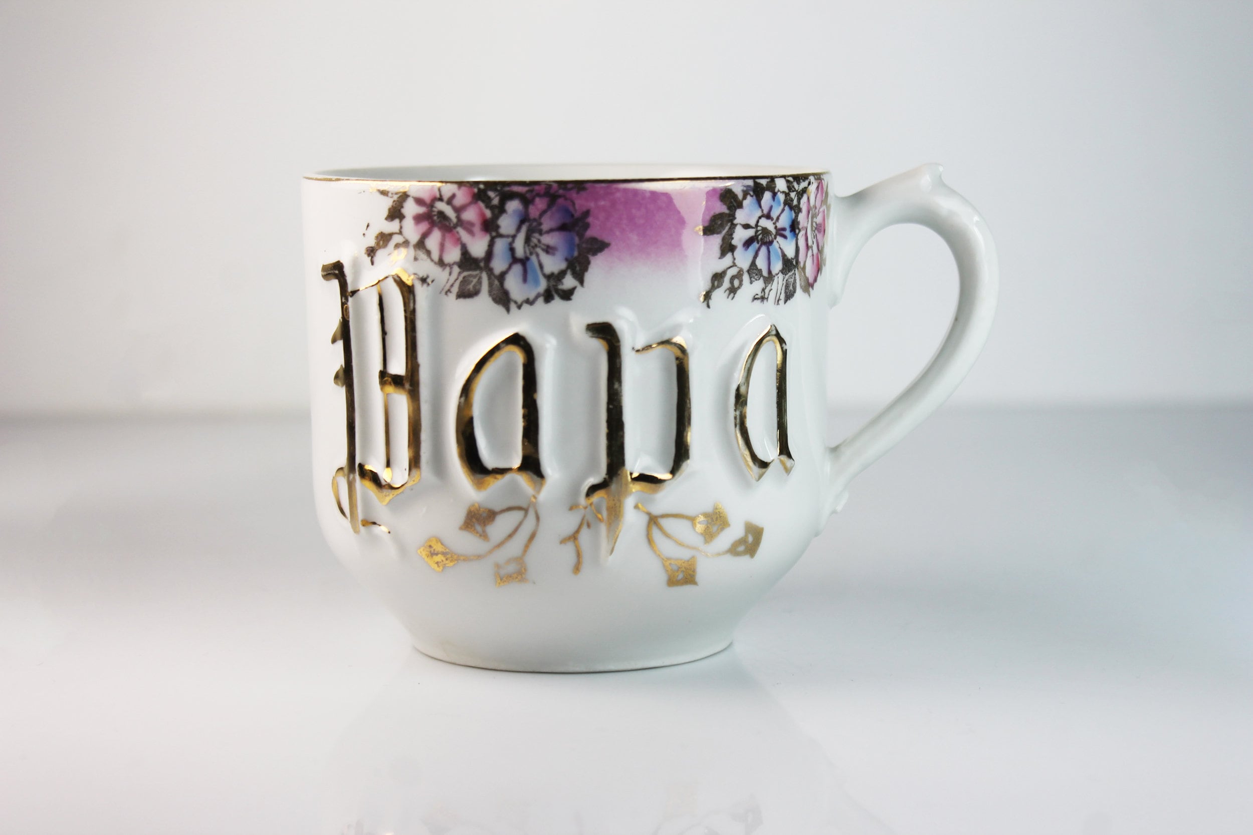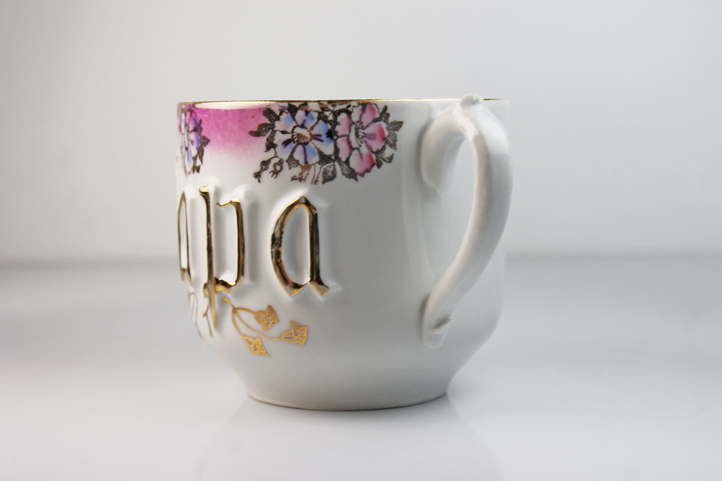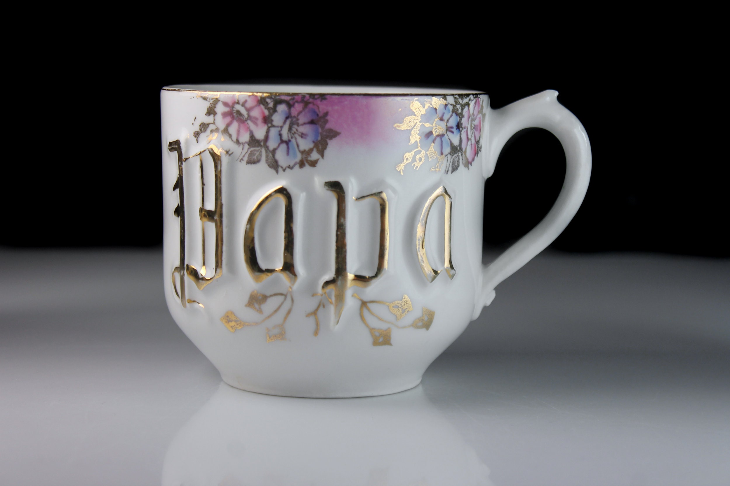 A beautiful antique coffee mug made in Germany. It is white with 'Papa' embossed and outlined with gold on the front along with flowers against a pink background around the rim. The back is plain white. This would be a great gift for a father or grandfather.