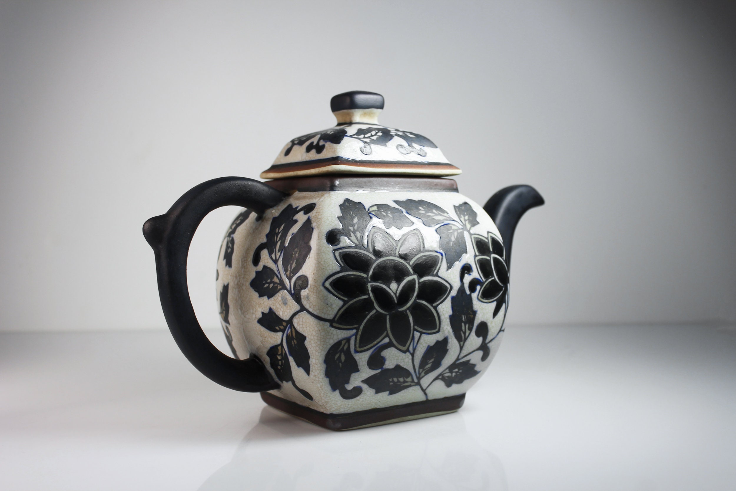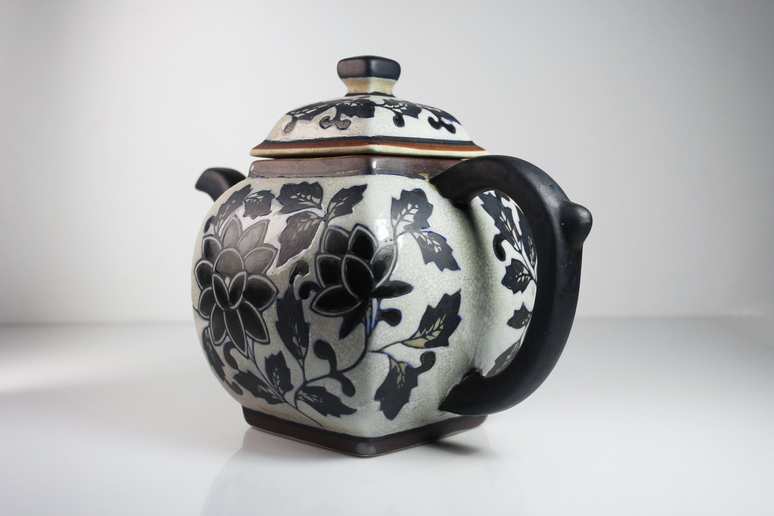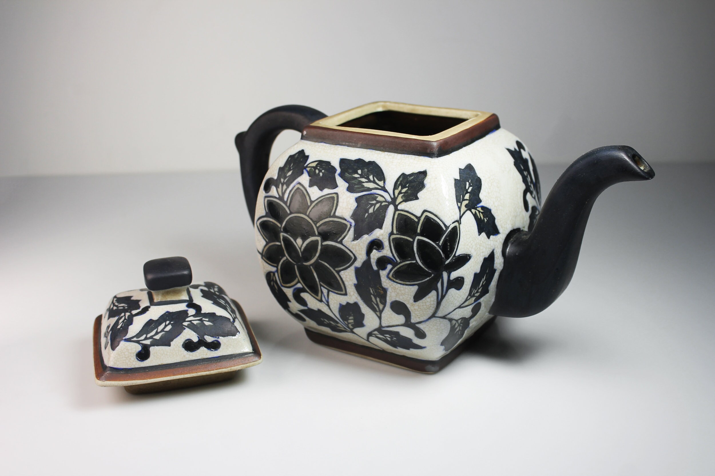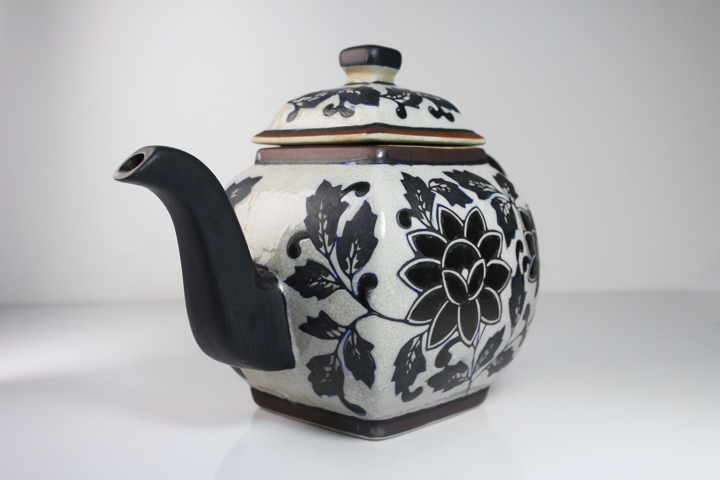 Do you collect teapots, love tea, or just the unique? This charming four cup teapot is for you. The pattern are of black flowers and leaves on a crackle gray background, the handles are a matte black, and the inside is brown with a shiny glaze. The spout pours evenly and with a great flow. This pot is stoneware and as such, is heavy. Just a perfect pot for that great cup of tea. This teapot was made in China and has no brand name.