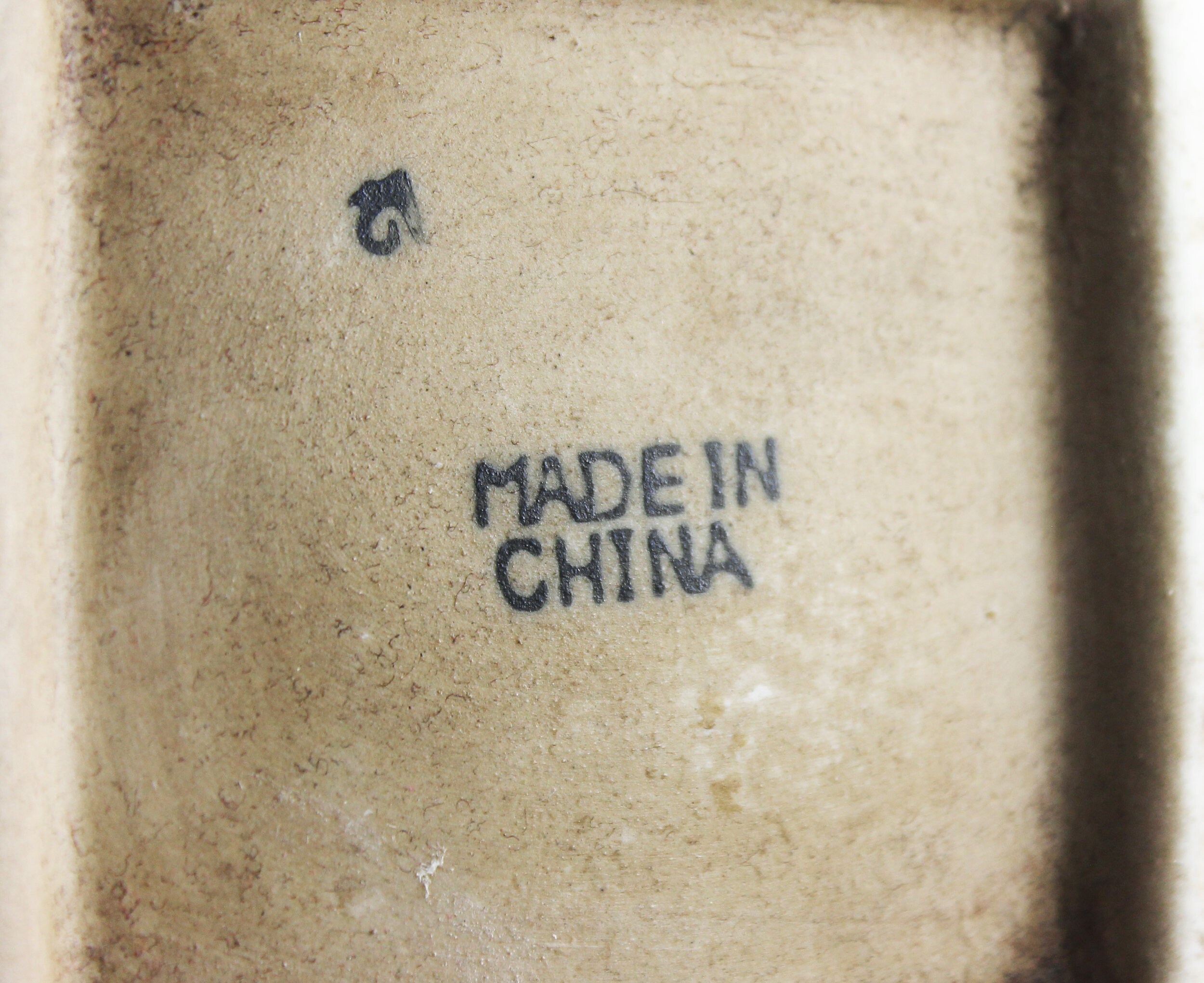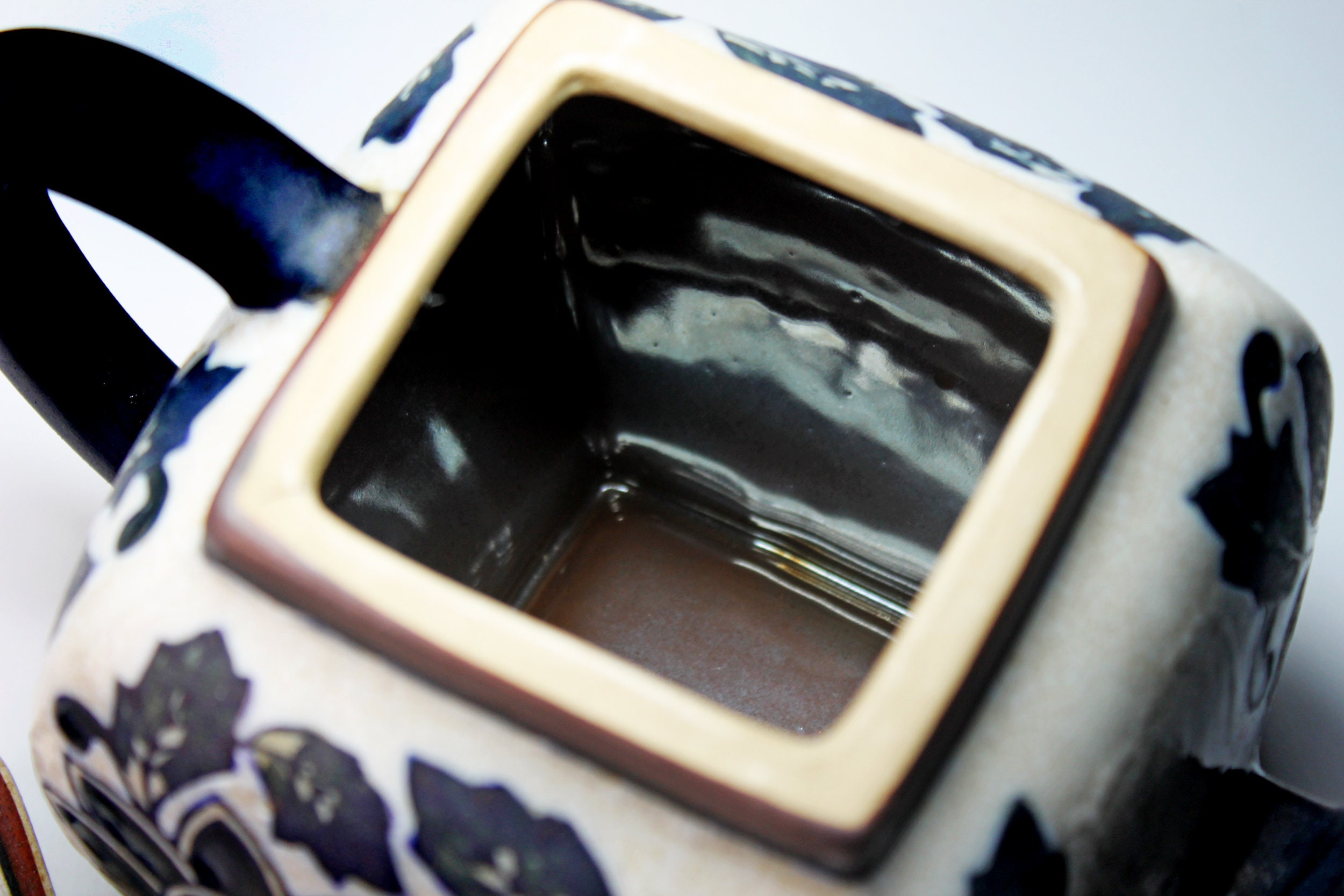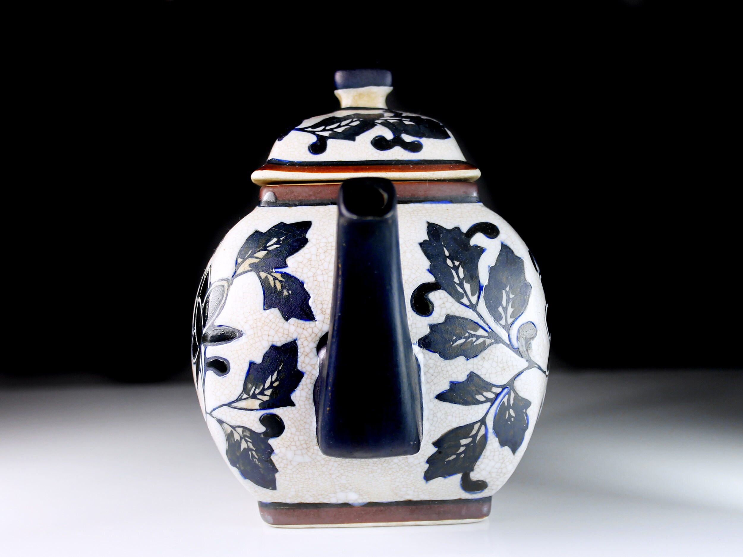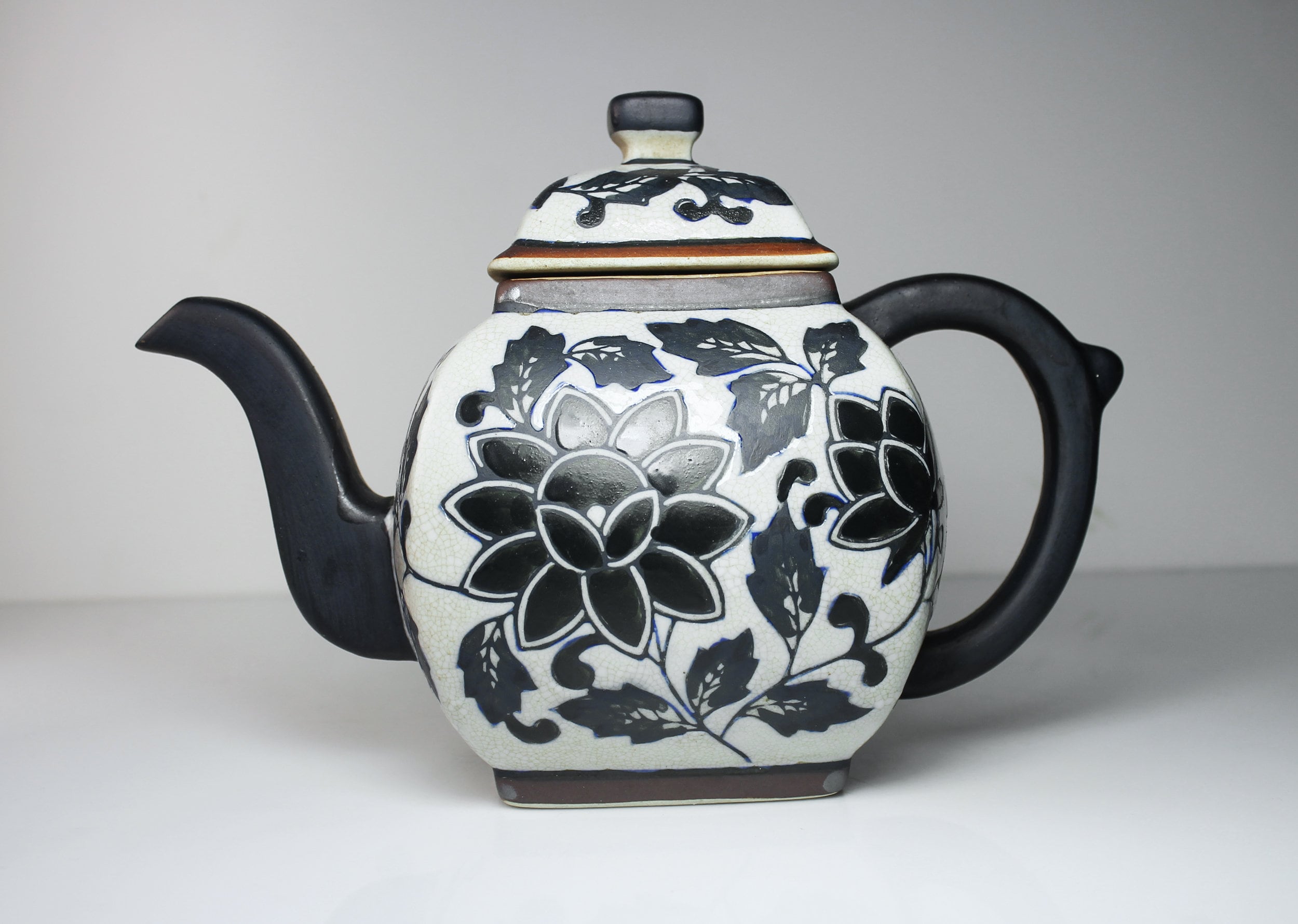 Do you collect teapots, love tea, or just the unique? This charming four cup teapot is for you. The pattern are of black flowers and leaves on a crackle gray background, the handles are a matte black, and the inside is brown with a shiny glaze. The spout pours evenly and with a great flow. This pot is stoneware and as such, is heavy. Just a perfect pot for that great cup of tea. This teapot was made in China and has no brand name.