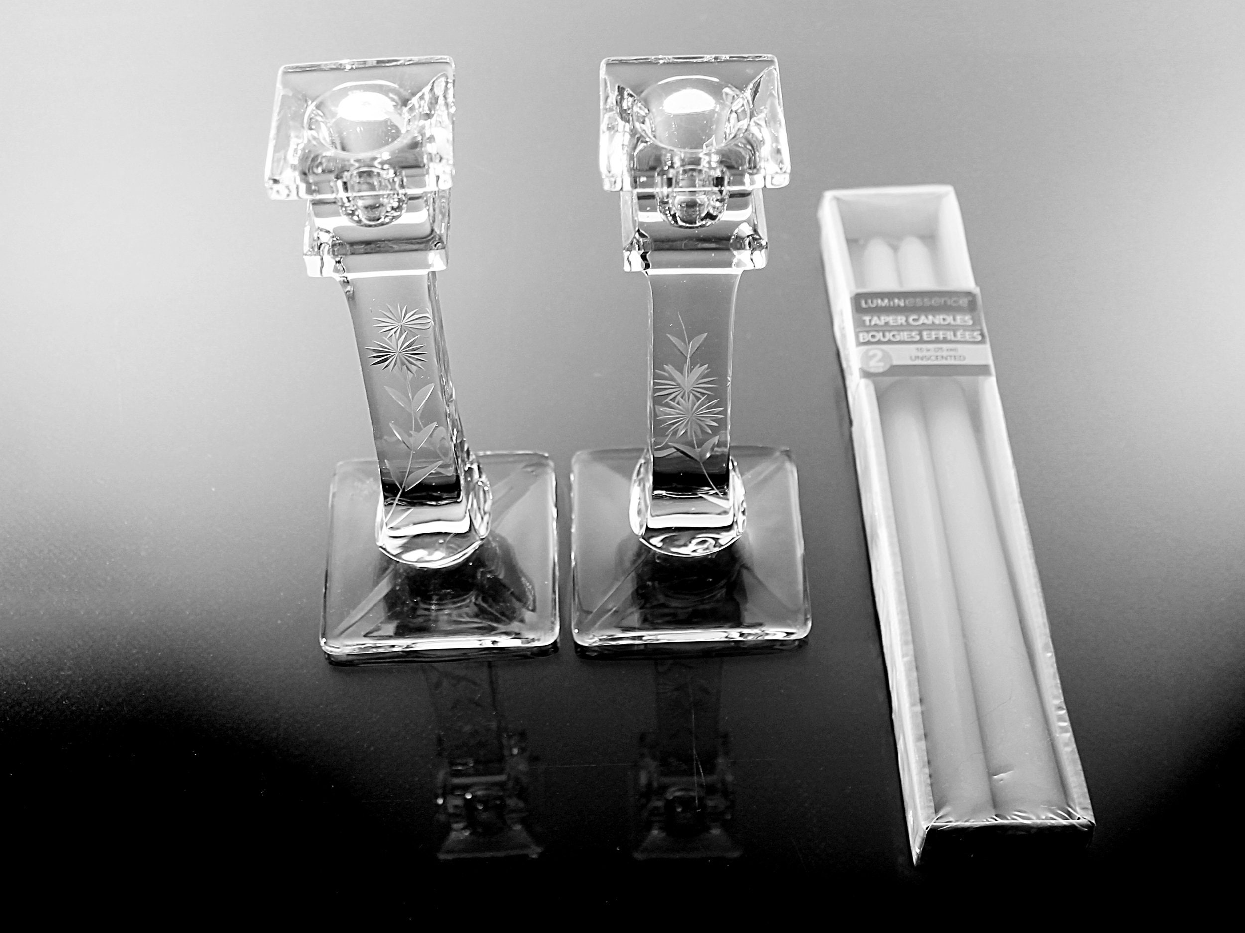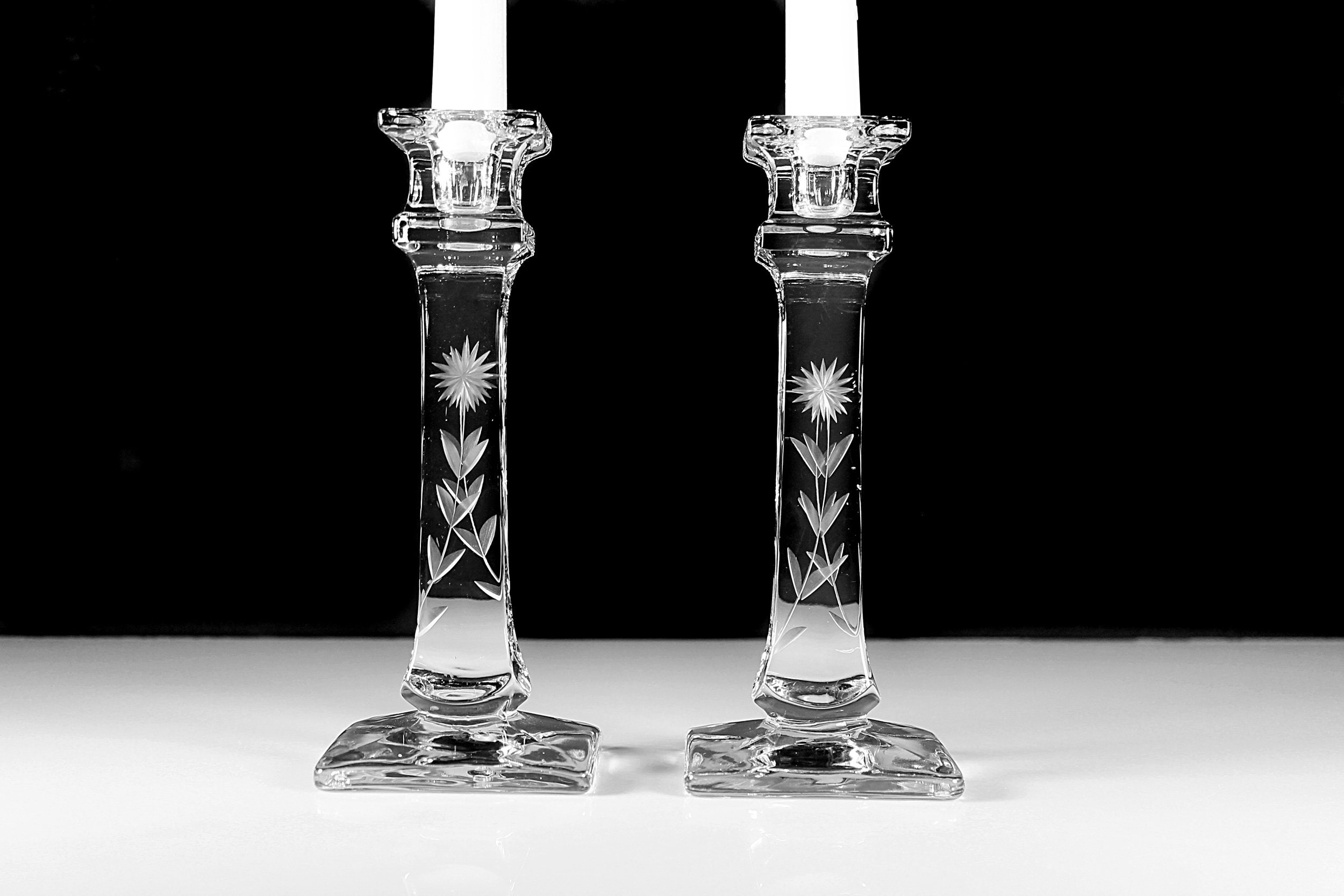 Antique Etched Crystal Candlesticks, American Brilliant, 8 Inch, Candle Holders, Pair, Clear Glass, White Taper Candles Included