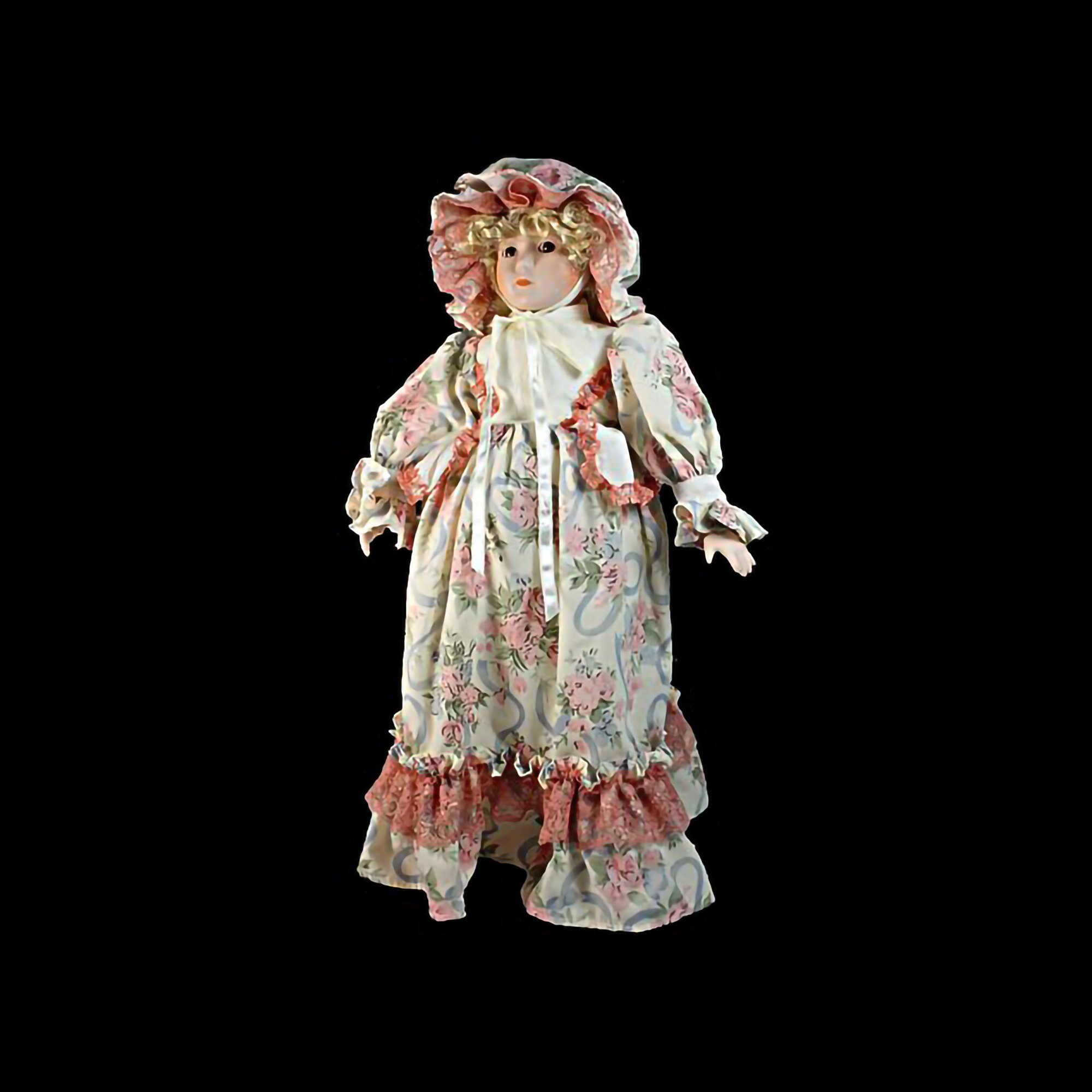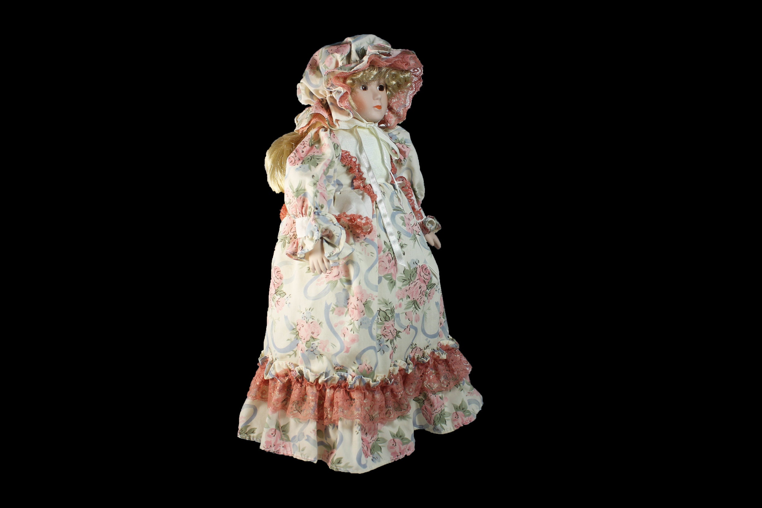 A lovely porcelain doll in a lovely rose print dress with lots of lace. She has a matching bonnet, blonde curly hair, and brown eyes. Her head, hands, and feet are porcelain. What a great doll to add to a collection.