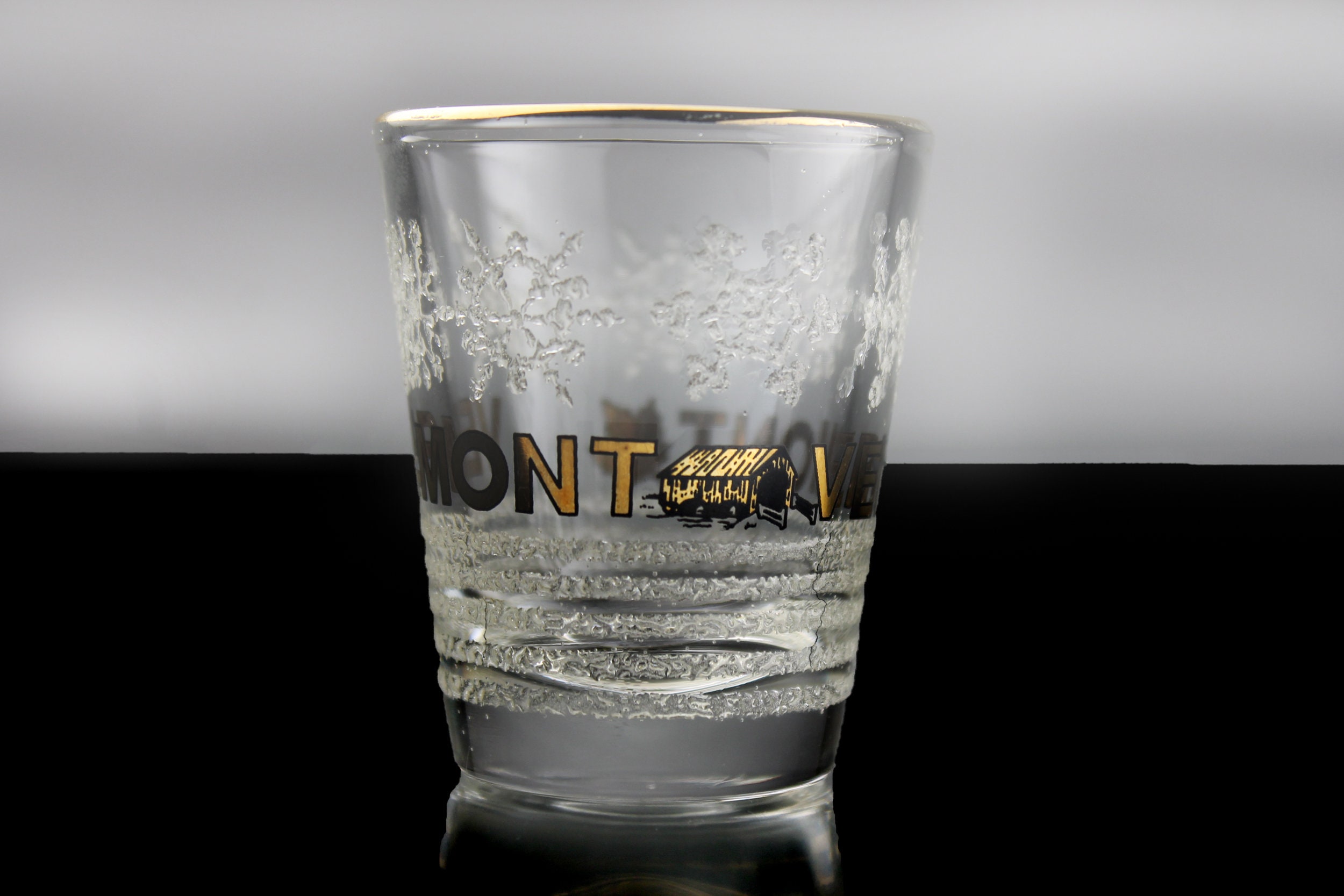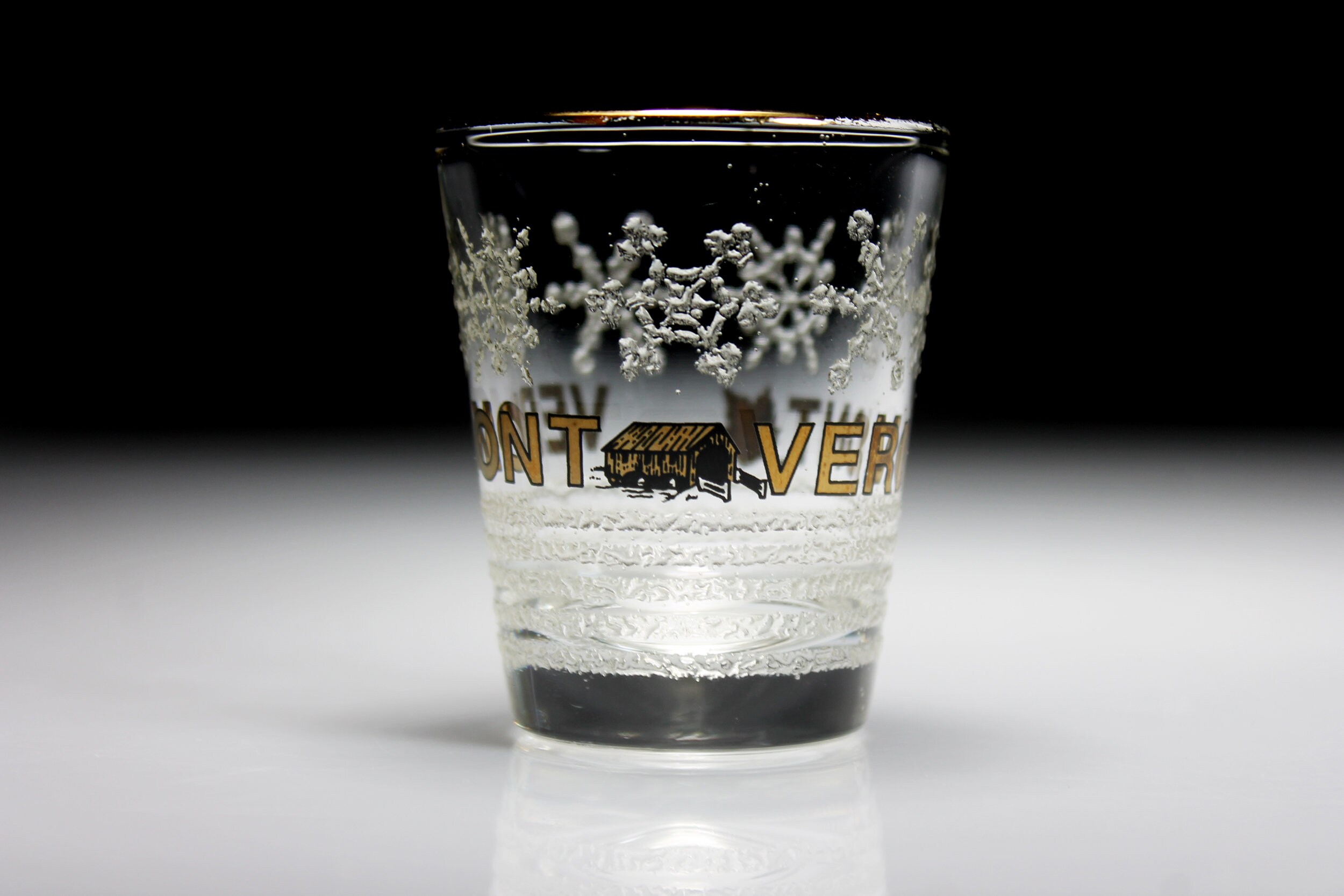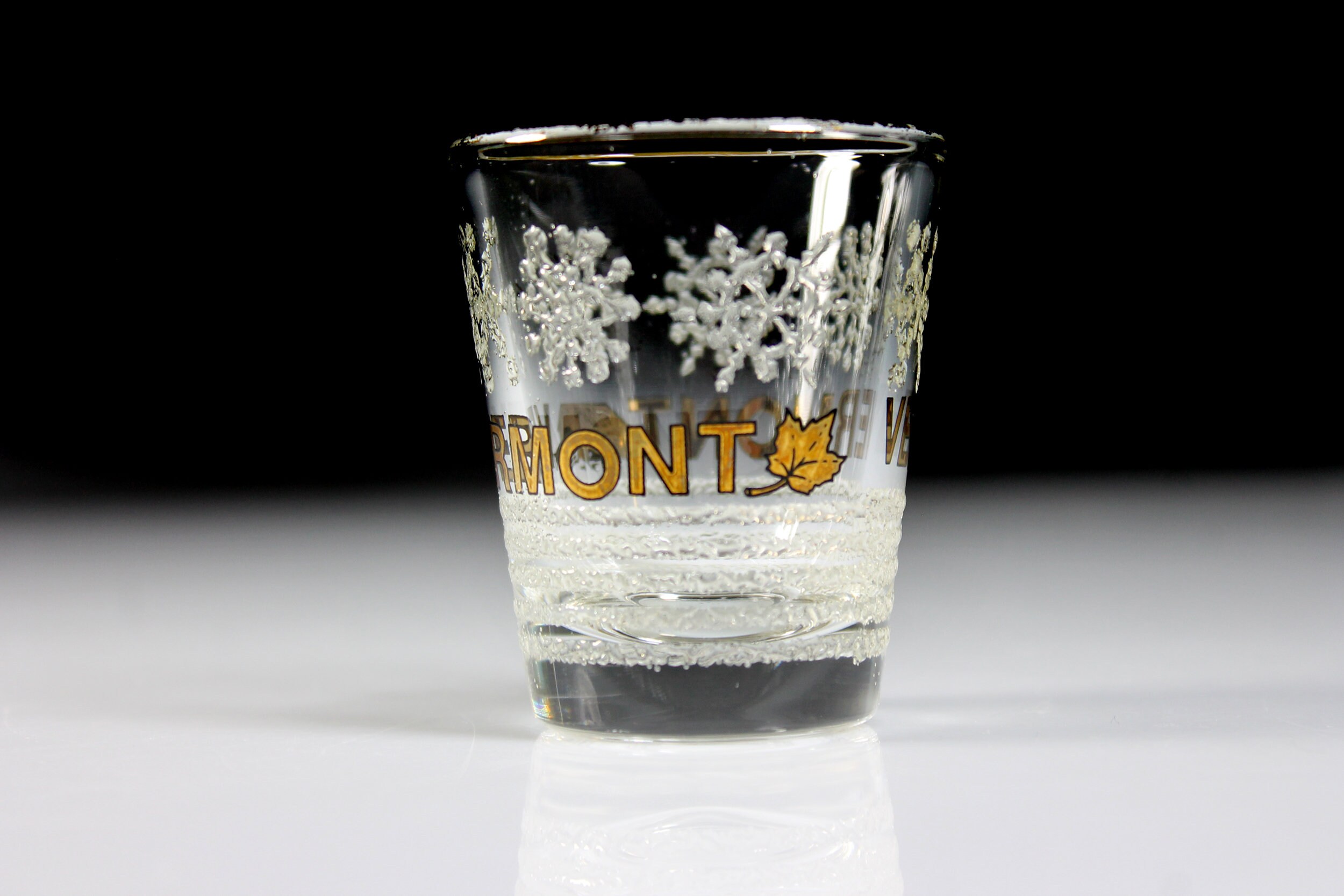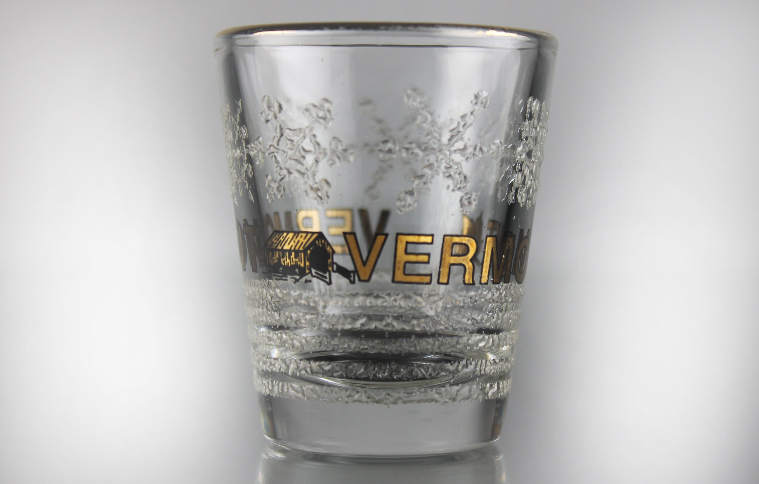 A beautiful souvenir shot glass from Vermont. It is clear glass with 'VERMONT' in gold in the center with embossed snowflakes above and an embossed snow field underneath. If you are collecting shot glasses for your home bar, or from each state, then this is for you. It would also make a great gift for a lover of Vermont or of shot glasses.