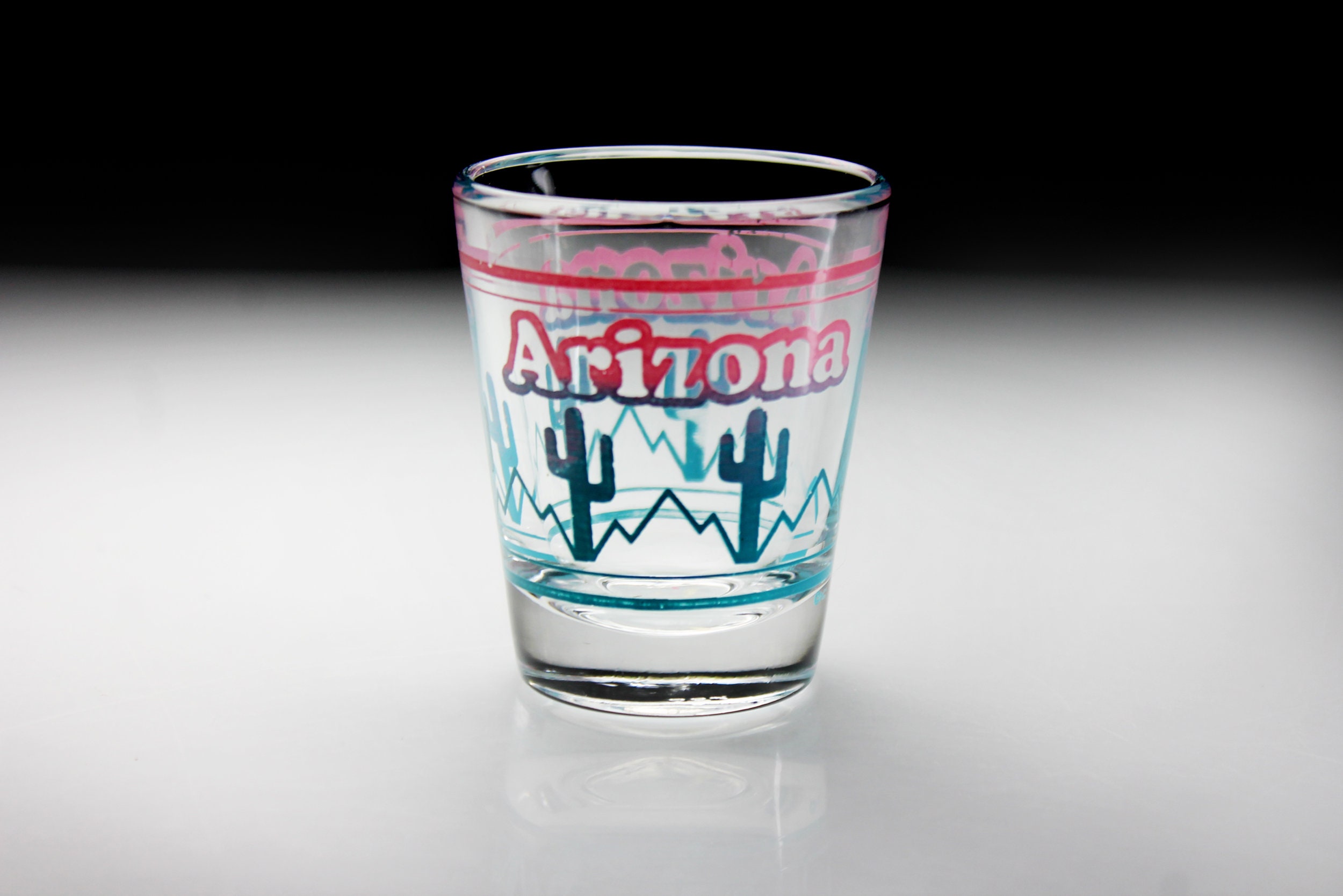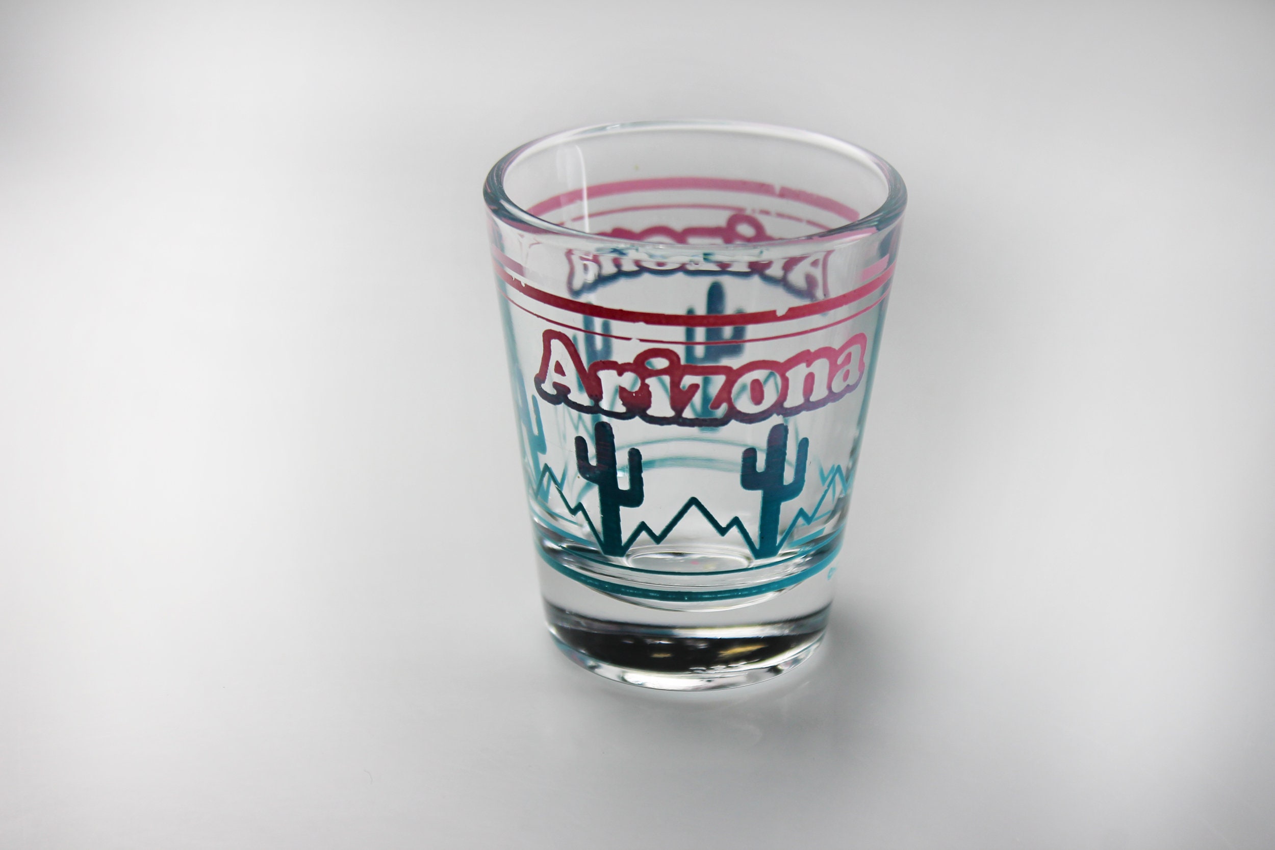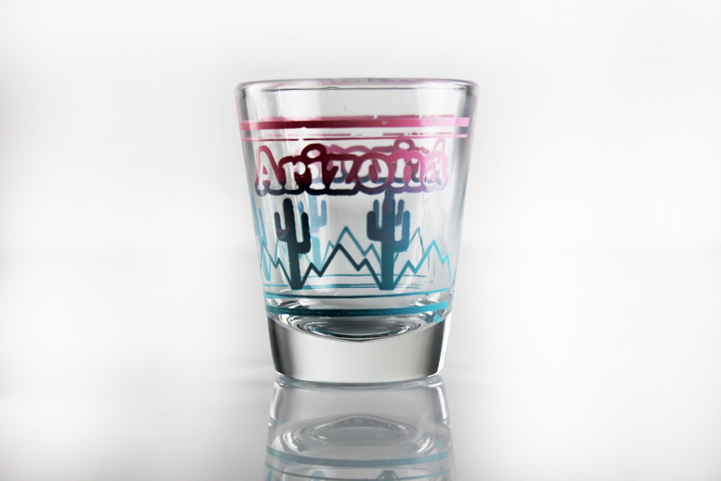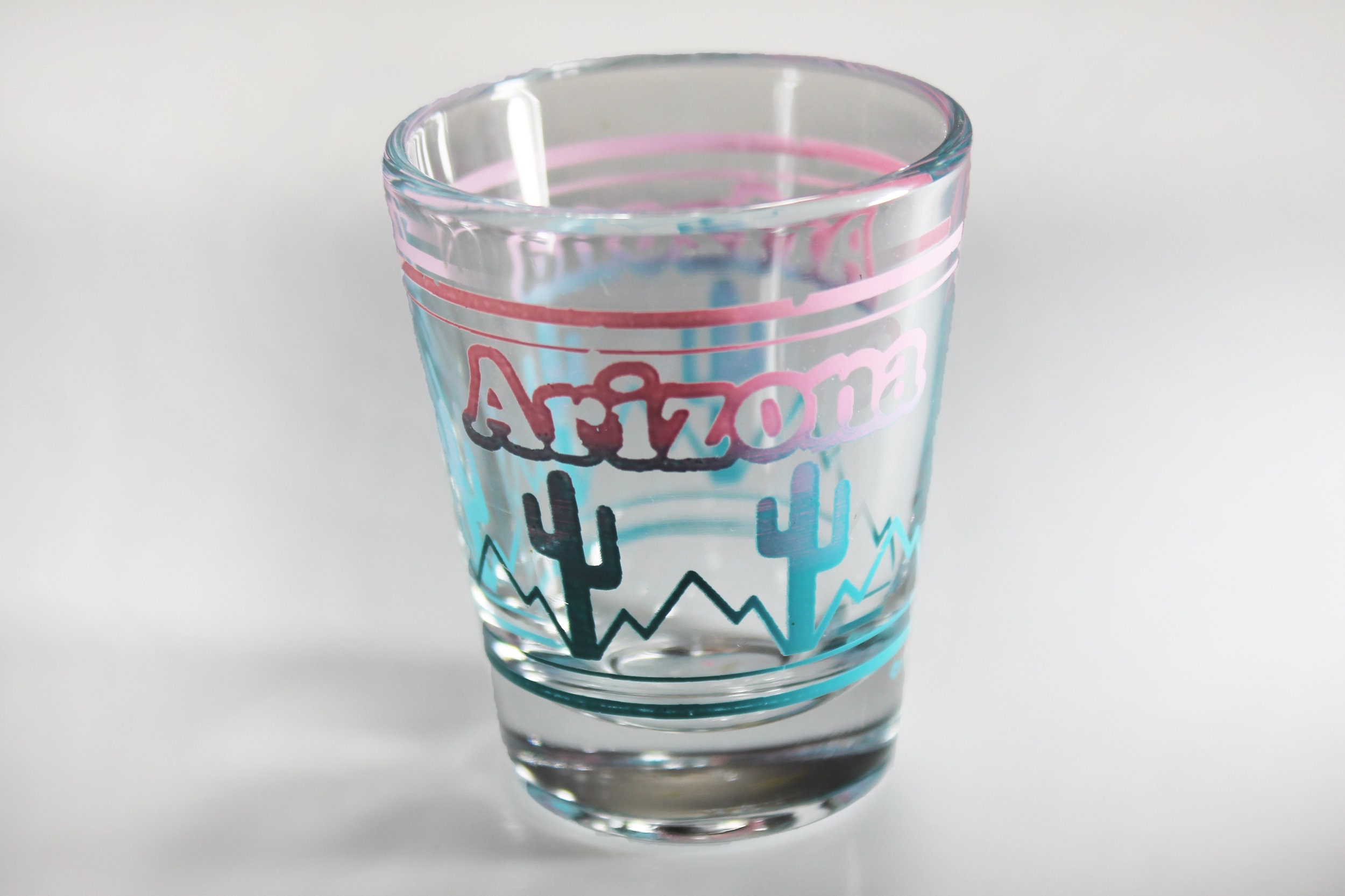 A beautiful souvenir shot glass from Arizona. It is clear glass with 'Arizona' in Pink and a cactus fading from pink to blue. If you are collecting shot glasses for your home bar, or from each state, then this is for you. It would also make a great gift for a lover of Arizona or of shot glasses.