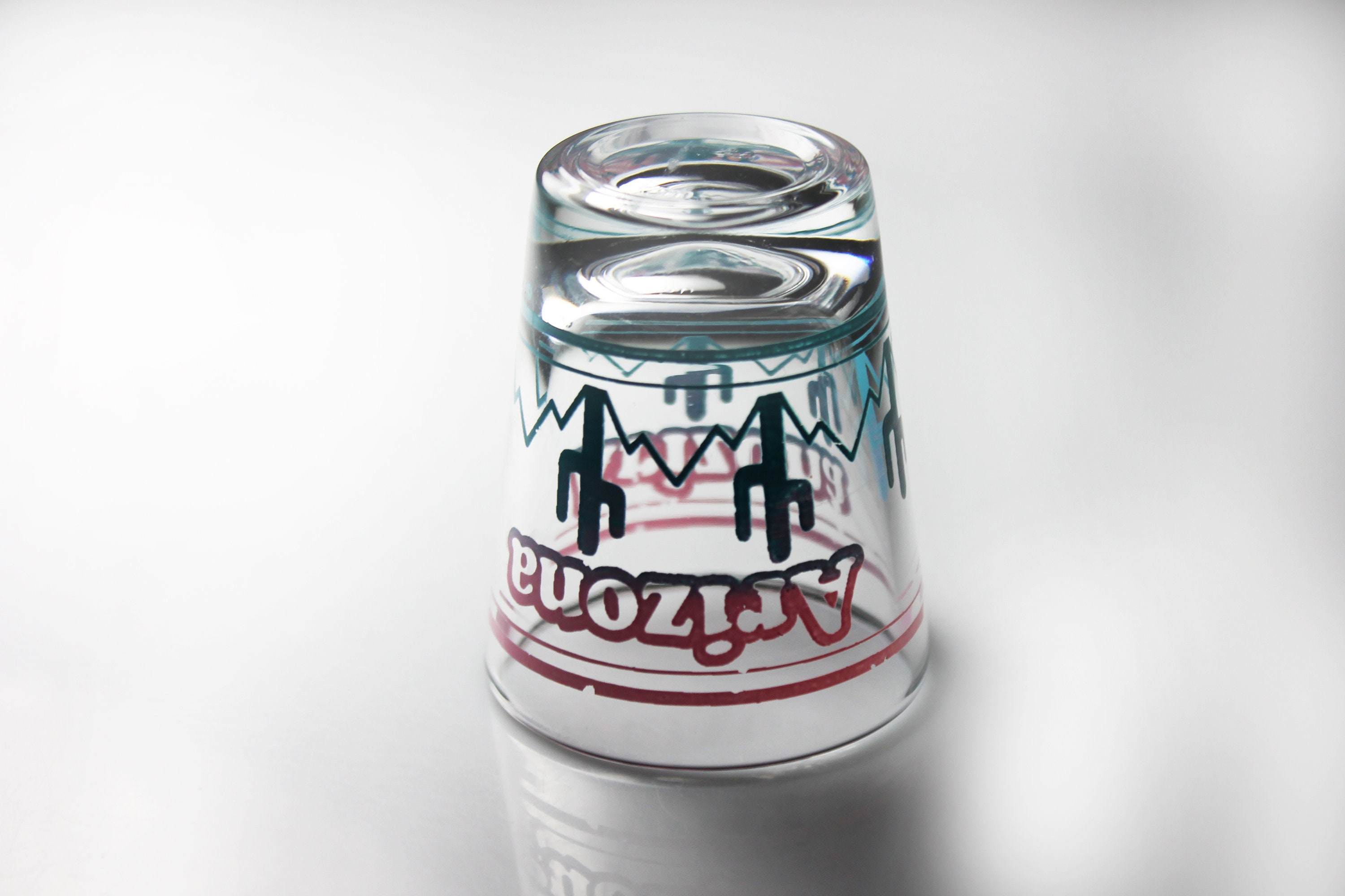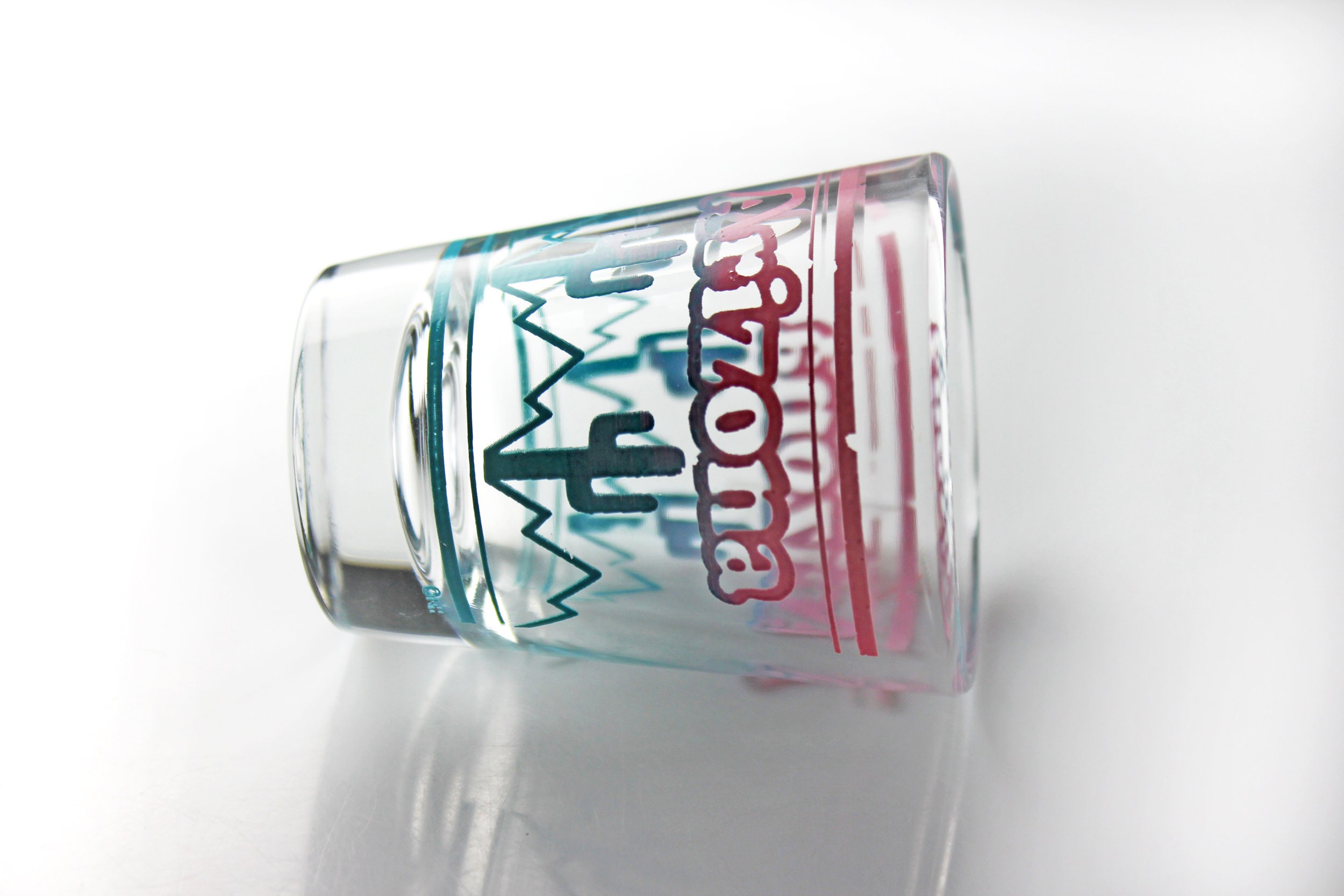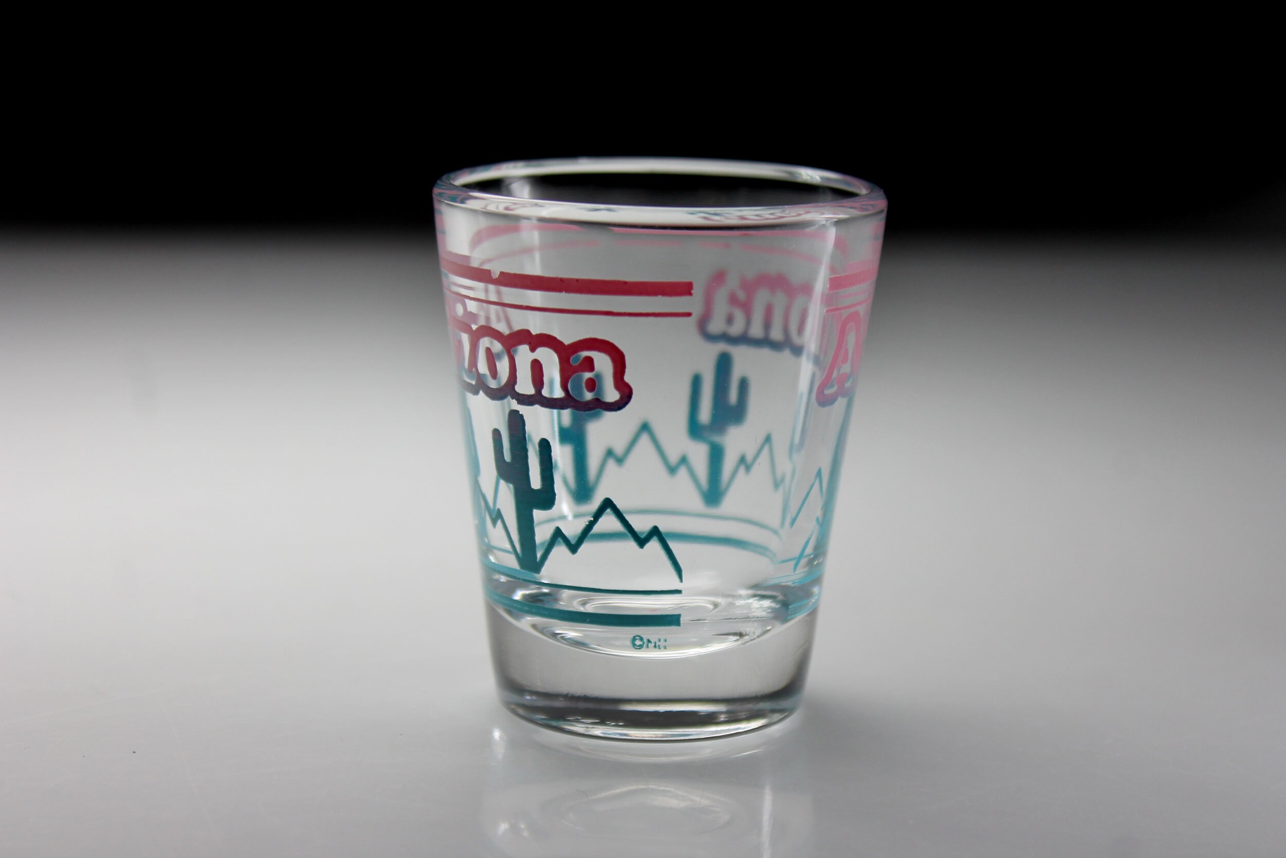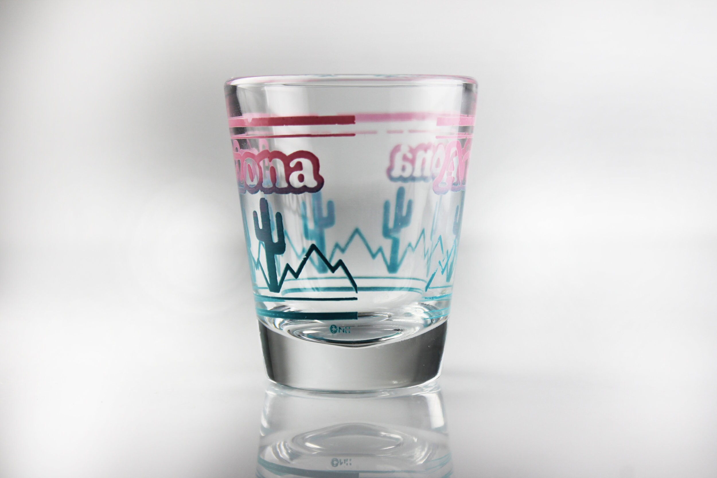 A beautiful souvenir shot glass from Arizona. It is clear glass with 'Arizona' in Pink and a cactus fading from pink to blue. If you are collecting shot glasses for your home bar, or from each state, then this is for you. It would also make a great gift for a lover of Arizona or of shot glasses.