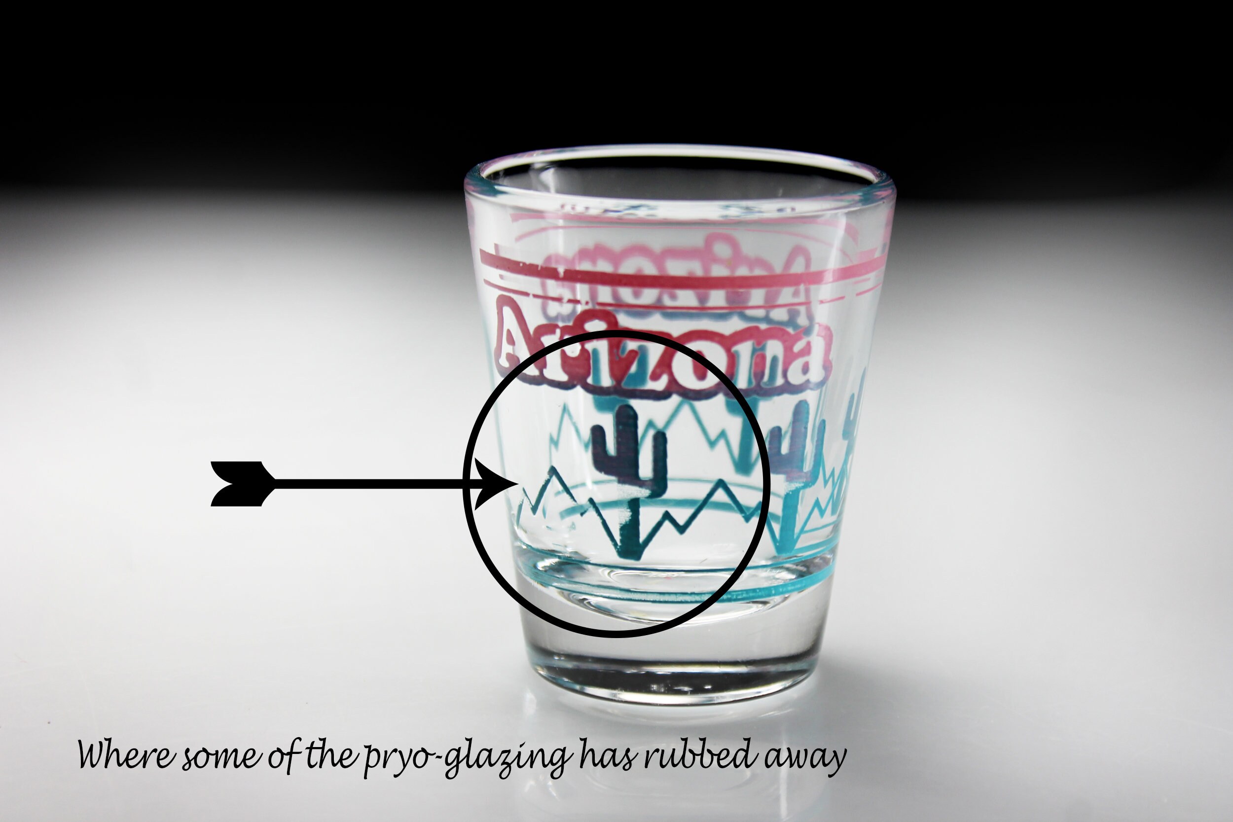 Souvenir Shot Glass, Arizona, Cactus, Clear Glass, Pryo-Glazed, Collectible, Barware