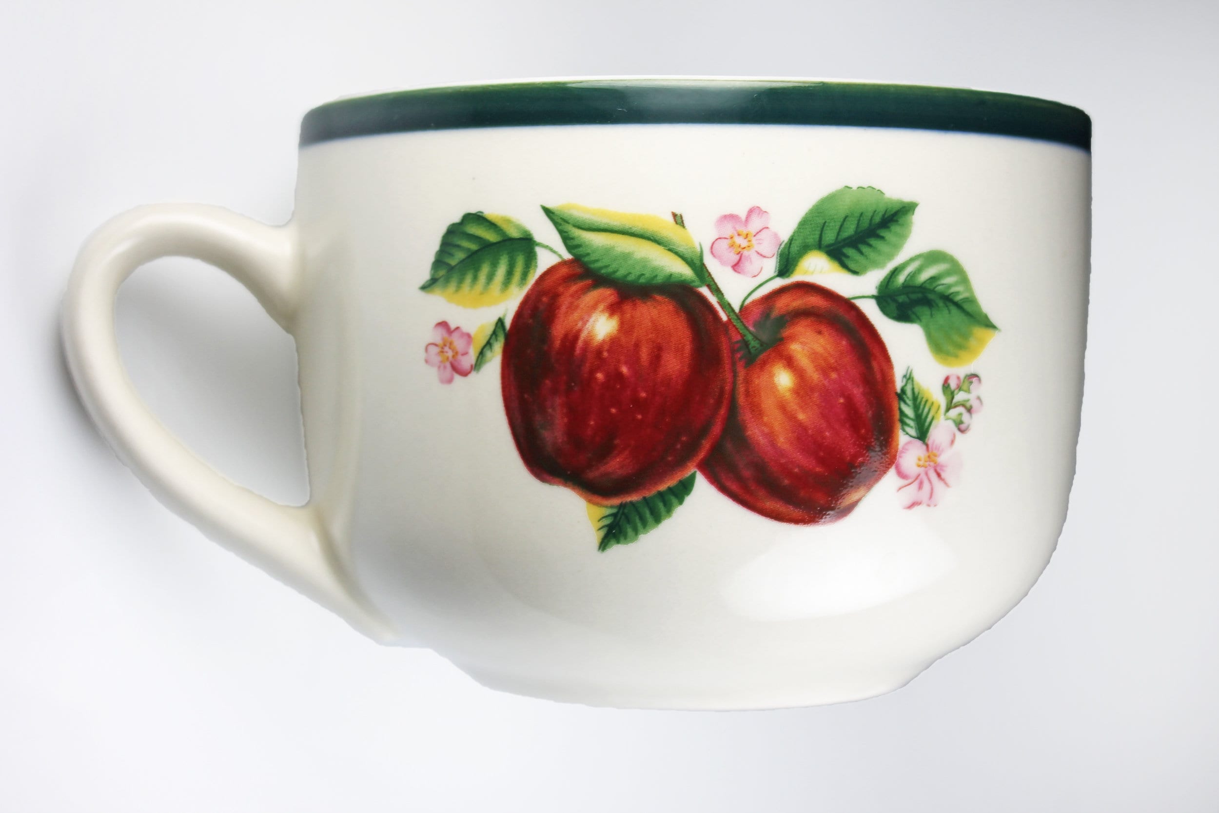 A wonderful set of four jumbo mugs by China Pearl. The pattern is called Casuals and consists of apples and pink flowers on the sides and a green band on the rim. These would also make great soup, stew, or chili bowls with a handle making them easy to carry to the patio, porch, or veranda. A must have for every kitchen as these are very versatile. A great idea for the coffee lover too.