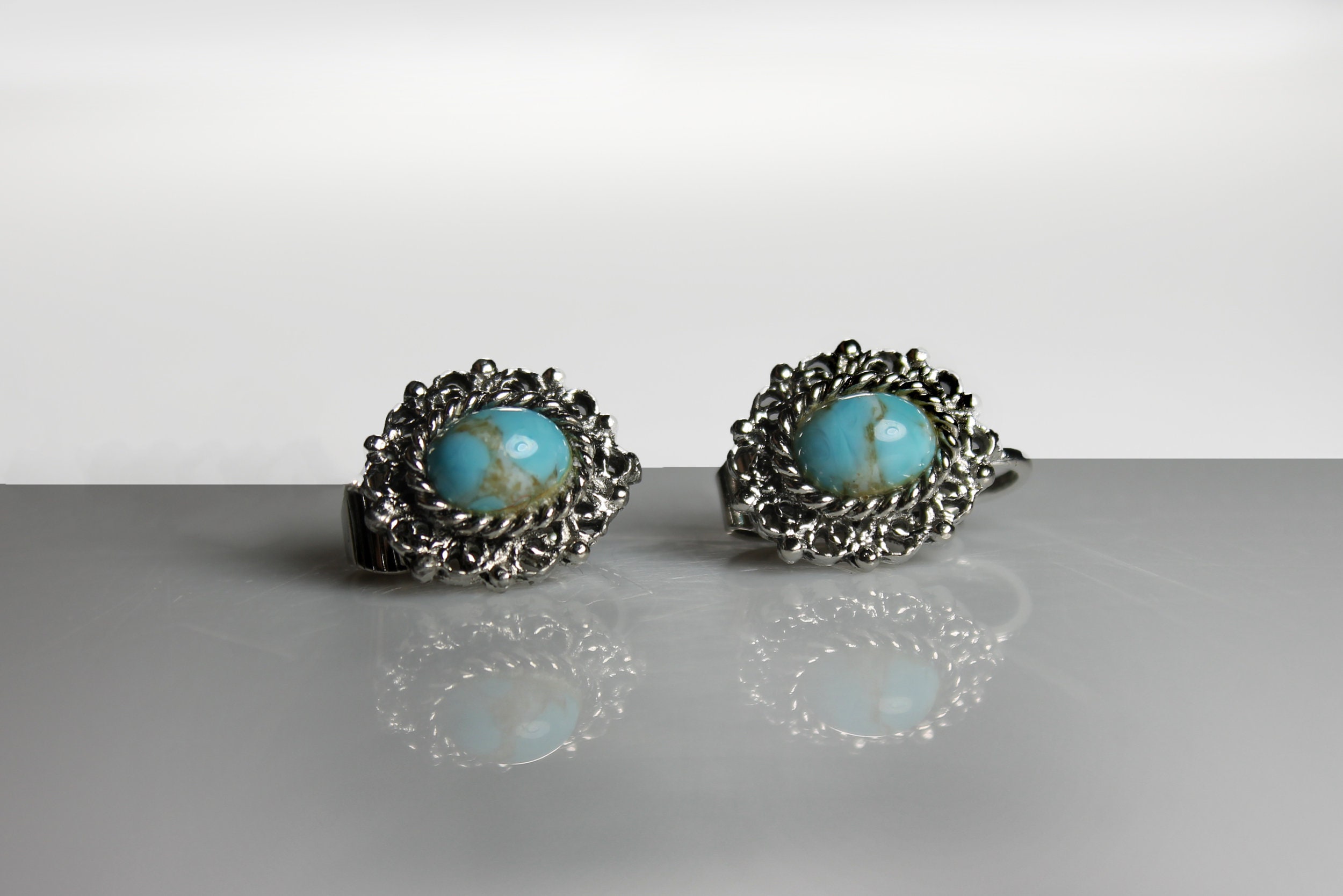 A beautiful set of small clip-on earrings. Maker is unknown. The turquoise stone is set in the middle of an ornate silver oval. What a wonderful gift for a lover of turquoise jewelry.