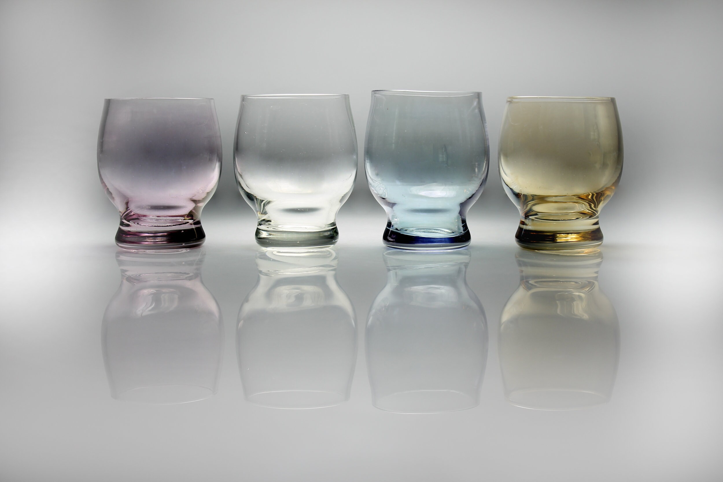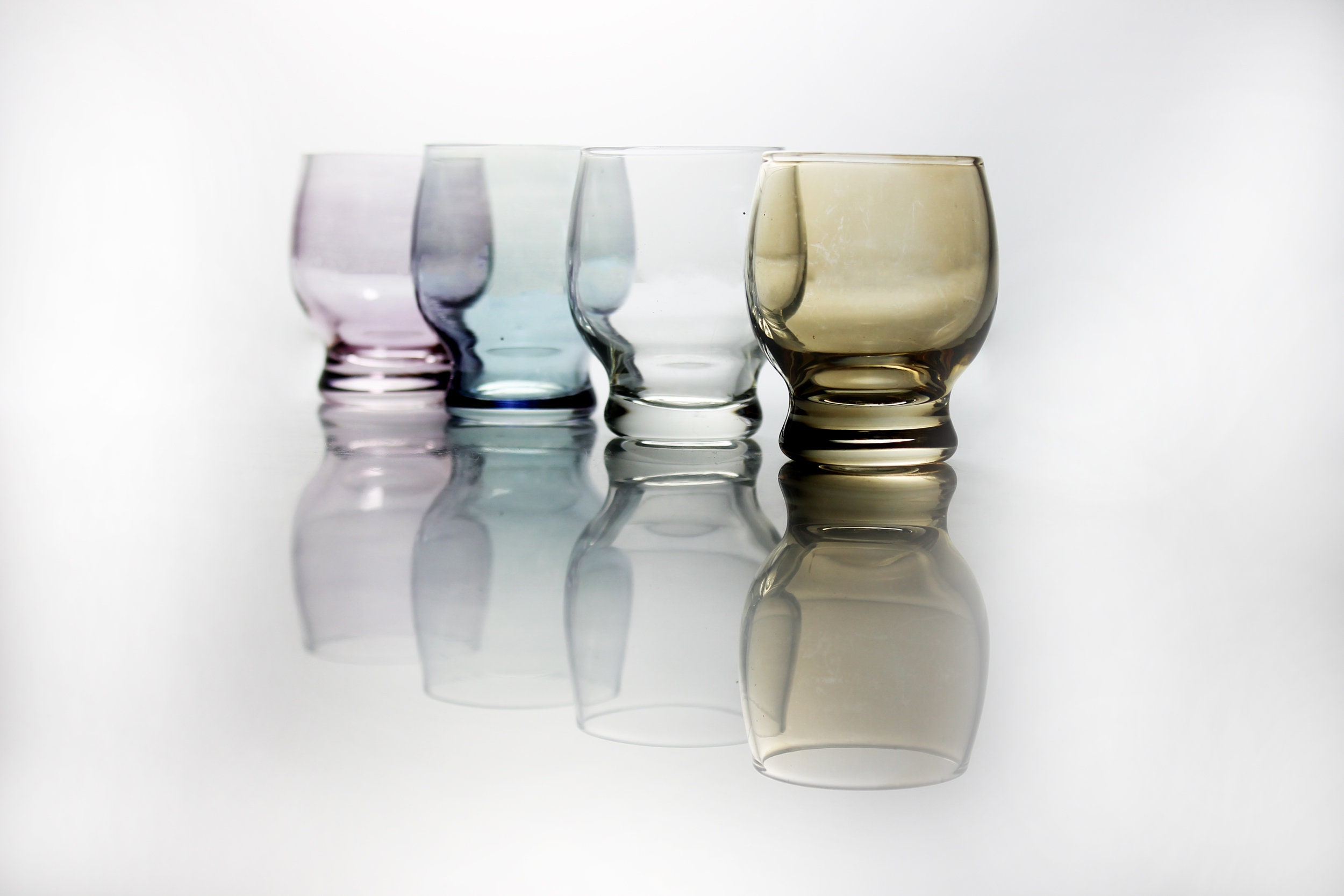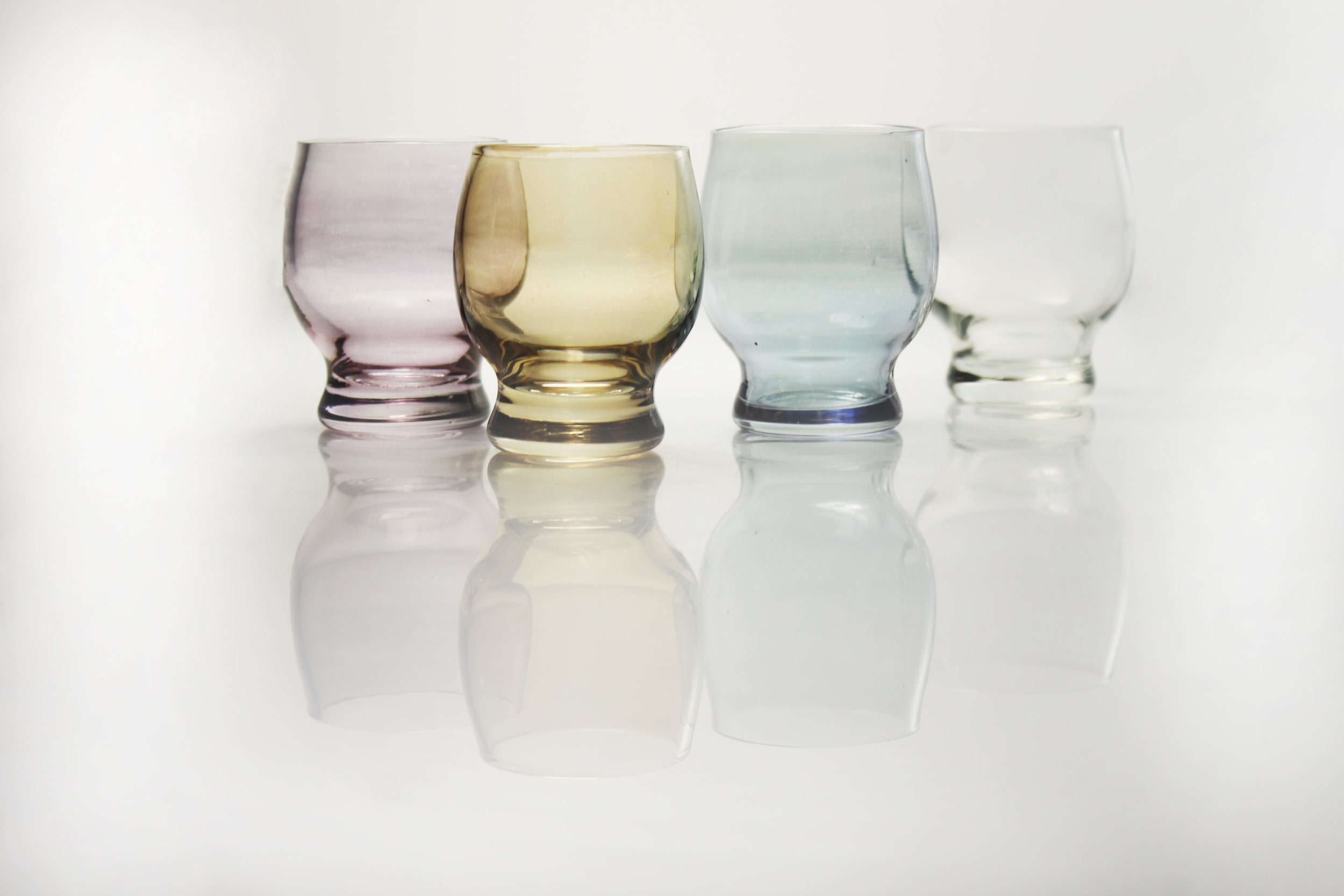 A wonderful set of four shot glasses. There are one each of yellow, blue, purple and clear. They would be great in any home bar or man cave. They would look great in front of a mirror with a light on them. A wonderful gift idea.