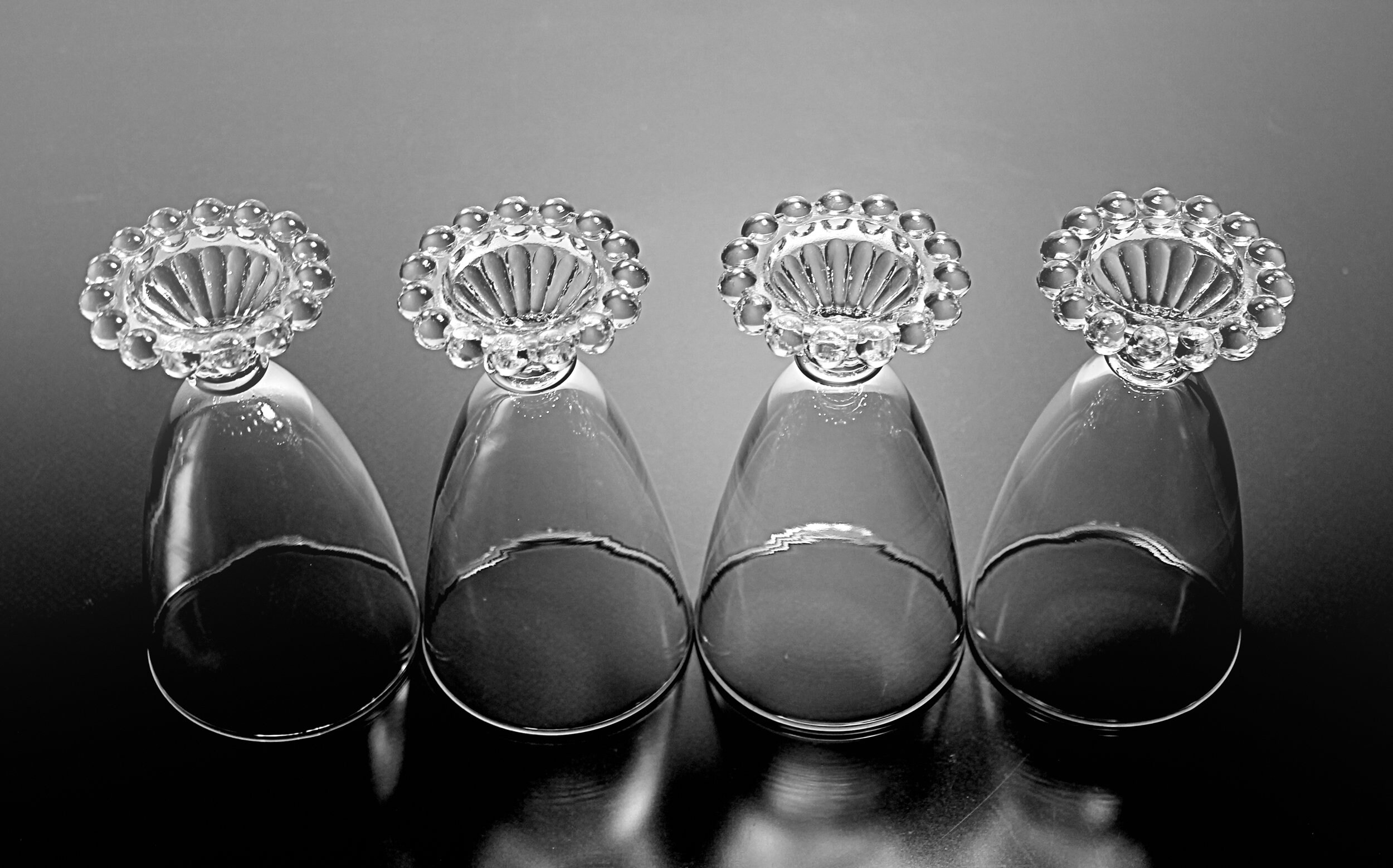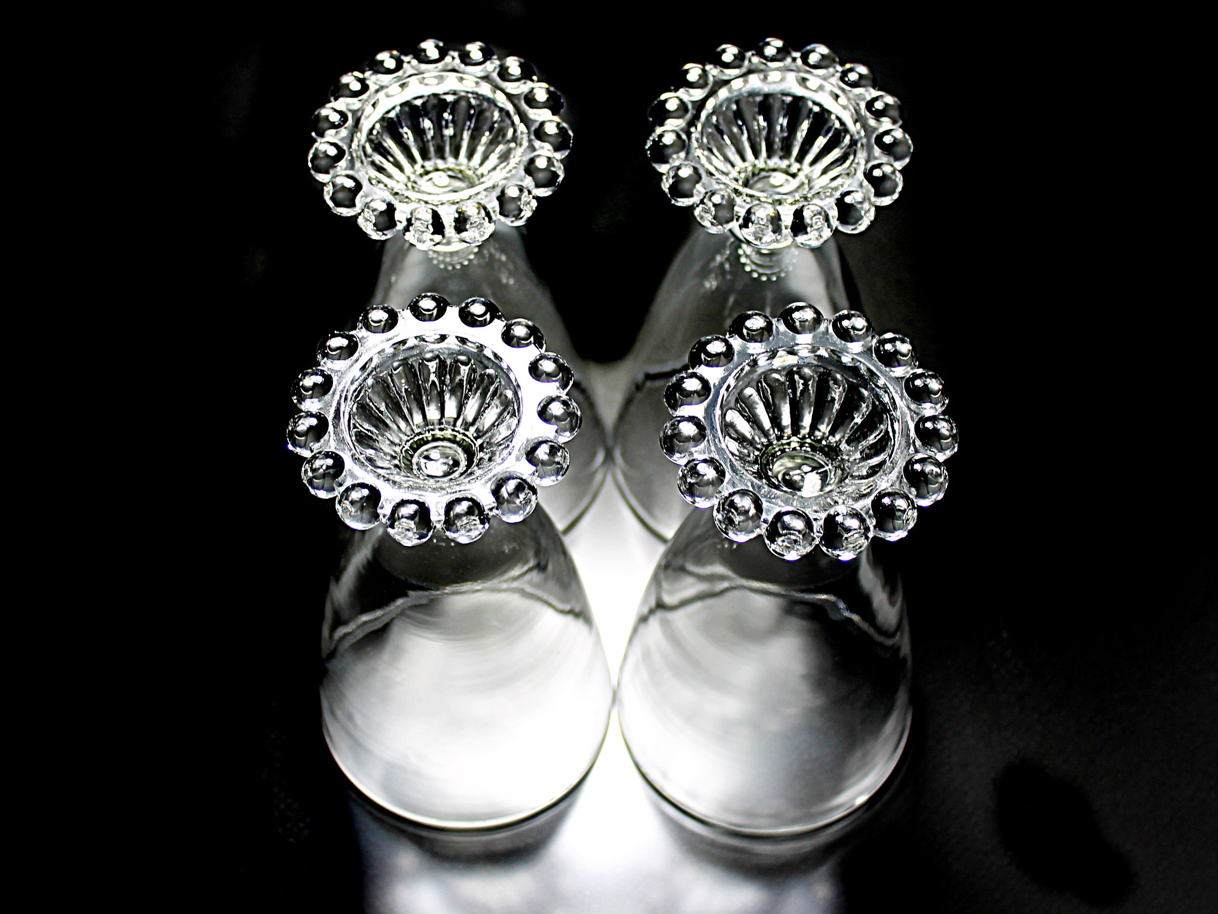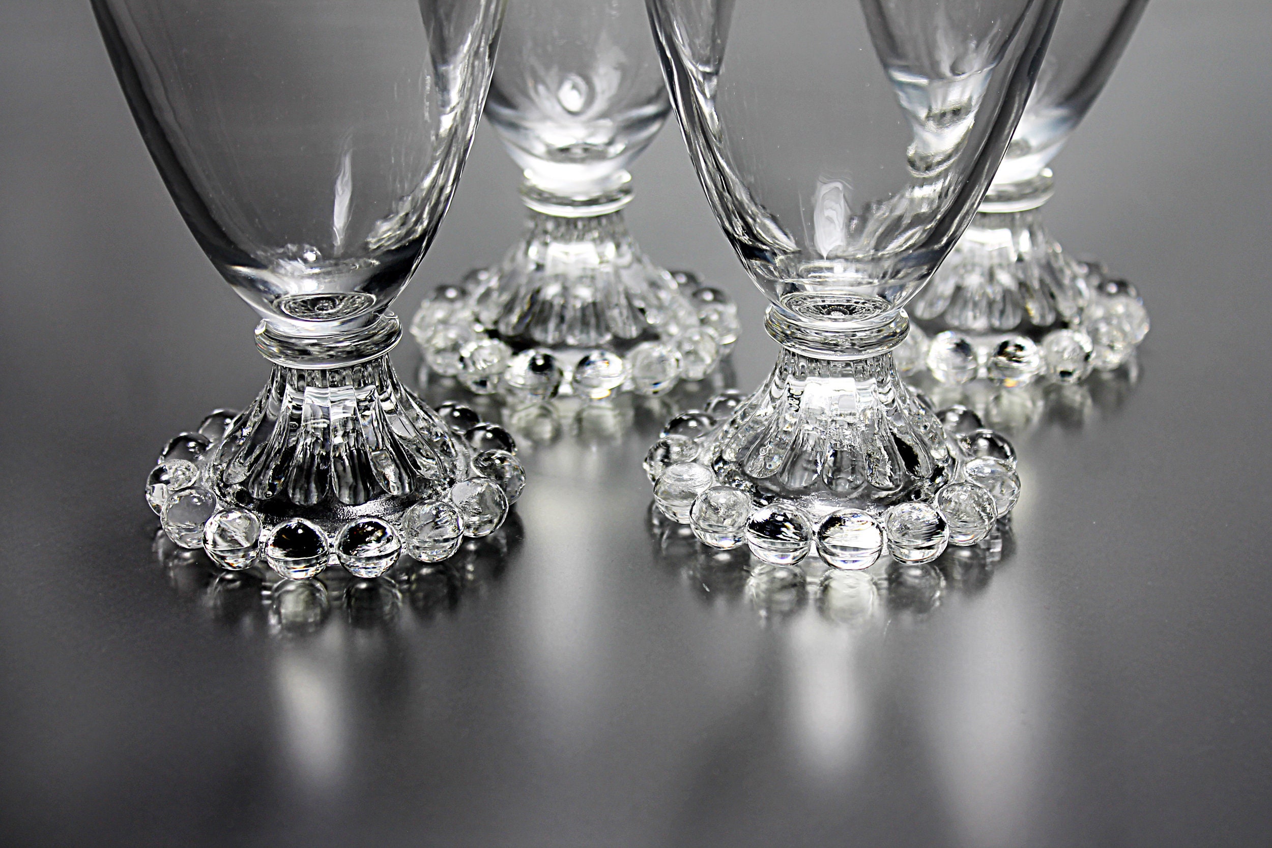 A wonderful set of four Boopie water goblets/wine glasses by Anchor Hocking. The Boopie pattern consists of beaded edges along the foot of the glass. These would be a great addition to a home bar or as toasting glasses.