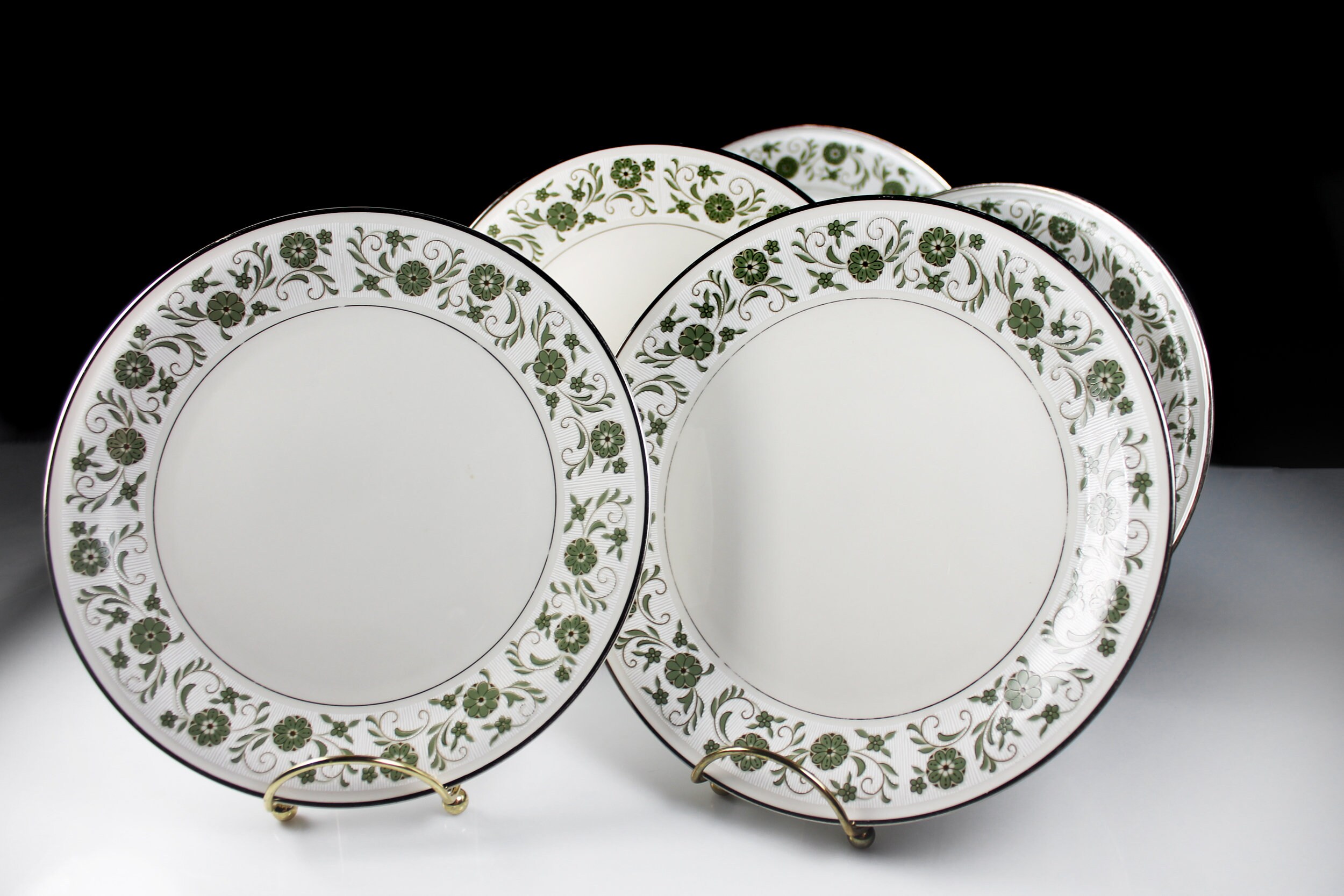 Salad Plates, Mikasa, Fairfax, Ivory China, Green Floral Border, Set of 5, Platinum Trim, Discontinued