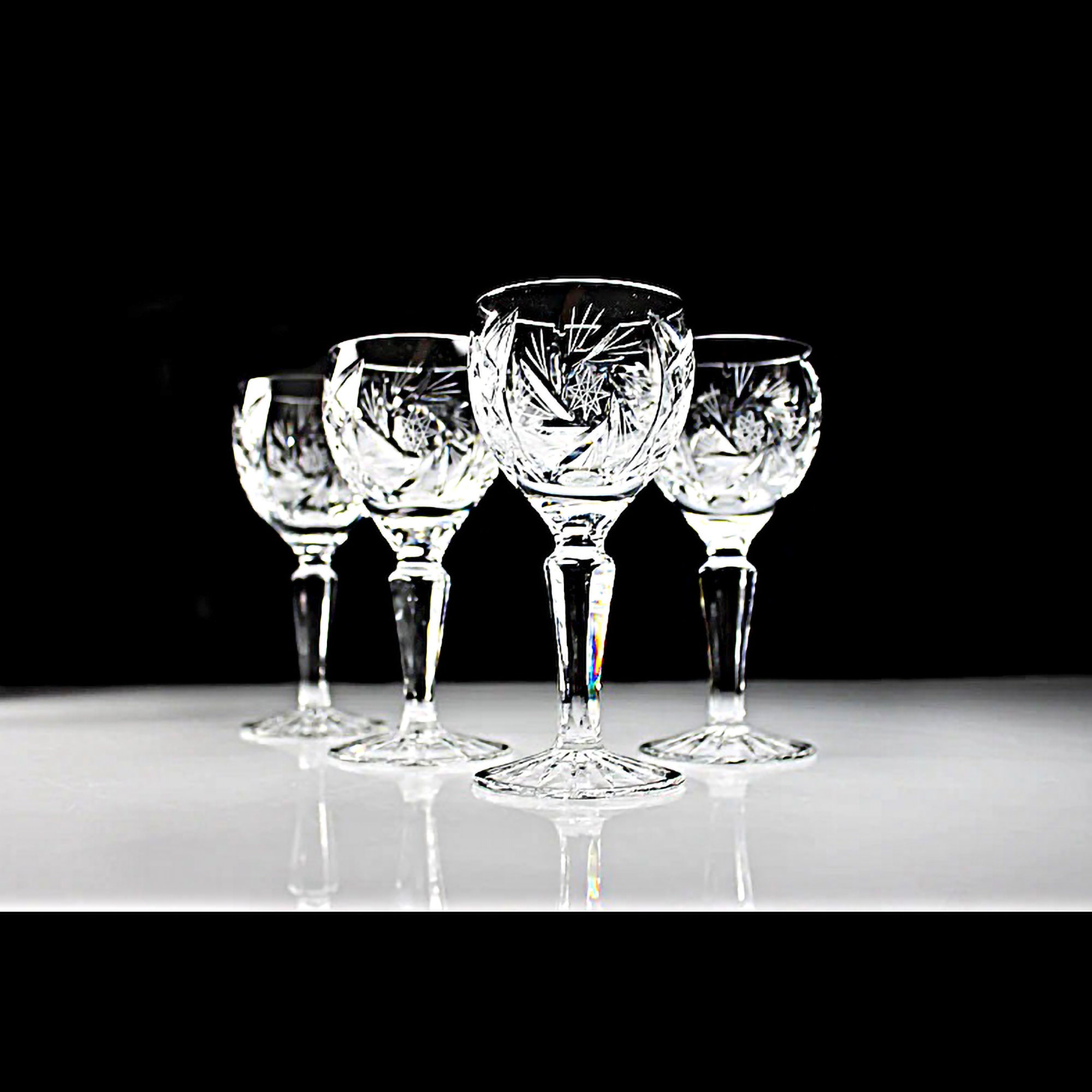 A gorgeous set of four crystal wine glasses by American Cut. The pattern is called Juliette and consists of Hobstars on the bowl and vertical cuts on its foot. This stemware would be a fantastic addition to any home bar. A very elegant set for a wedding or special occasion. These would make a grand gift.