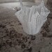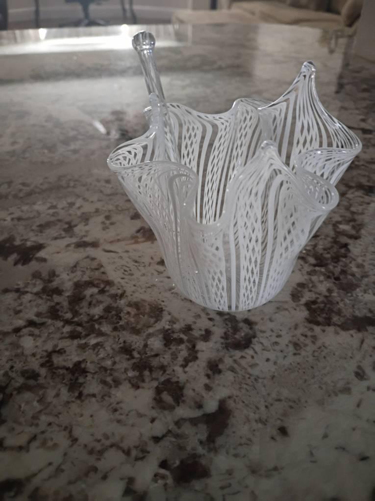 A gorgeous art glass white latticino handkerchief bowl by Murano Glass. Latticino glass is a type of opaque white Venetian glass, often used to create decorative white ribbon or thread patterns in glass objects. The pattern in this bowl and matching stir stick is white lines and lattice. This would made a wonderful gift. It would be beautiful anywhere you display it.