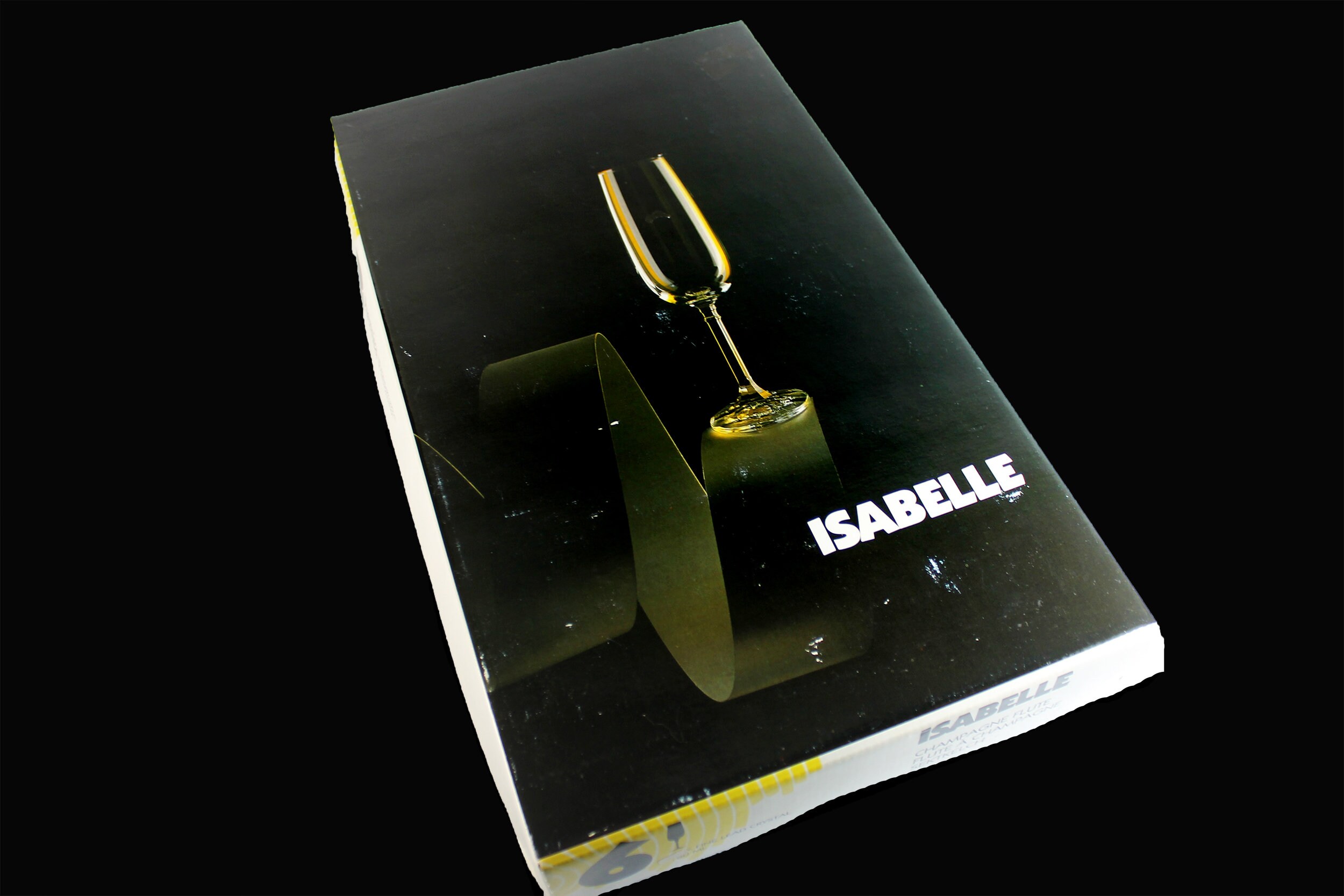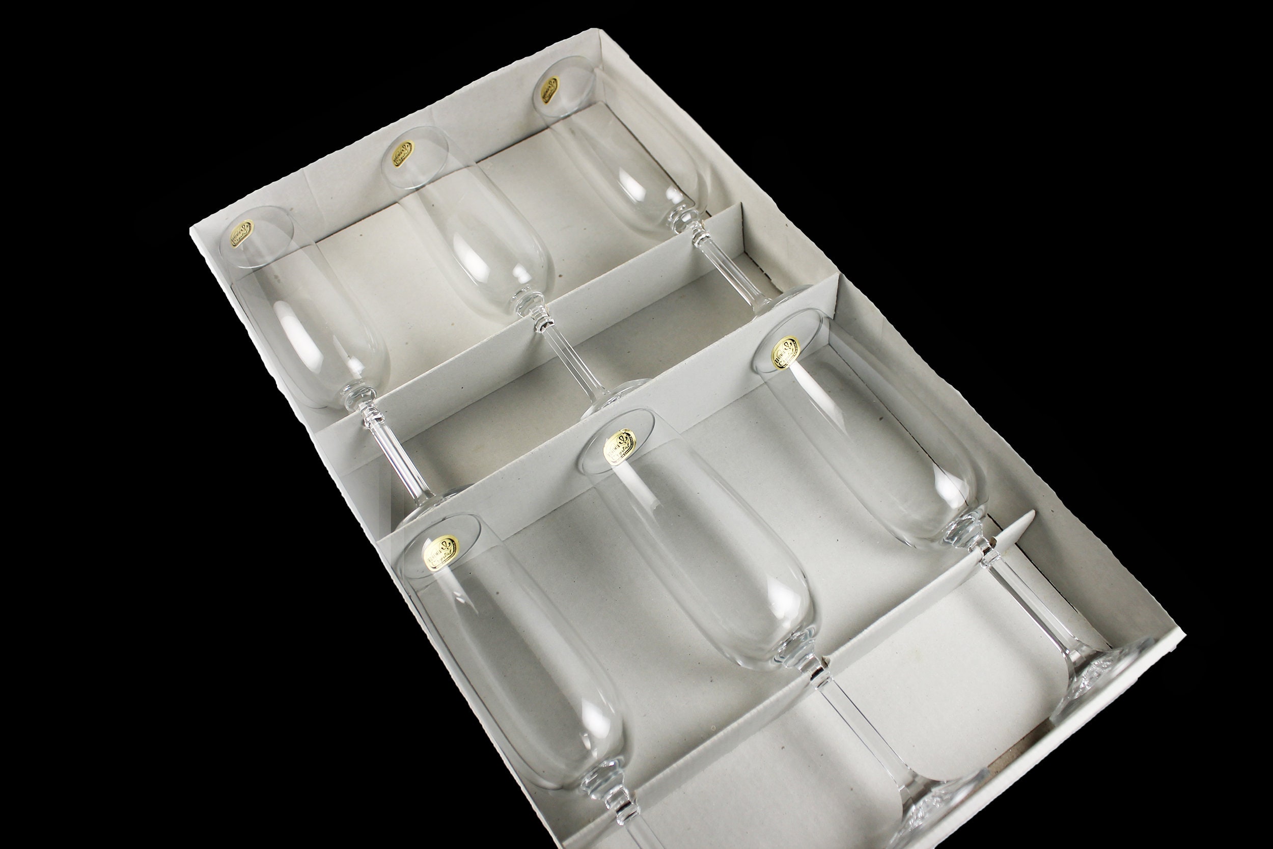 A beautiful set of six crystal champagne flutes by Bohemia Crystal and made in Czechoslovakia. This set is in the Isabelle pattern which consists of a clear bowl with a faceted stem. The glasses are new old stock in their original box with their original stickers making these a wonderful vintage gift. These would be perfect toasting glasses for a wedding or other special occasion. Wonderful for celebrating the holidays. A perfect addition to a stemware collection or for a home bar.