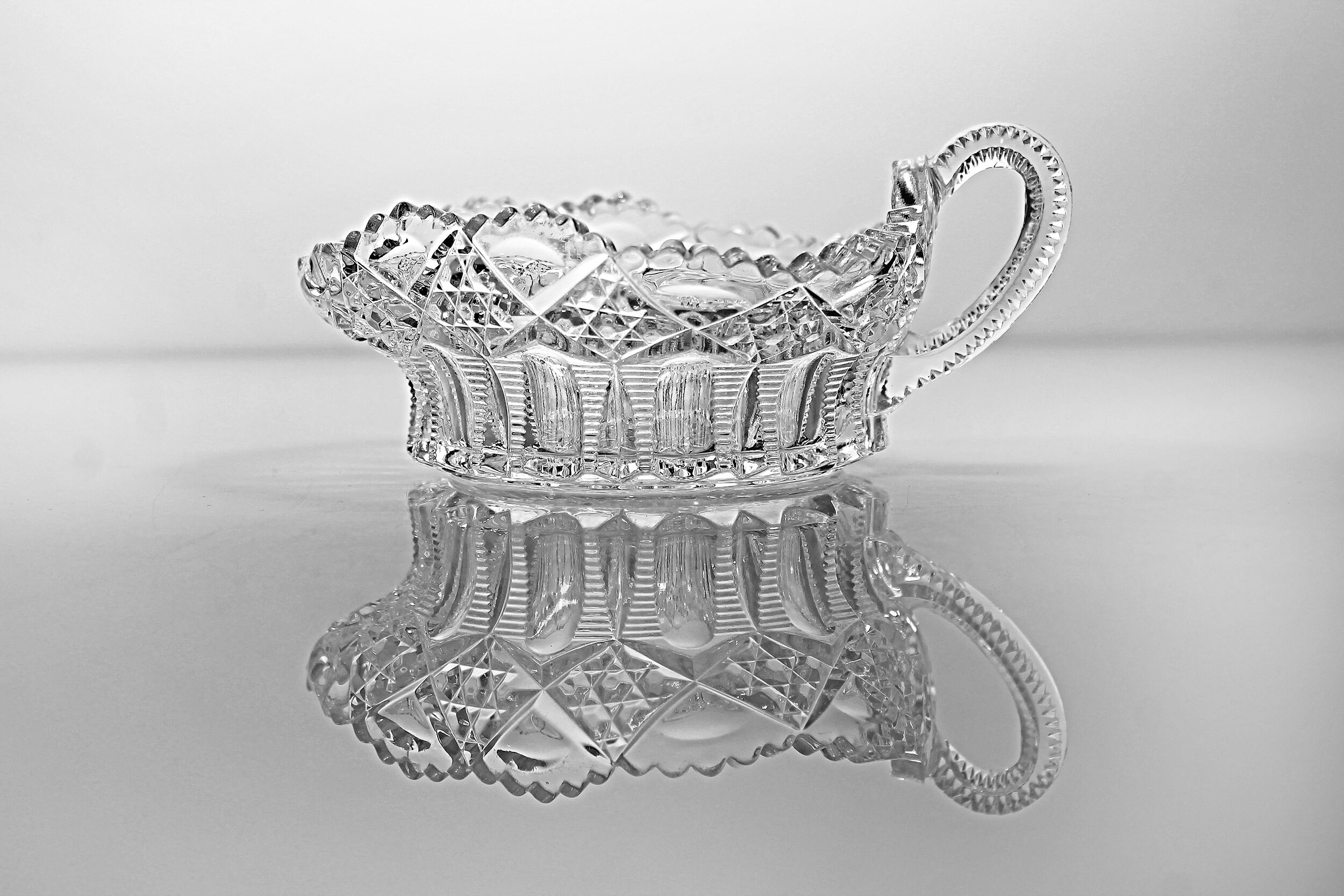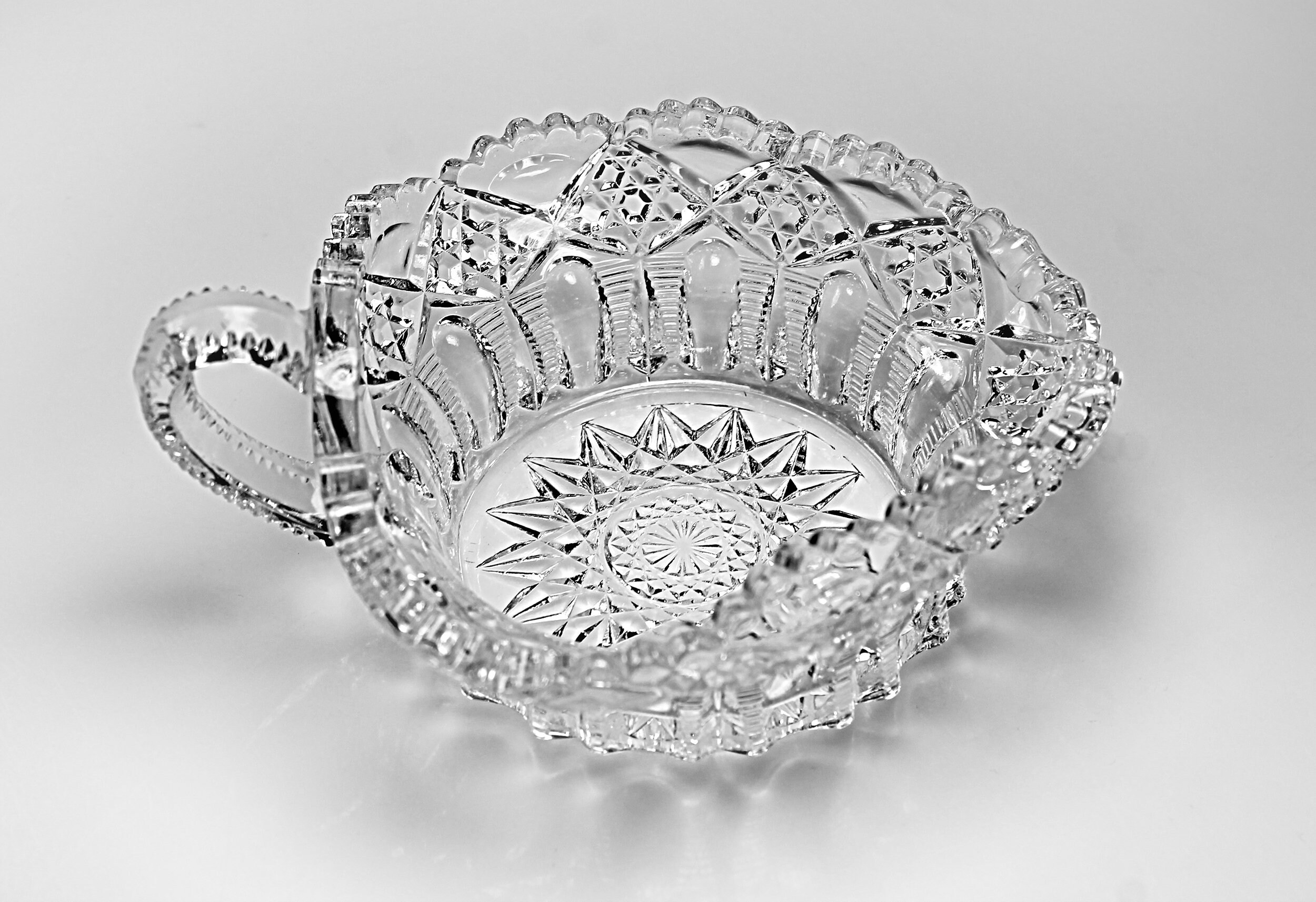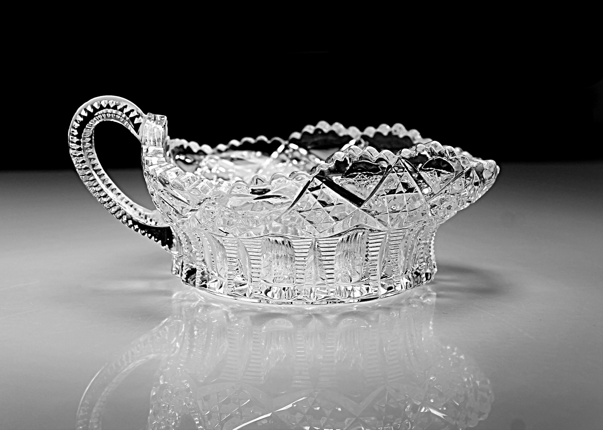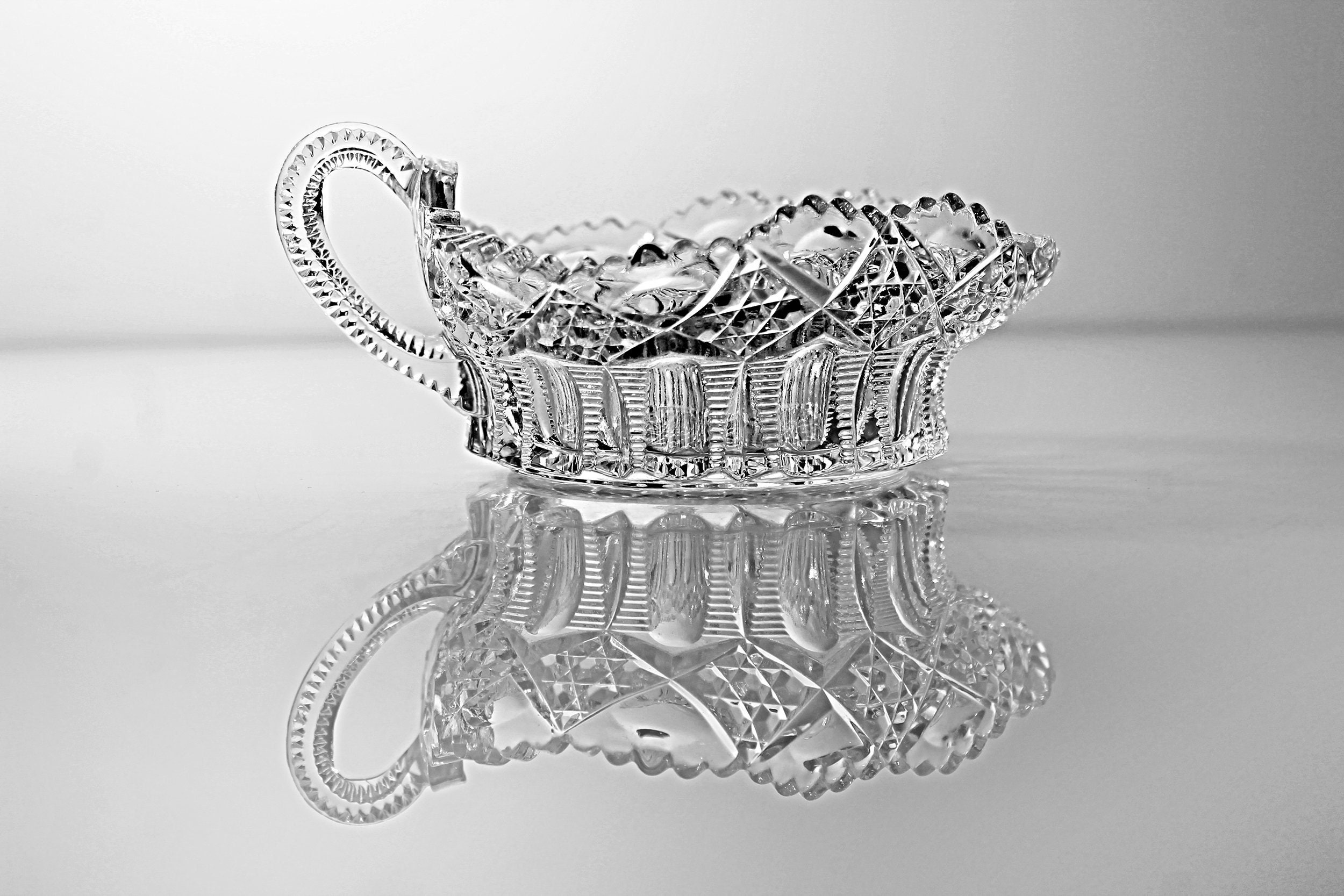 A beautiful antique Early American Pressed Glass nappy by Tarentum Glass. The pattern is called Ladders and Diamonds and consists of pressed ribs and diamonds. A nappy is a round shallow serving dish with a flat bottom and sloping sides.