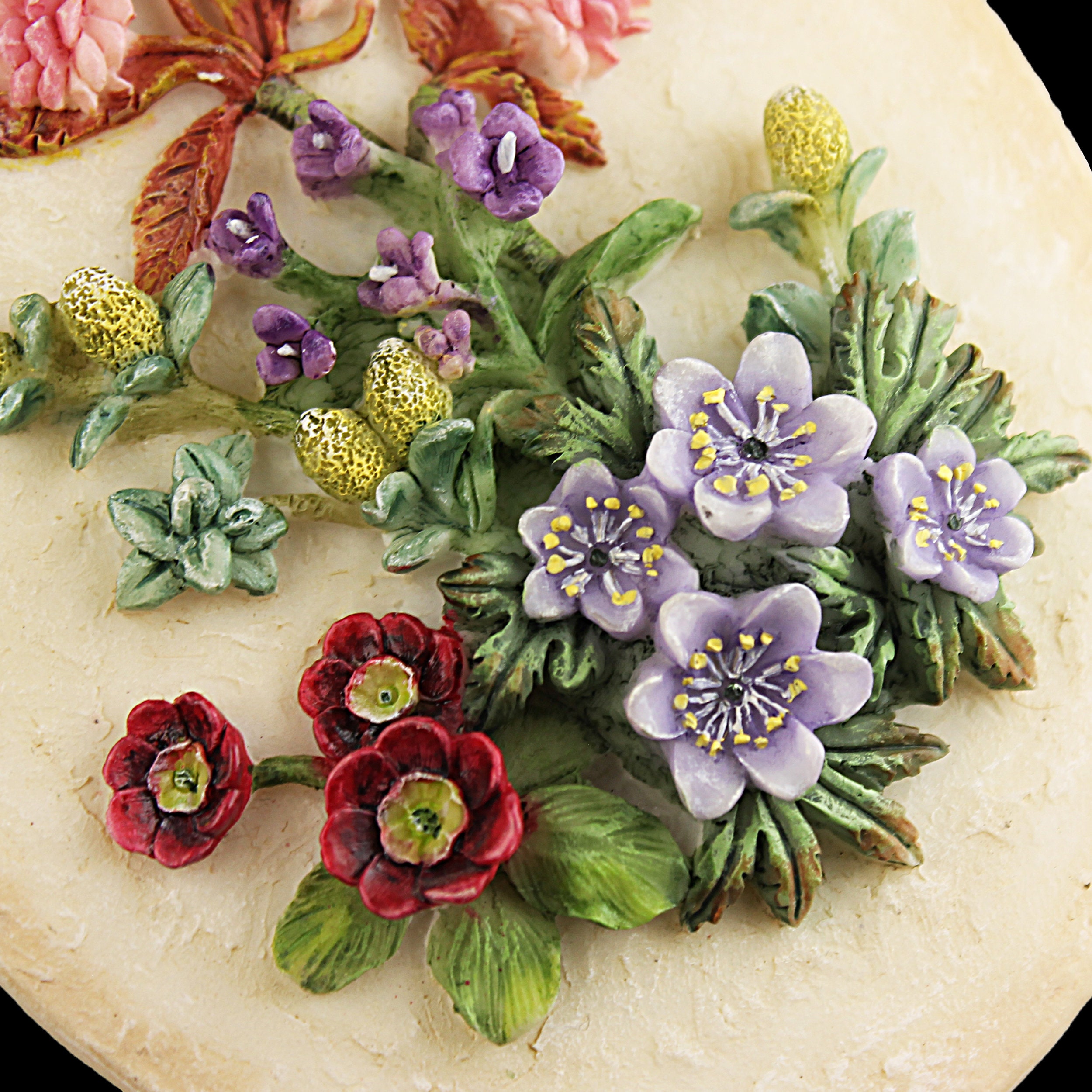 This plaque is in excellent condition. There are no cracks or chips. The flowers are all intact and it has a hanger on the back.