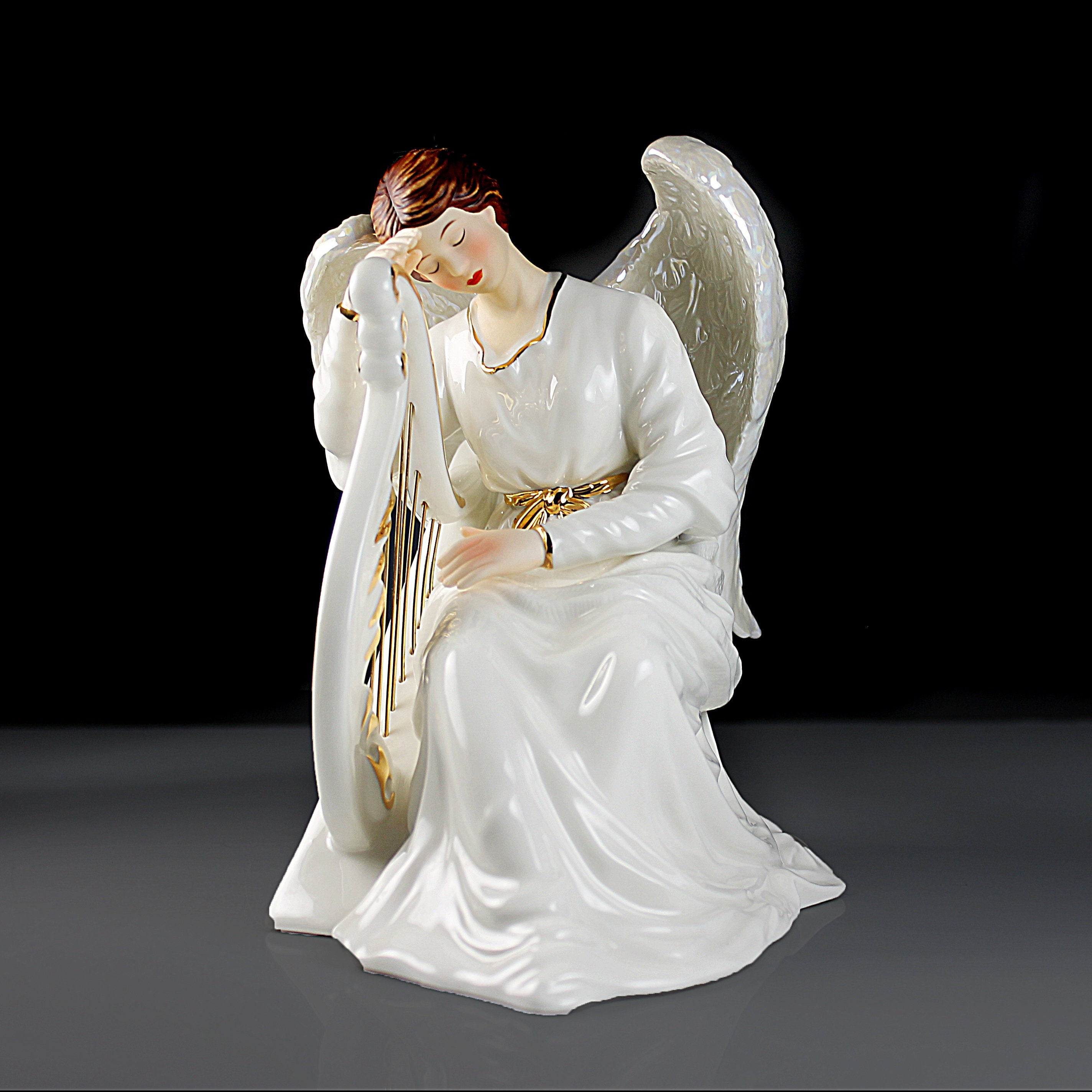A gorgeous white angel figurine with harp by O'Well China. It is glazed except on the head, hands, and foot where bisque porcelain was used, and the wings are lusterware. The figurine is trimmed with gold. O'Well is a brand known for its high-quality collectibles. This is a great piece and would look marvelous in a china or curio cabinet. A wonderful gift idea or addition to an angel collection. Perfect for holiday decor.