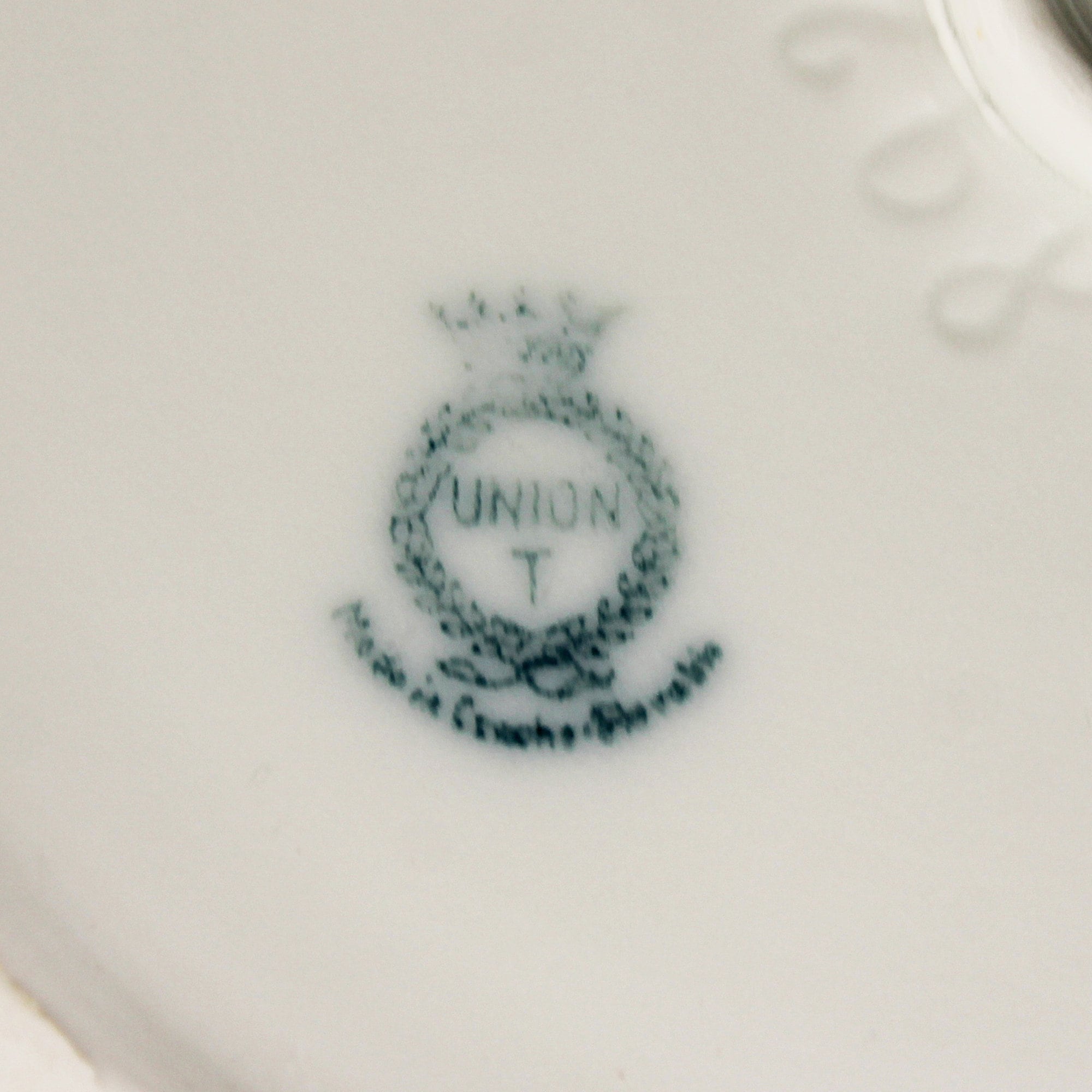 A beautiful antique vegetable bowl by Union T China Company. The pattern consists of a green band with pink roses underneath. There is gold trim on the rim and handles. This would look marvelous on a table, buffet, or sideboard. A great way to add a touch of elegance to a dinner. It is from the 1920s and is approximately 103 years old and it brings the past to the present with beauty.