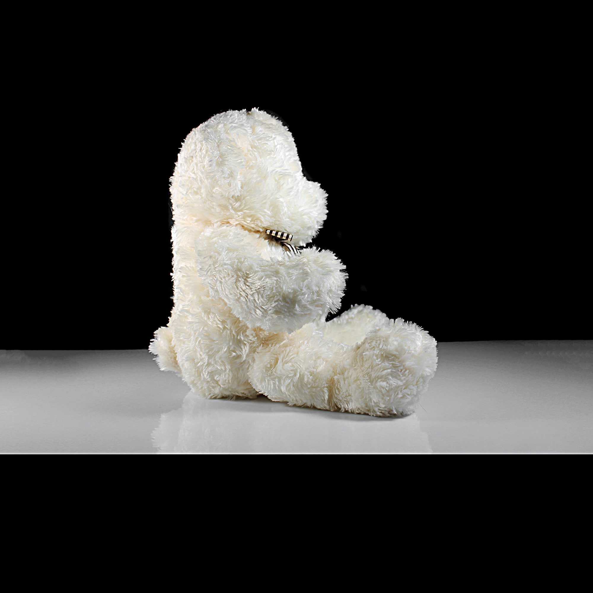 This is an adorable cream-colored teddy bear. His fur is very fluffy, and he is soft and cuddly. He is very clean and is looking for a good home. The bear has a black nose and brown checked ribbon around its neck. This bear will make anyone's day brighter. It would make a wonderful nursery decor sitting in a rocking chair or antique highchair.