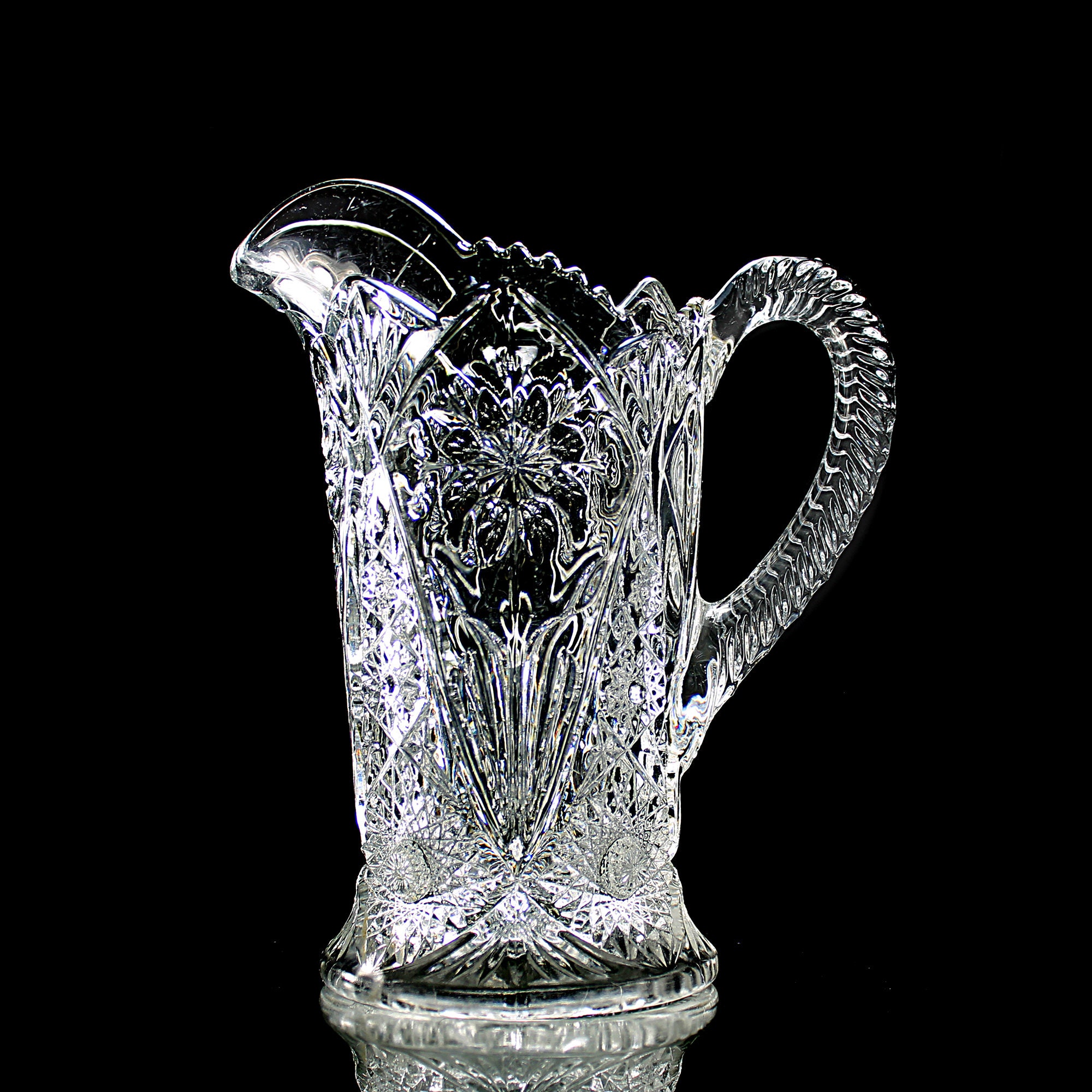 This is a striking EAPG (Early American Pressed Glass) pitcher made by Imperial Glass Co. This pattern is called La Rochele and consists of a flower on three sides and hobstars in between. It is also known as Cosmos and Four Seventy Four. The pressed glass catches the light and has a fantastic shine. A perfect addition to your table, buffet or sideboard. A wonderful gift idea.
