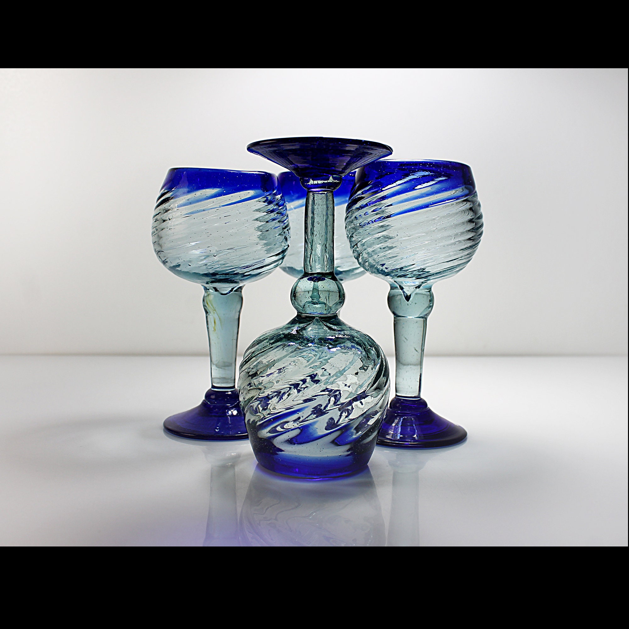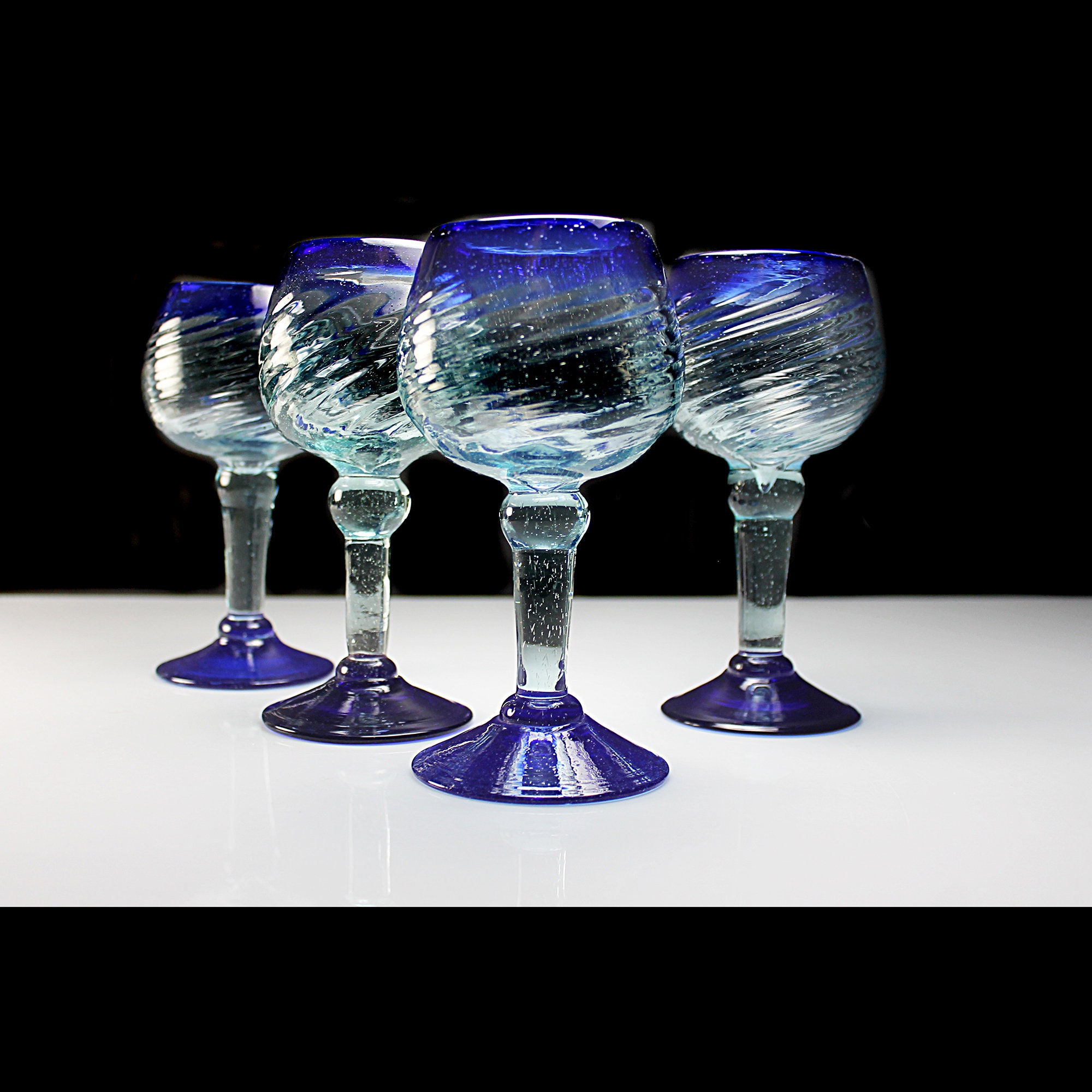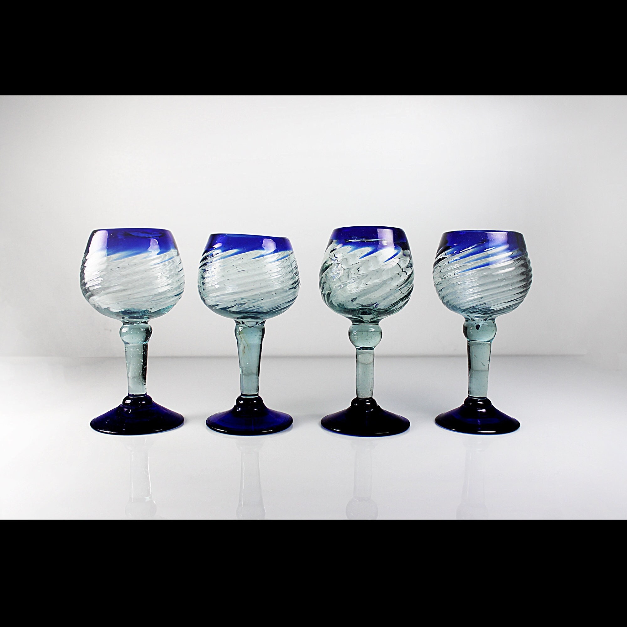 This is an unique set of four handblown wine glasses, crafted in Mexico. Each glass boasts a captivating design featuring a heavy swirl glass bowl and elegant cobalt blue trim and are handmade (no two are exactly alike). Give your home bar or man cave these stunning pieces as they are perfect for serving your favorite wines in style. These wine glasses are not just functional but also make a beautiful addition to any collection. Whether you're hosting a gathering with friends or celebrating special occasions, these glasses are sure to impress your guests. They also make a thoughtful and unique gift for wine enthusiasts.