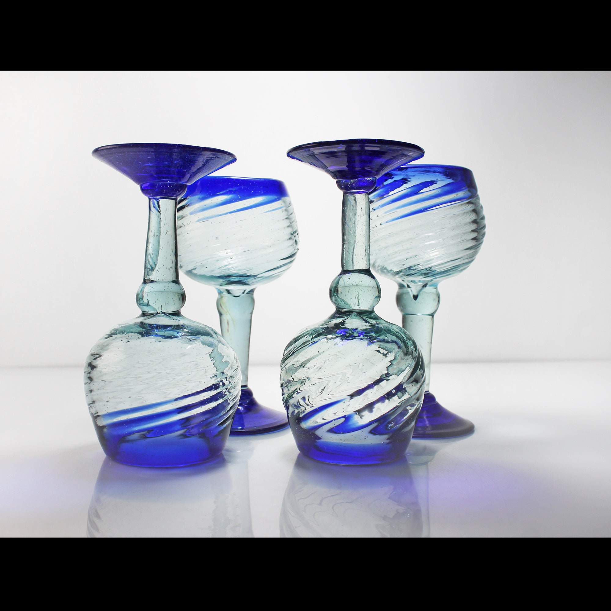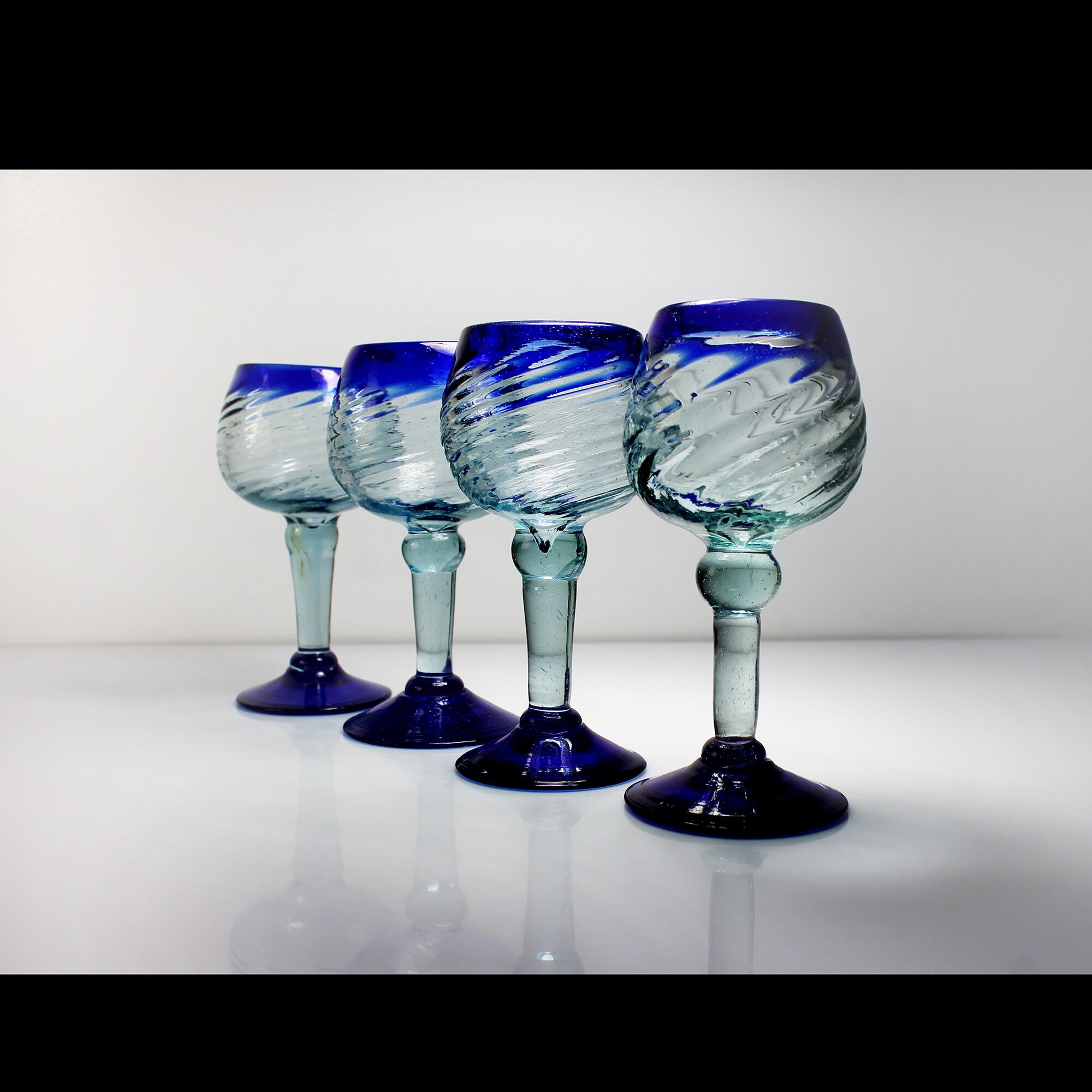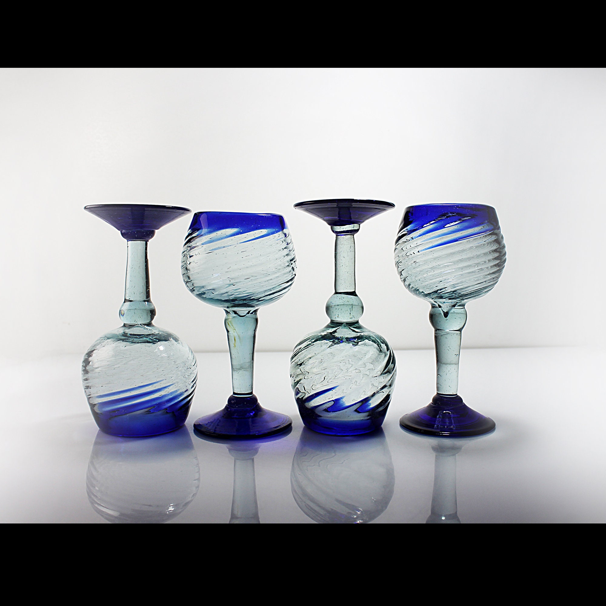 This is an unique set of four handblown wine glasses, crafted in Mexico. Each glass boasts a captivating design featuring a heavy swirl glass bowl and elegant cobalt blue trim and are handmade (no two are exactly alike). Give your home bar or man cave these stunning pieces as they are perfect for serving your favorite wines in style. These wine glasses are not just functional but also make a beautiful addition to any collection. Whether you're hosting a gathering with friends or celebrating special occasions, these glasses are sure to impress your guests. They also make a thoughtful and unique gift for wine enthusiasts.