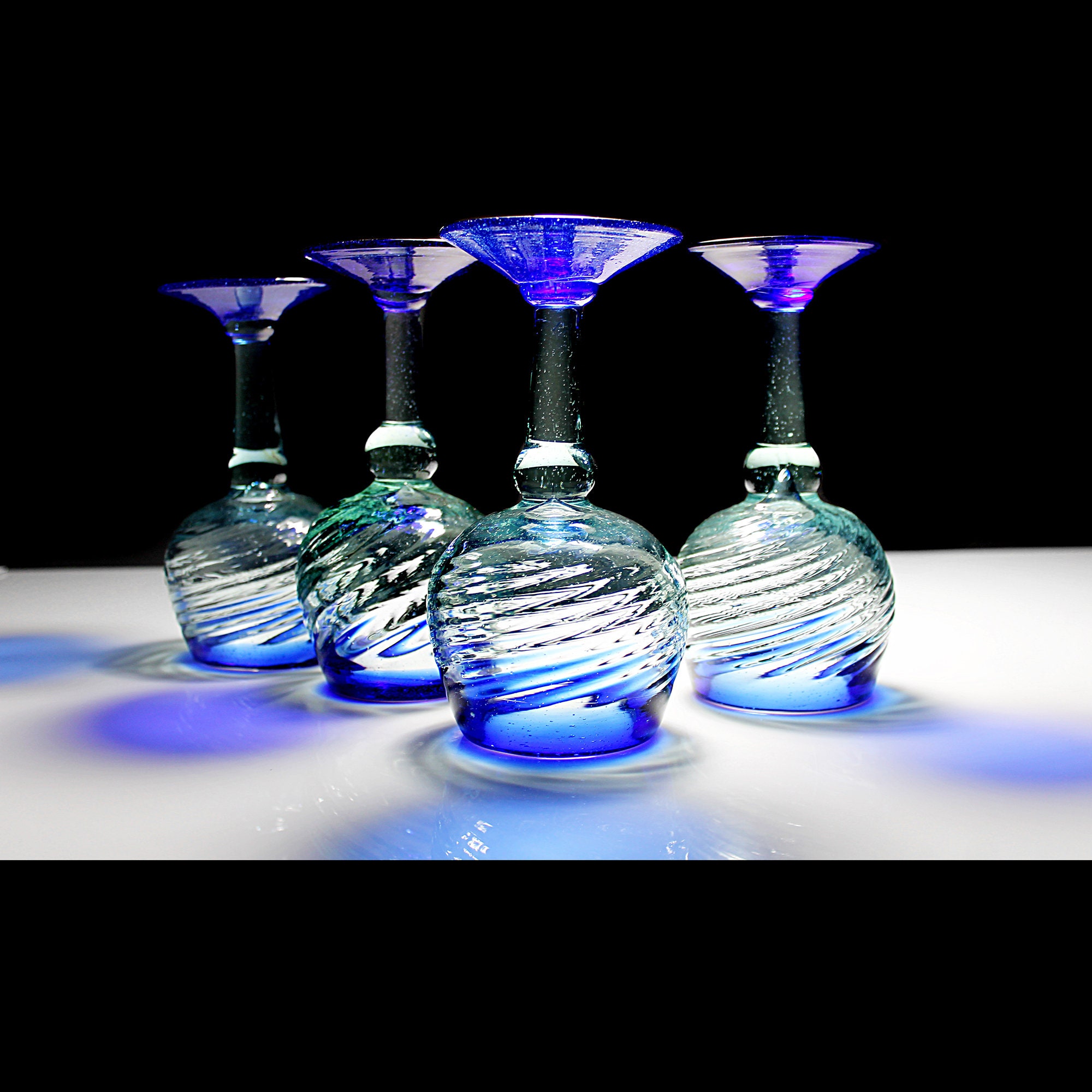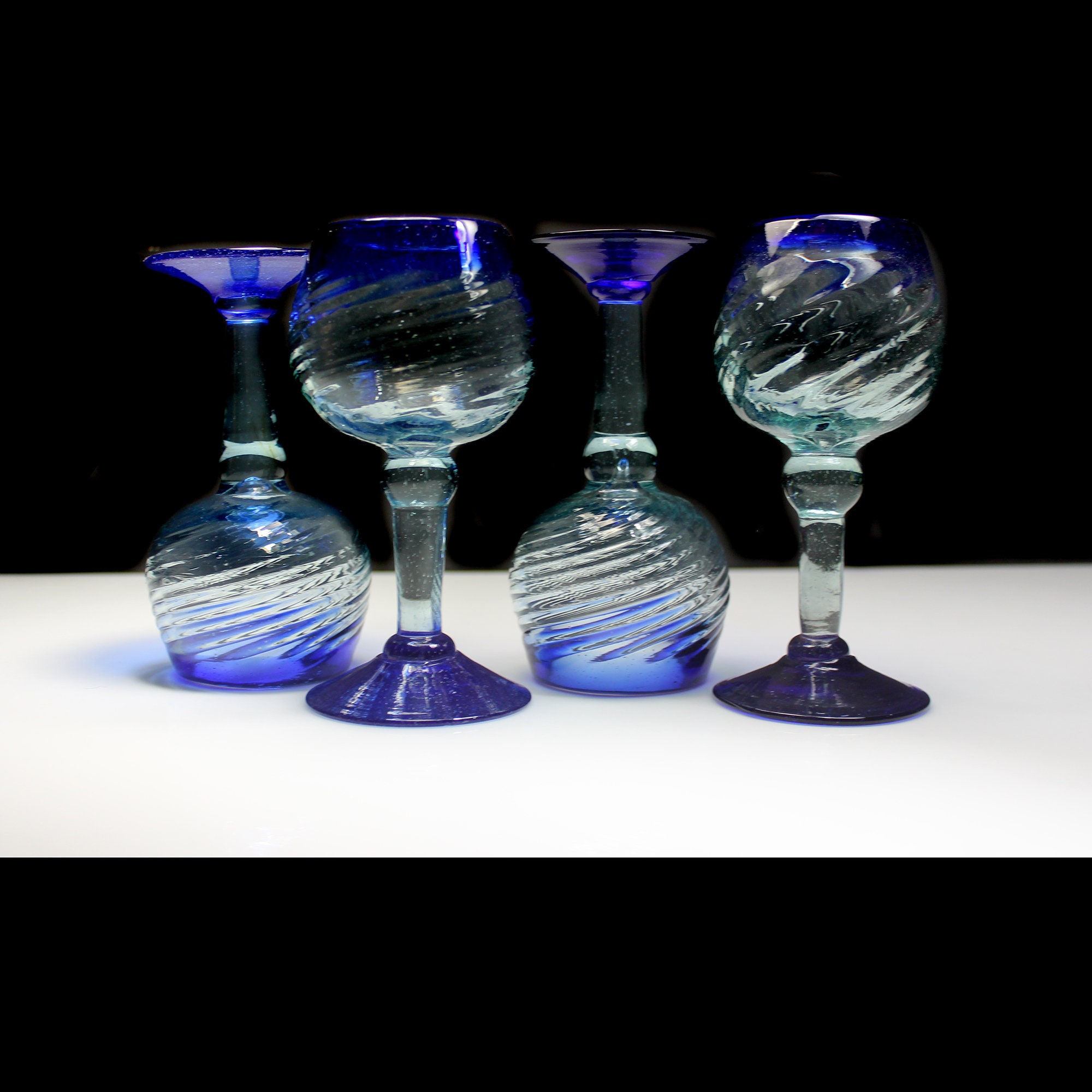 Wine Glasses, Made In Mexico, Set of 4, Heavy Swirl, Cobalt Blue Trim, Barware, Stemware, Hand Blown