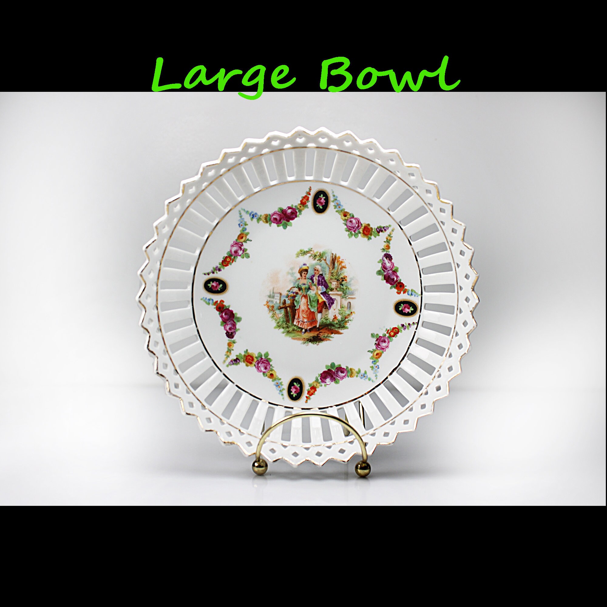 Antique Reticulated Portrait Set, German Porcelain – Large Bowl, Small Bowl, Small Plate with Gold Trim, Set of 3