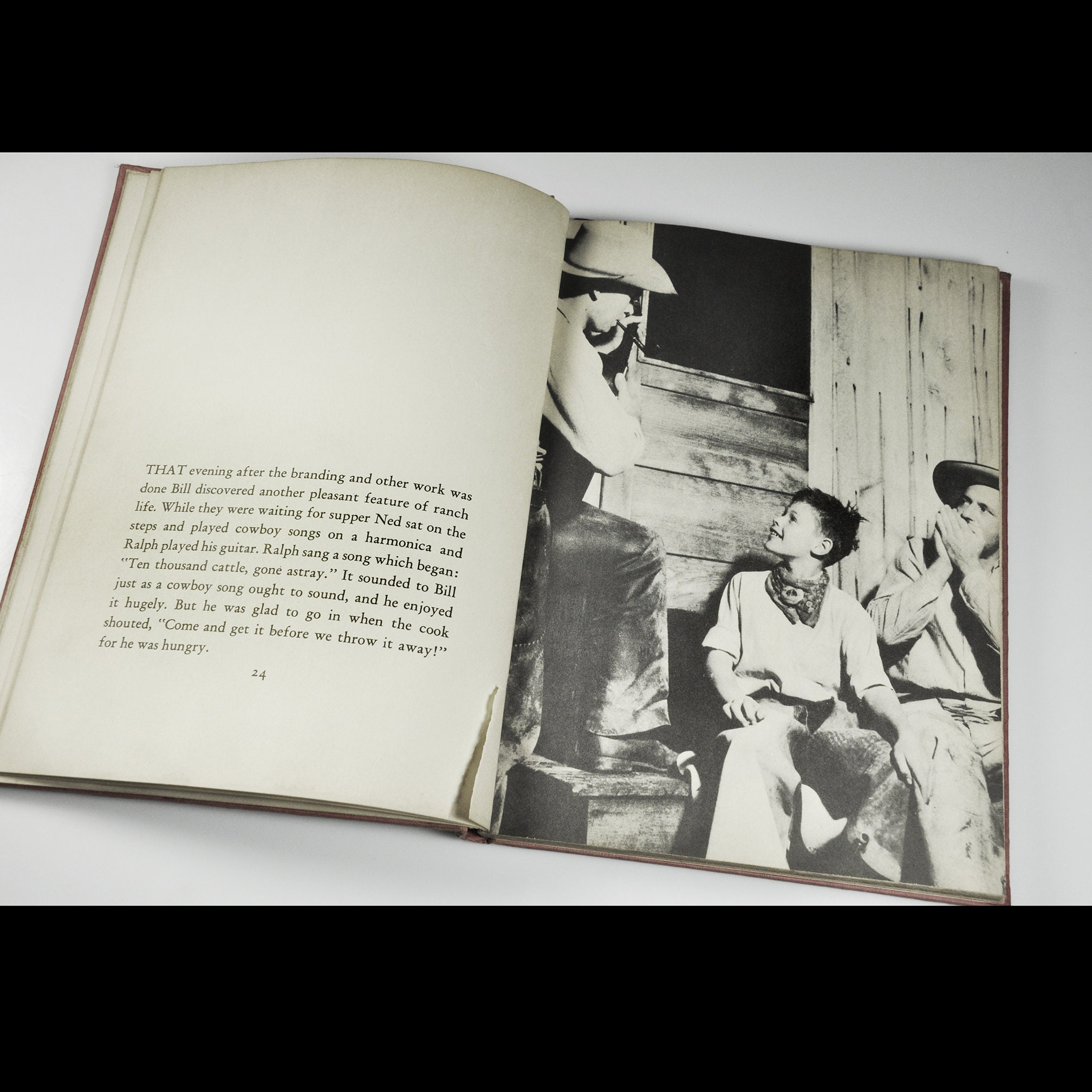 Step back in time with this rare and captivating children's hardcover book, "The Cowboy Book" by William Clayton Pryor and Helen Sloman Pryor. This extraordinary 1938 First Edition is a true collector's item, with only 36 copies ever published. "The Cowboy Book" is a unique photographic picture book that tells the adventurous story of Cowboy Bill through a series of beautifully captured black-and-white photographs. Each image is thoughtfully paired with a written narrative, creating a vivid and engaging visual storytelling experience for children. This book is part of an enchanting series by the Pryors, which includes other photographic gems like "The Airplane Book" and "The Streamline Train Book."