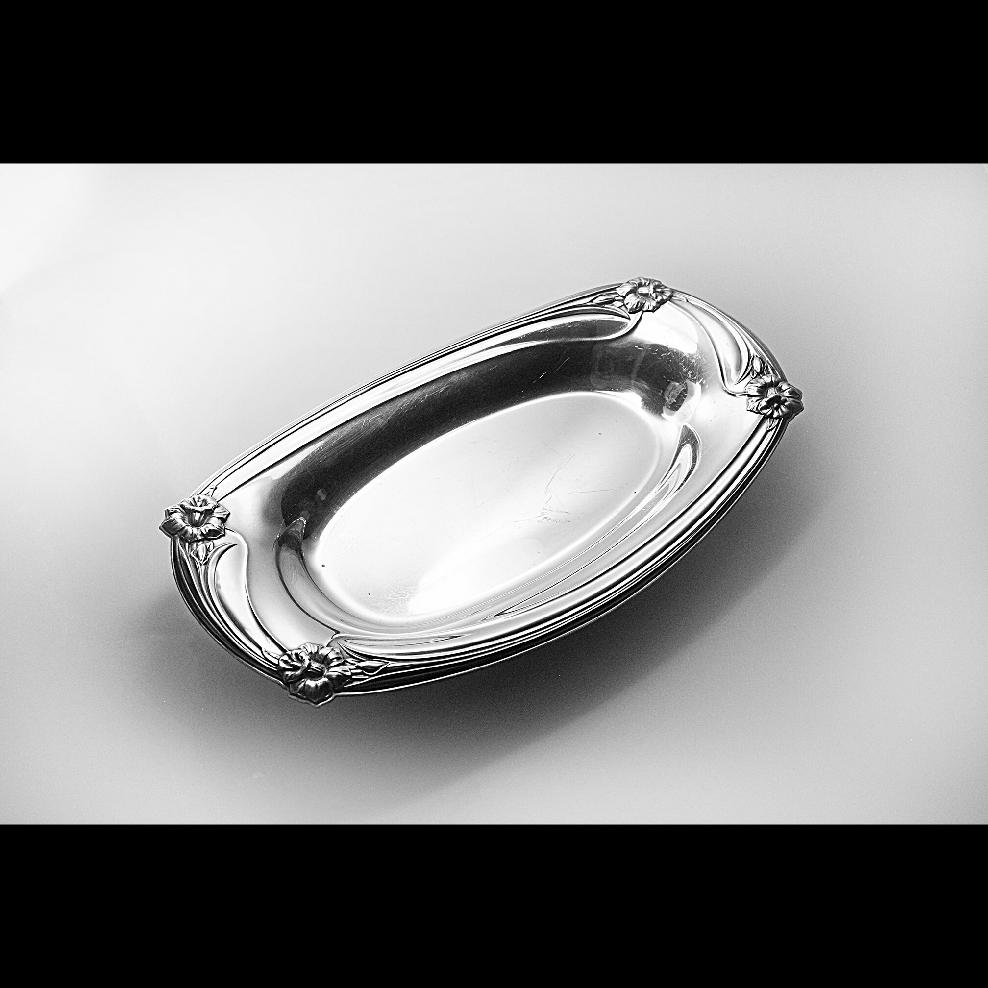 This tray is in good condition. This piece is vintage and has some scratching and marks which is to be expected for older silver. Please see photos. But it is lovely and has a great shine. Our price on this piece reflects the above mentioned imperfections.