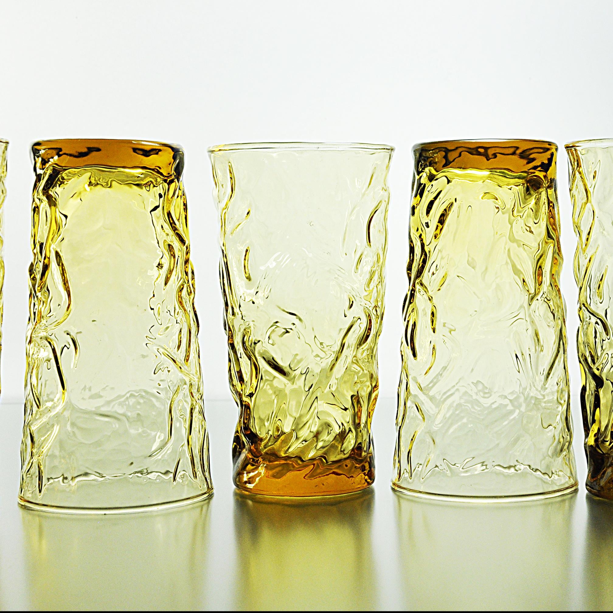 Add interest to your drinkware collection with this stunning set of 6 Libbey Glass Aztec Gold tumblers from the 1960s. These vintage 12-ounce tumblers feature a beautiful textured crinkled design and rich amber color that embodies the bold, modern aesthetic of the era. These tumblers are perfect for everyday use or for adding a retro touch to your home decor. They would make a fantastic gift for a lover amber glassware or a special addition to your personal barware collection!