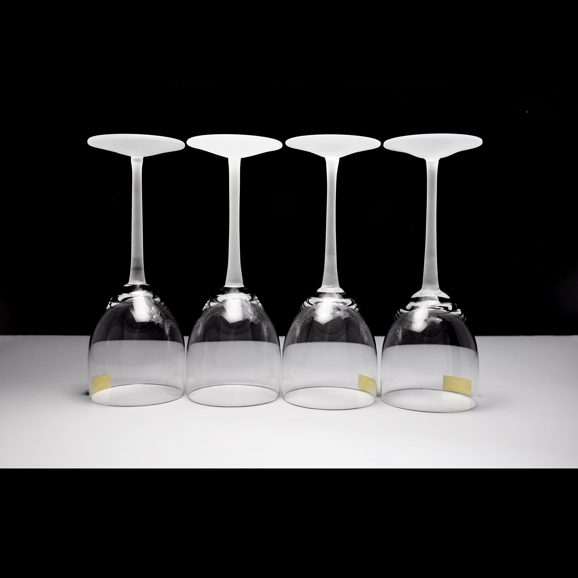 This set of four stunning Toscany Balmoral crystal wine glasses is a perfect blend of elegance and craftsmanship. Hand-blown in Romania, each glass features a clear crystal bowl paired with a frosted glass stem, adding a touch of charm to your glassware collection. These wine glasses stand 8 inches tall and 3 inches in diameter and are in excellent condition with no chips or cracks. Ideal for collectors or special occasions, these glasses are both functional and decorative.