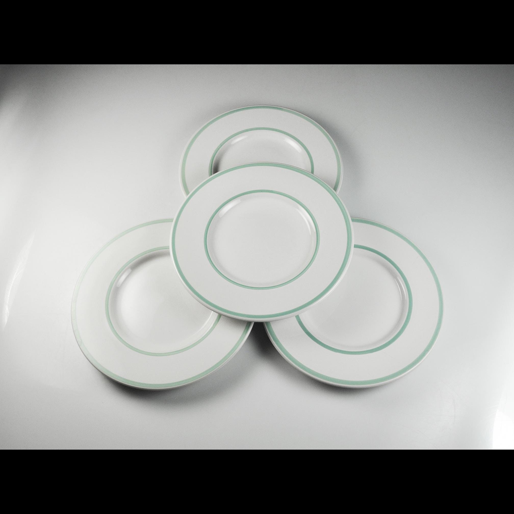 Add simple, classic charm to your table setting with this set of four vintage stoneware saucers from Thailand. Each plate features a clean green band around the rim, measuring 6 inches in diameter—the perfect size for bread, desserts, or under a teacup. Bring home these beautiful vintage saucers today and enjoy their versatile charm for teatime, desserts, or everyday dining. They also make a thoughtful gift for anyone who appreciates unique, timeless tableware.