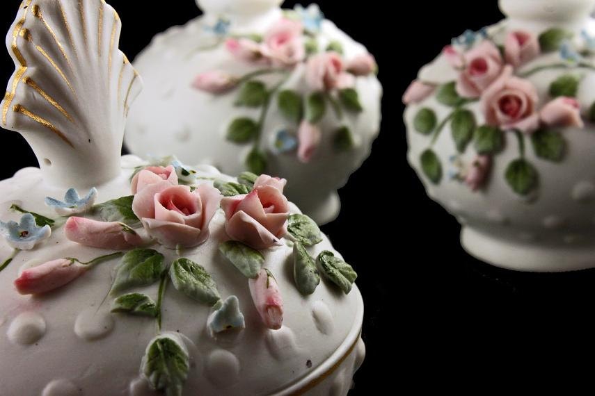 Porcelain Perfume Bottles, Vanity Set, Lefton, Powder Box, Two Perfume Bottles, Raised Roses, 84242