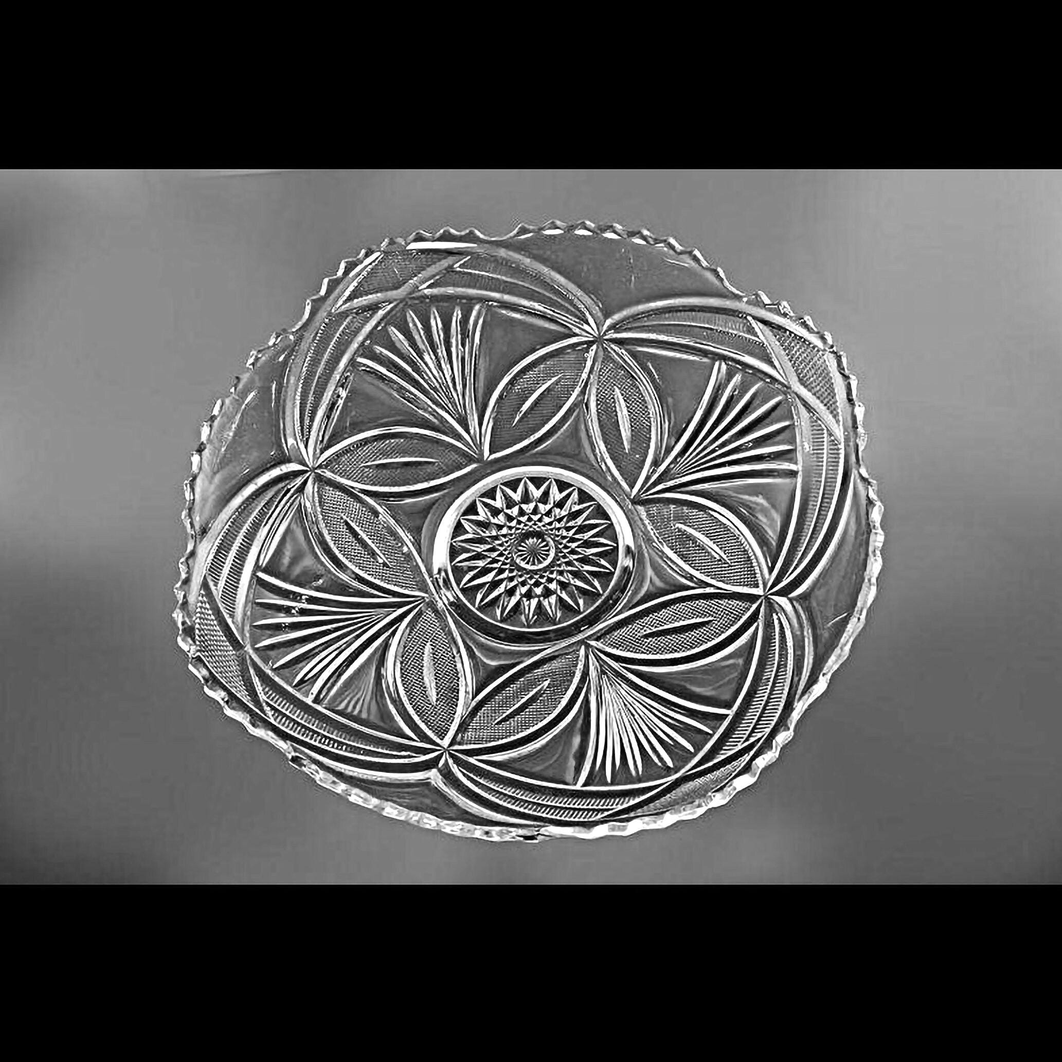 This is a stunning EAPG (Early American Pressed Glass) bowl by Bryce. The pattern is called Monarch (aka Beautiful Lady) which consists of fans, arches, and teardrop designs. It is clear glass with a sawtooth edge. This would be a great centerpiece filled with fruit.