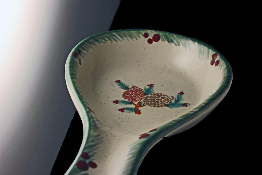 A lovely large spoon rest in a pine cone pattern. This spoon rest is collectible as well as decorative. Perfect for the Holiday season to add a touch of festive atmosphere to your kitchen. Use on your table or buffet to protect your table cloth or runner.