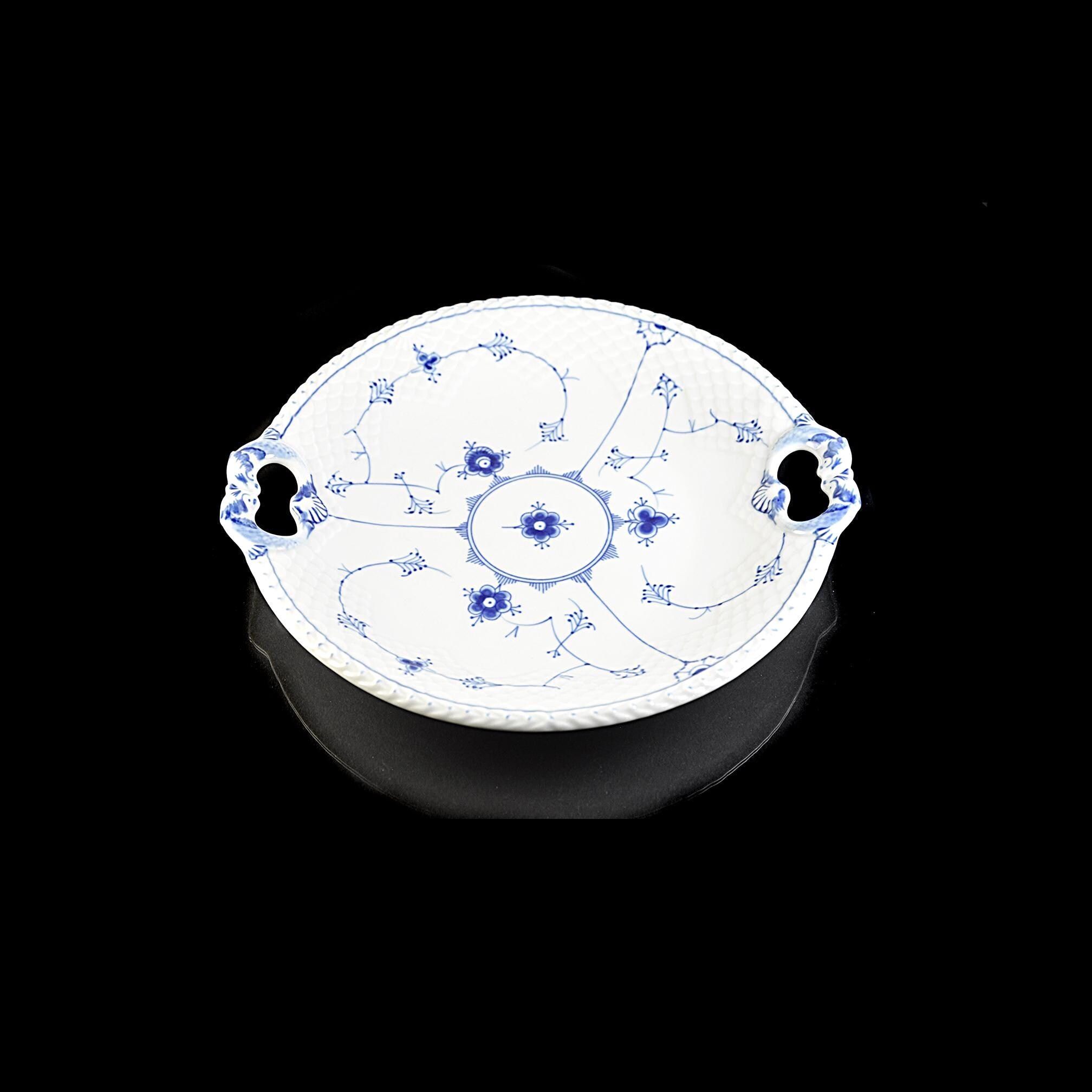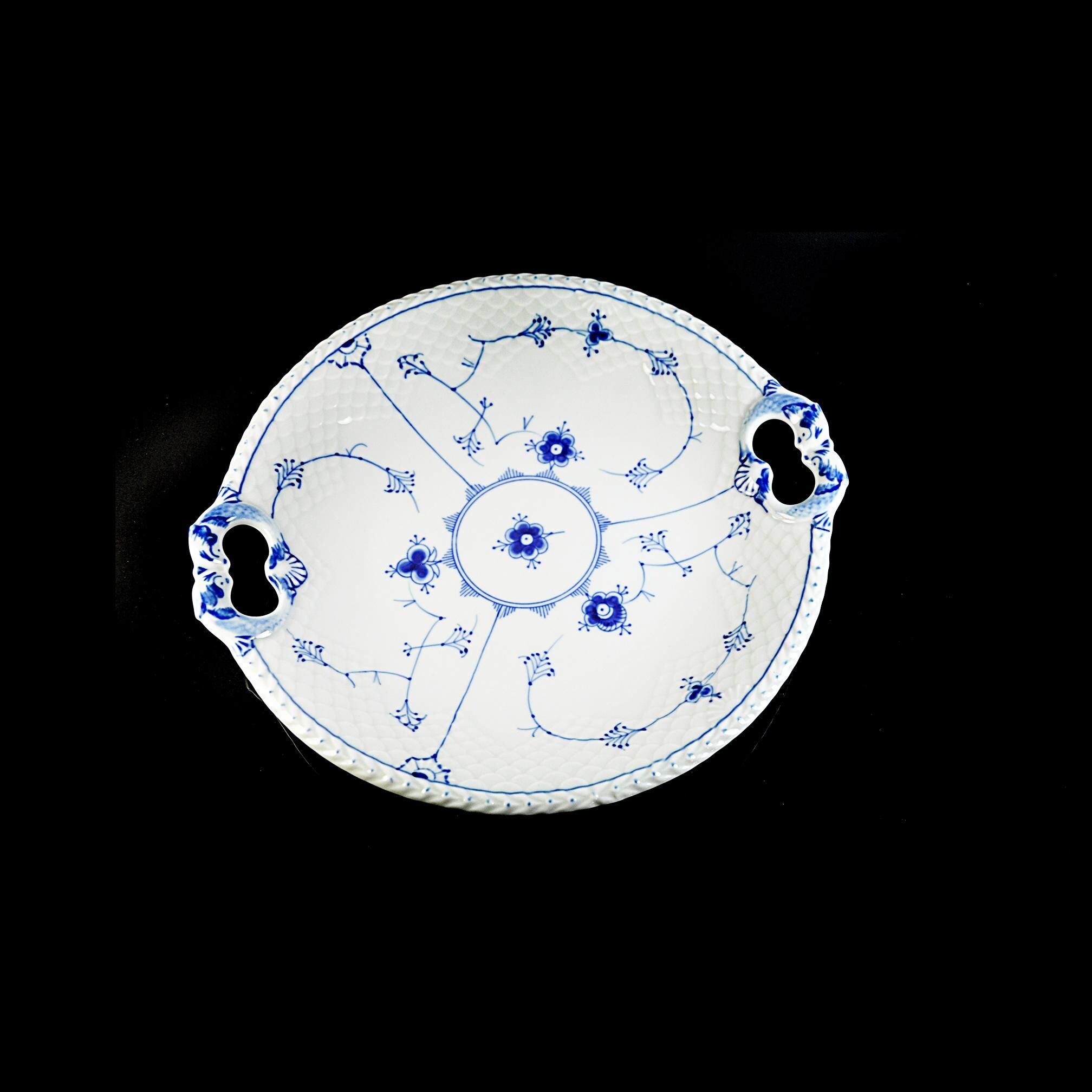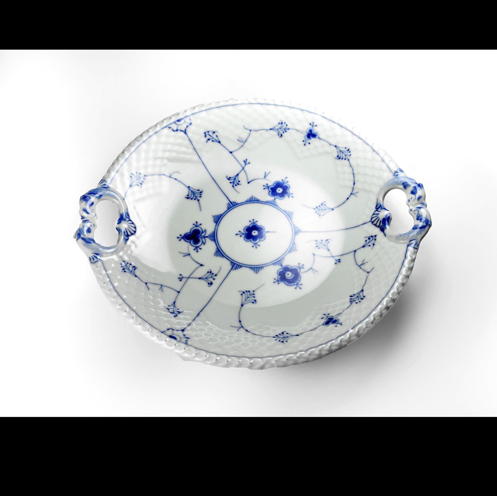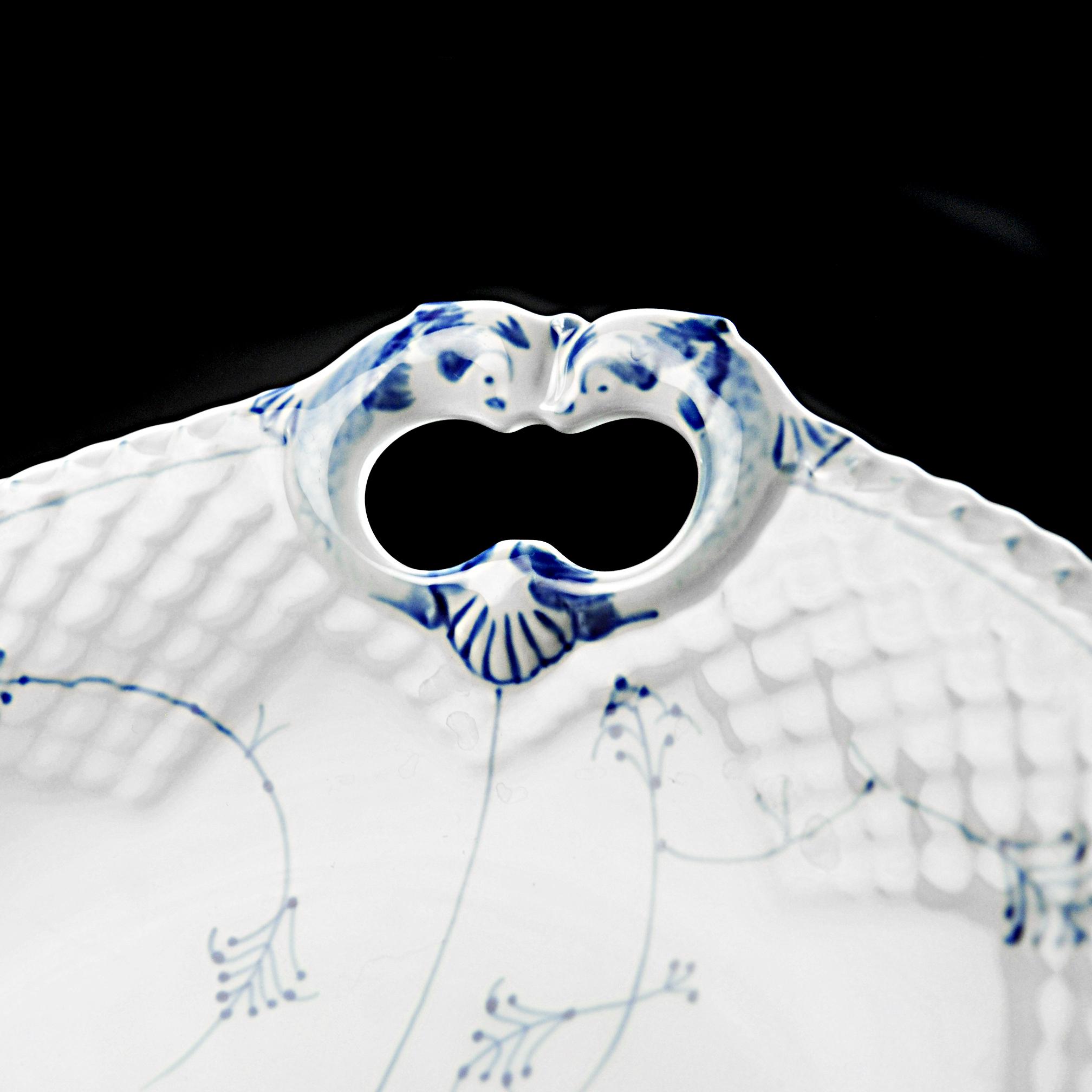 This vintage handled cake plate was made by Bing & Grøndahl of Copenhagen, Denmark, in the classic Blue Traditional pattern. It features a delicate hand-painted floral design with raised basketweave detail and pierced handles designed like fish highlighted in blue. The Blue Traditional (also called Blue Fluted) pattern is one of Denmark’s most enduring porcelain designs, first inspired by 18th-century Chinese export porcelain. It’s a beautiful serving piece that works just as well for display as for the table. Whether you use it to serve cakes and pastries, or showcase it in a china cabinet, it carries the timeless look of fine Danish porcelain. A fine collectible piece of Scandinavian porcelain, perfect for anyone who loves vintage European tableware.