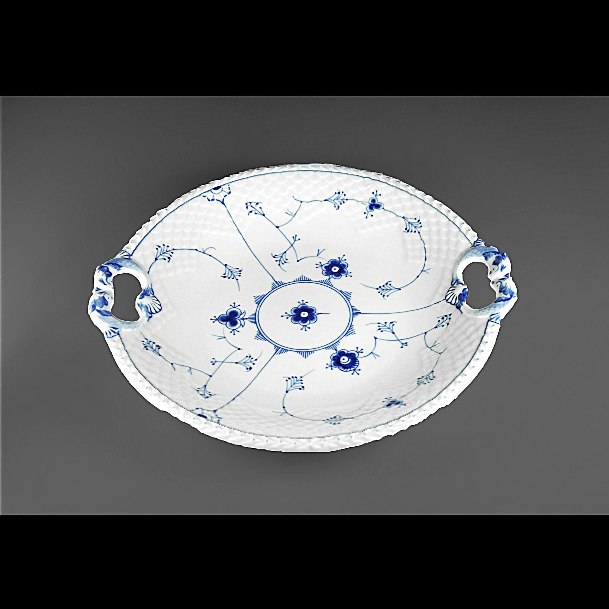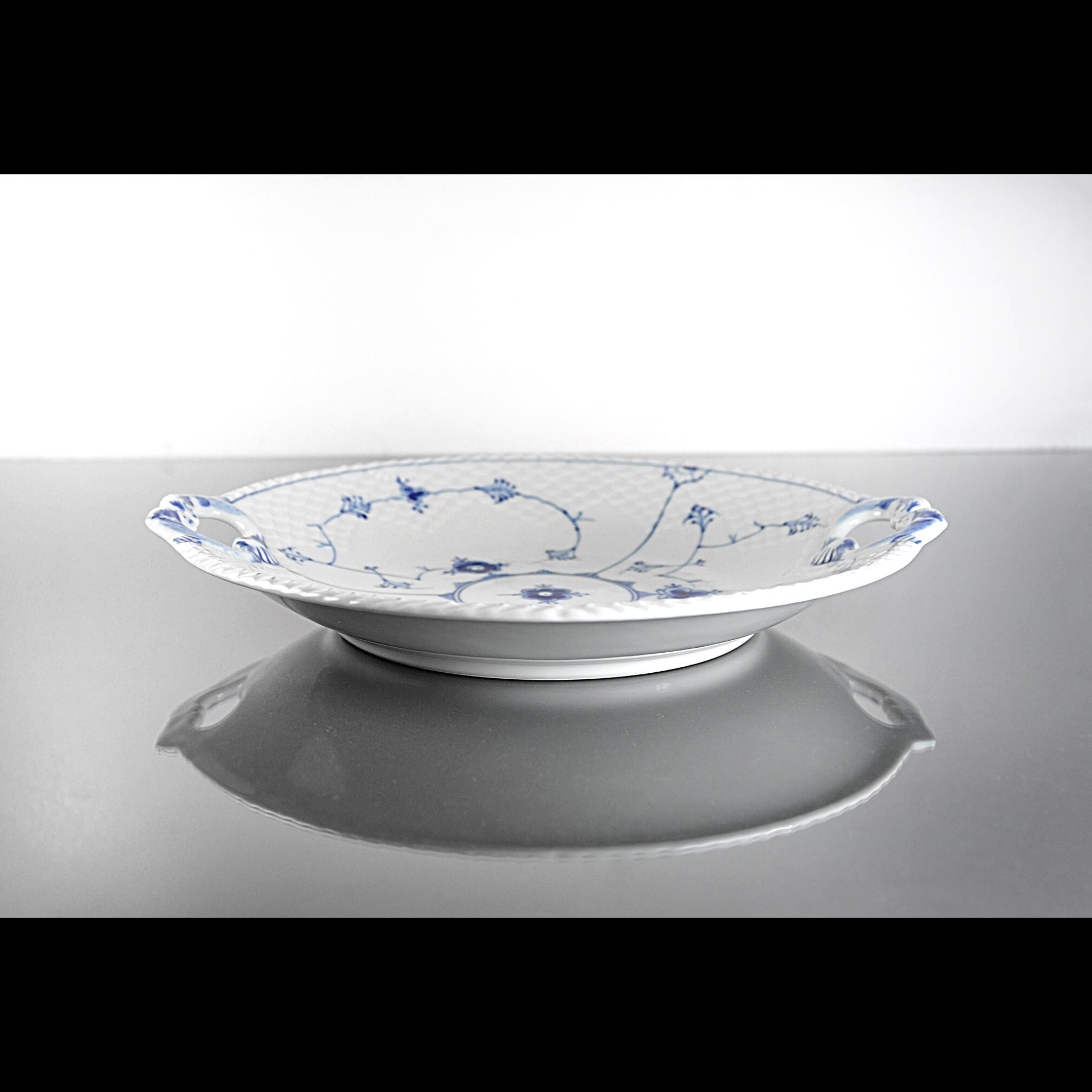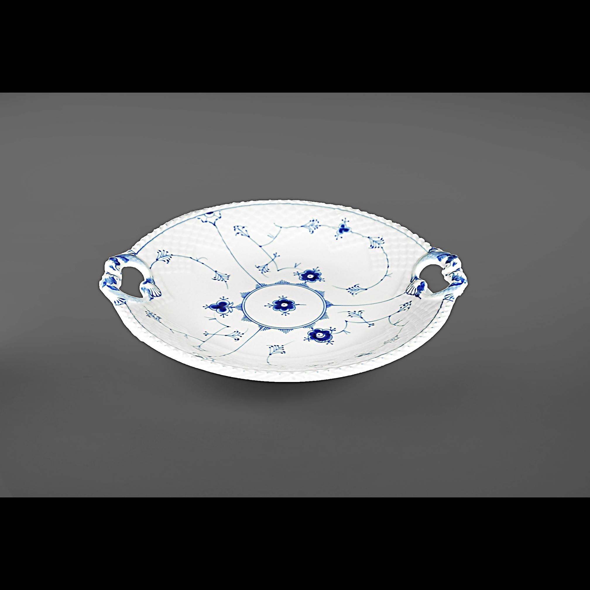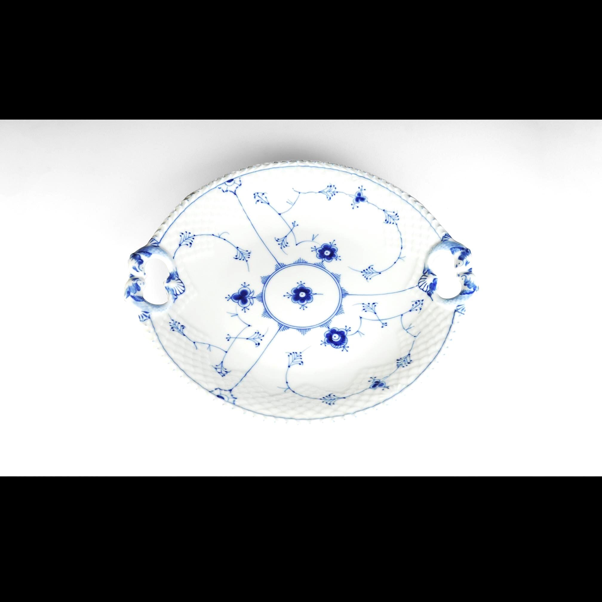 This vintage handled cake plate was made by Bing & Grøndahl of Copenhagen, Denmark, in the classic Blue Traditional pattern. It features a delicate hand-painted floral design with raised basketweave detail and pierced handles designed like fish highlighted in blue. The Blue Traditional (also called Blue Fluted) pattern is one of Denmark’s most enduring porcelain designs, first inspired by 18th-century Chinese export porcelain. It’s a beautiful serving piece that works just as well for display as for the table. Whether you use it to serve cakes and pastries, or showcase it in a china cabinet, it carries the timeless look of fine Danish porcelain. A fine collectible piece of Scandinavian porcelain, perfect for anyone who loves vintage European tableware.