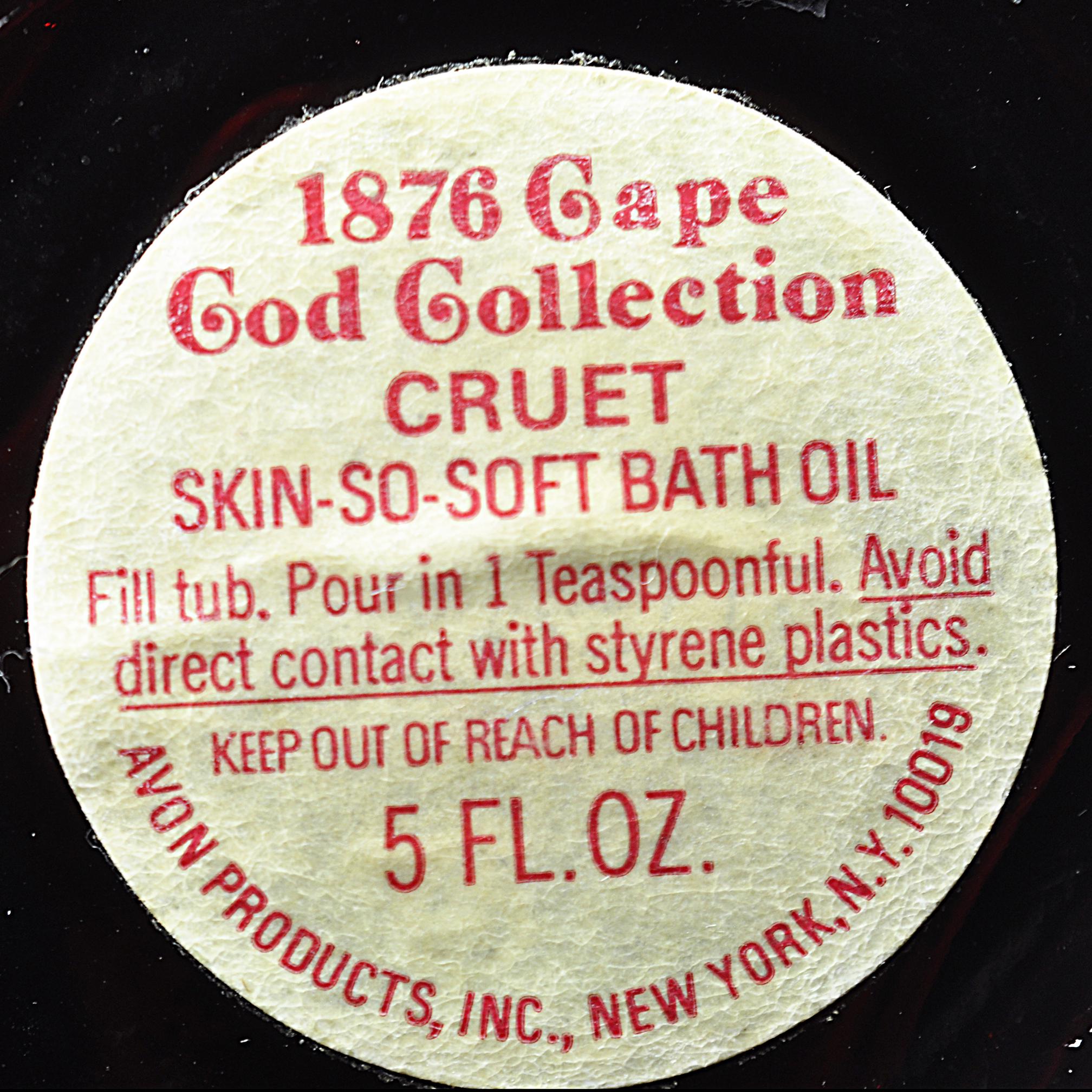 This cruet has no chips or cracks. The stopper doesn’t fit as tightly as it once did, which is common for these pieces, but it sits in place fine. The original Avon tag is still on the bottom.