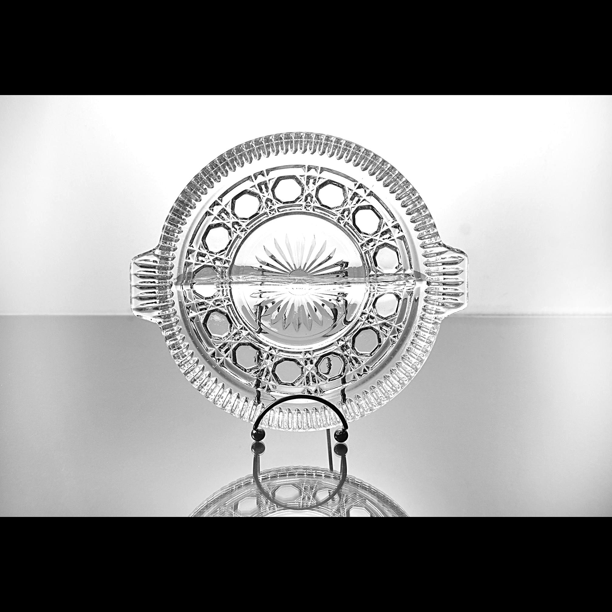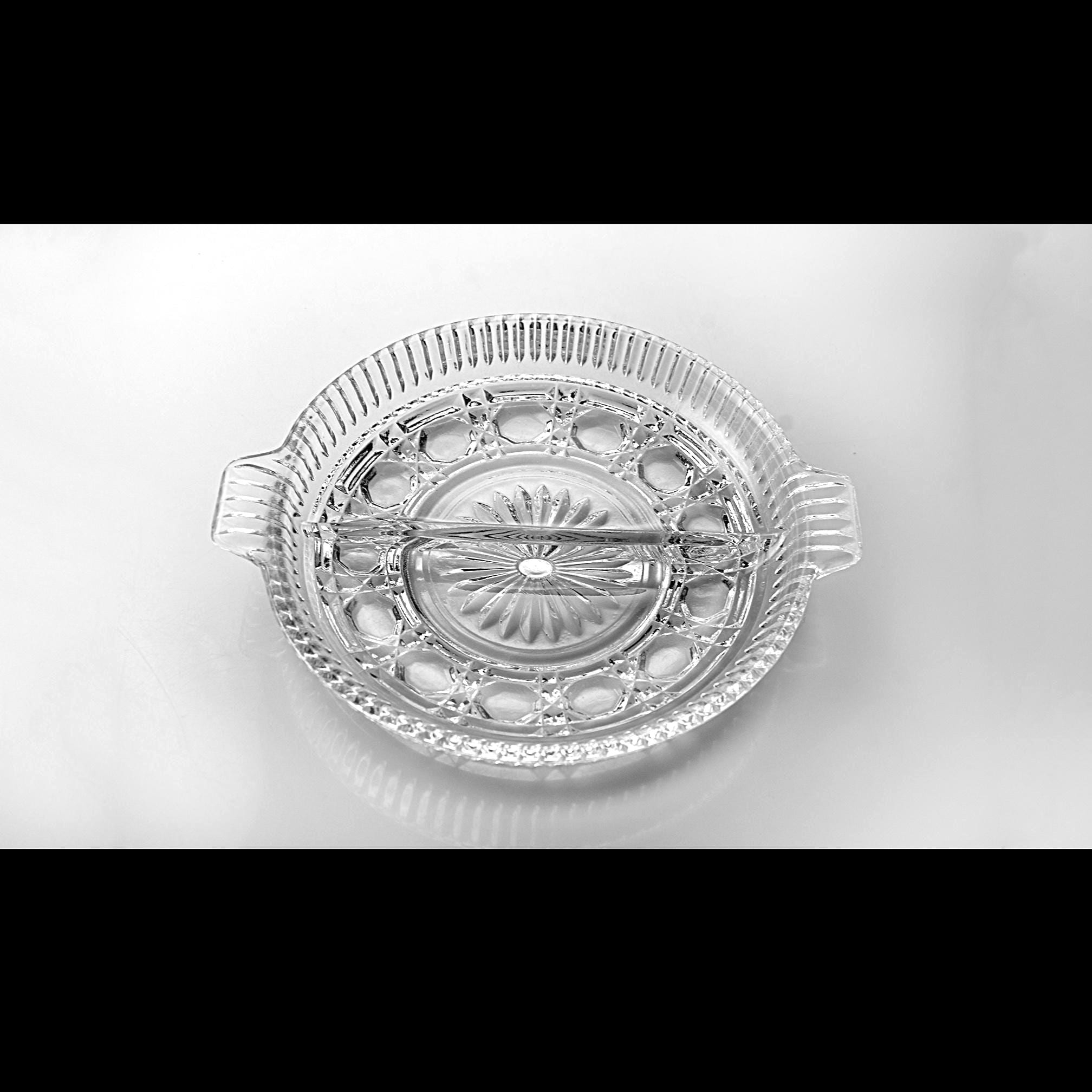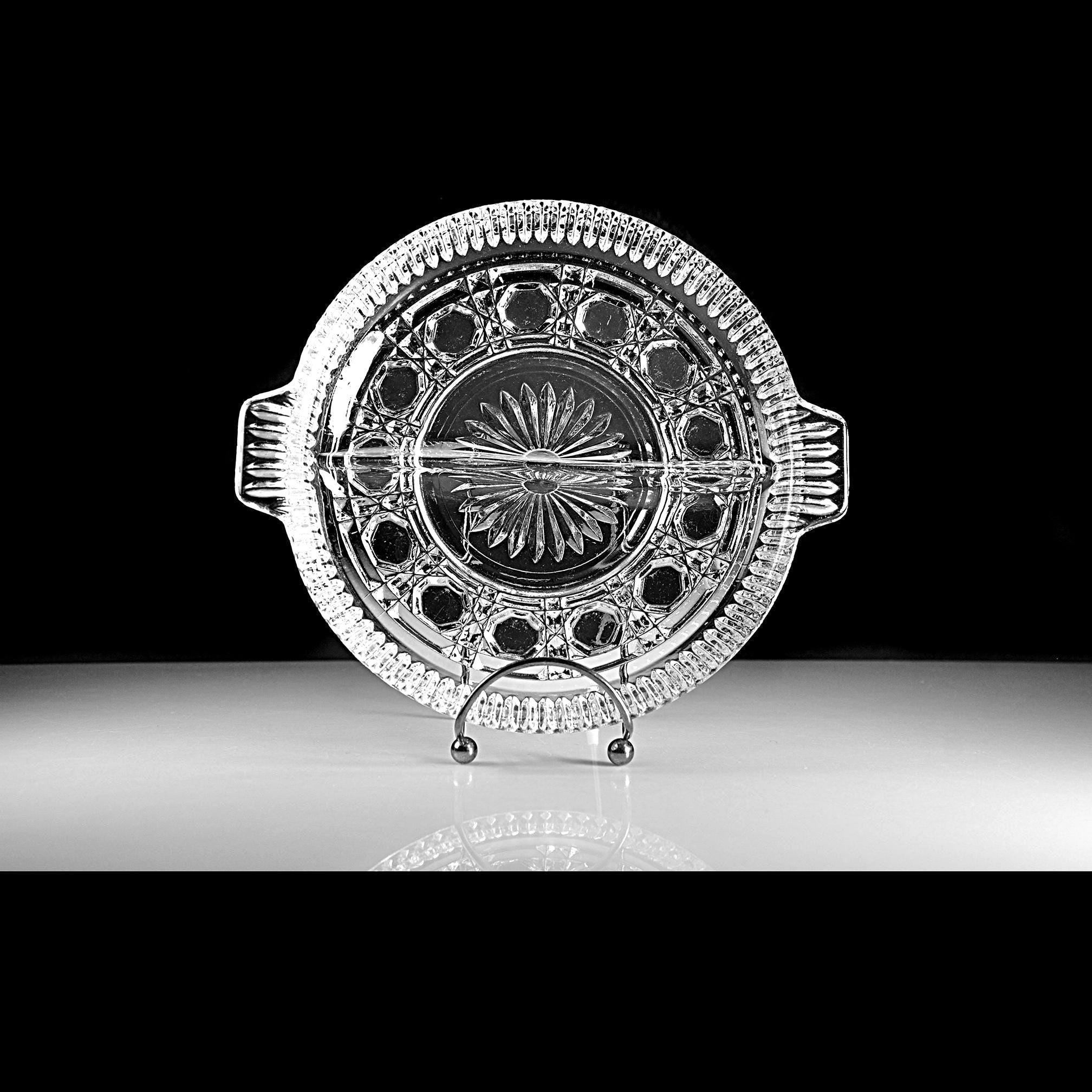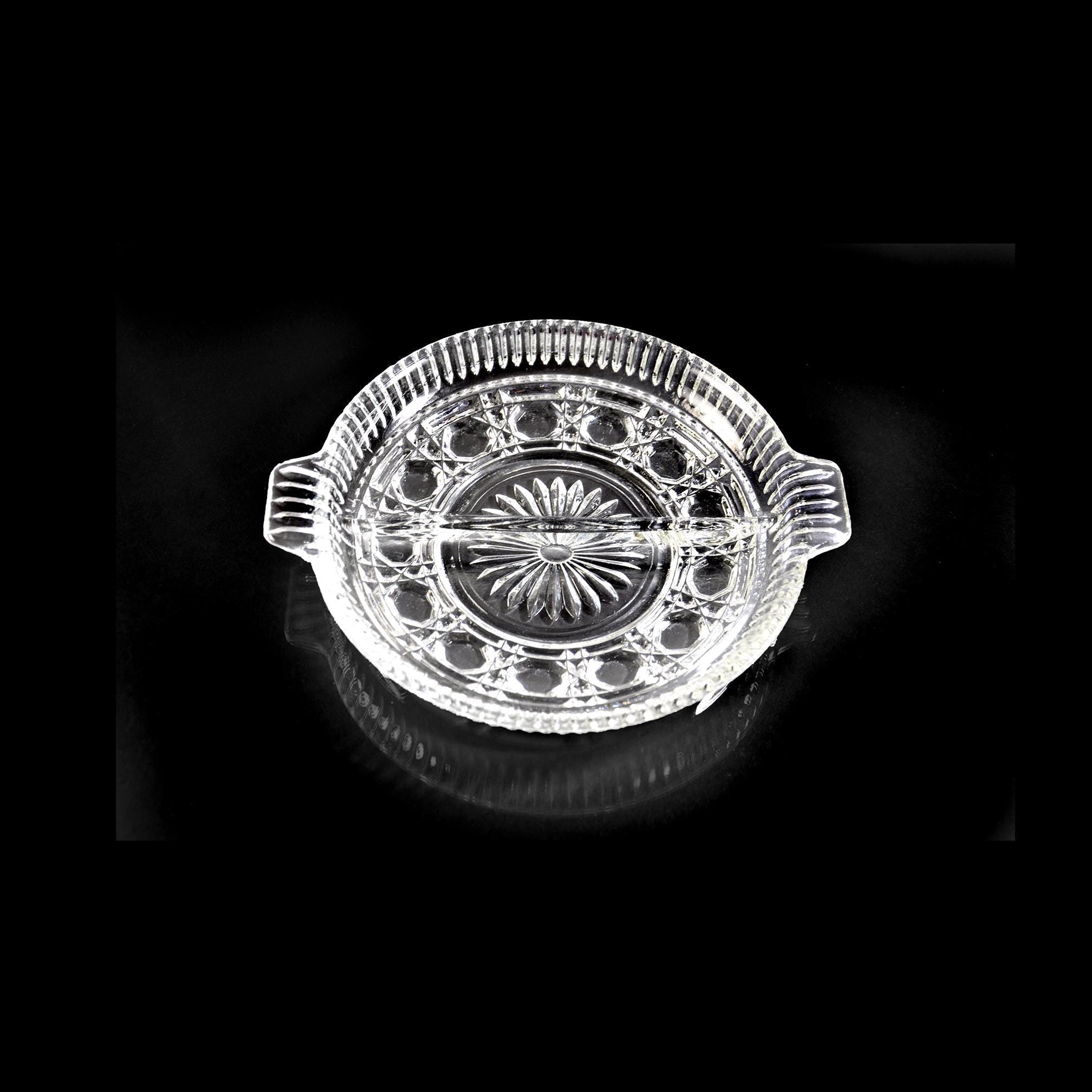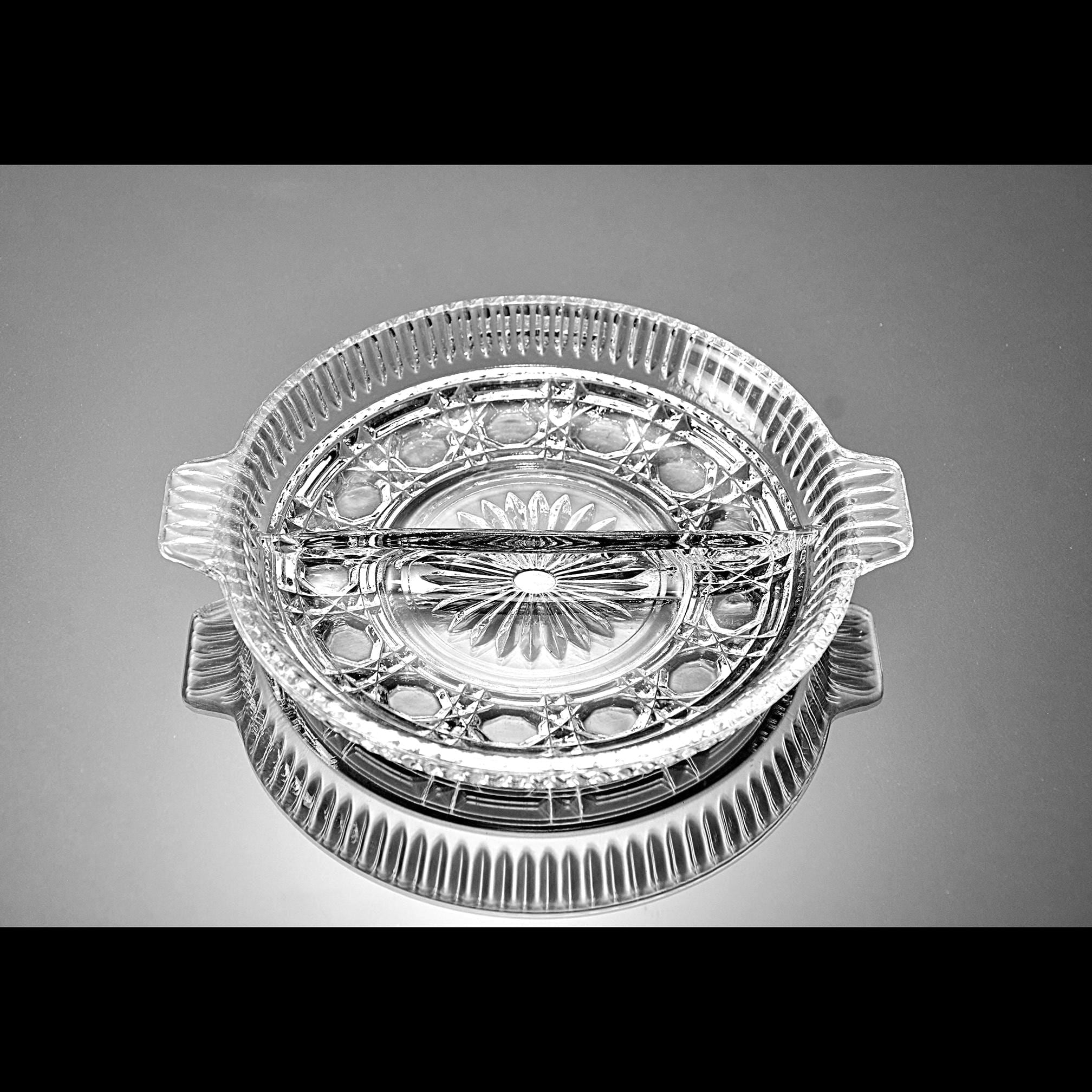 This is a Federal Glass relish dish in the Windsor pattern, made sometime between 1974 and 1979. It’s one of those sturdy, no-nonsense serving pieces that showed up at just about every family gathering back in the day. The pressed glass sparkles with that old-fashioned button and cane design, with a sunburst center that catches the light just right. It’s divided down the middle, so you can picture it holding celery and carrots on one side, and black olives or pickles on the other — the kinds of little touches that always showed up at Sunday dinners, holiday spreads, and neighborhood potlucks. It’s just the right size for entertaining without taking over the table. Federal Glass made Windsor near the end of their long run before closing in 1979, so this dish is both a nod to simpler times and a collectible piece of American glass history. Whether you use it for serving, for display, or to complete a Windsor set, this dish has that vintage charm that never really goes out of style.