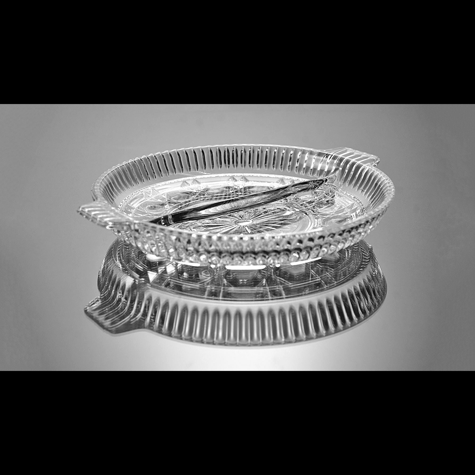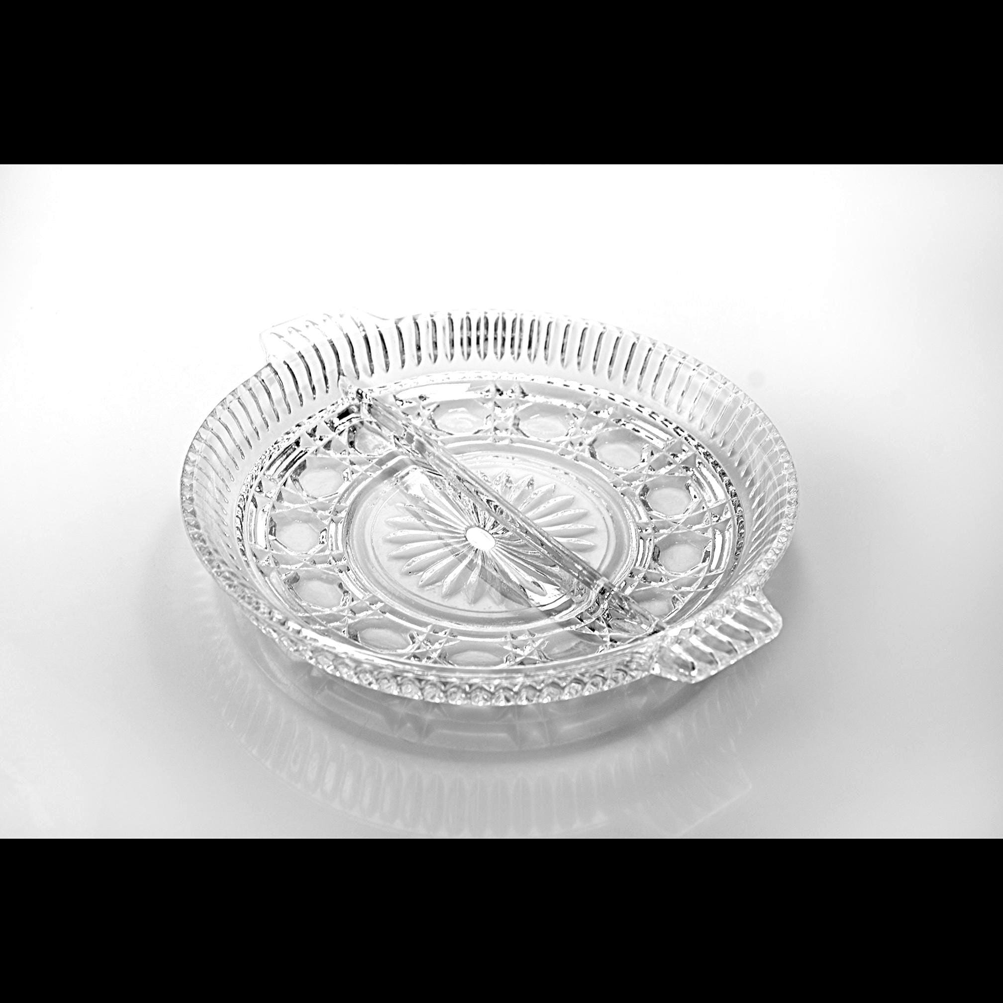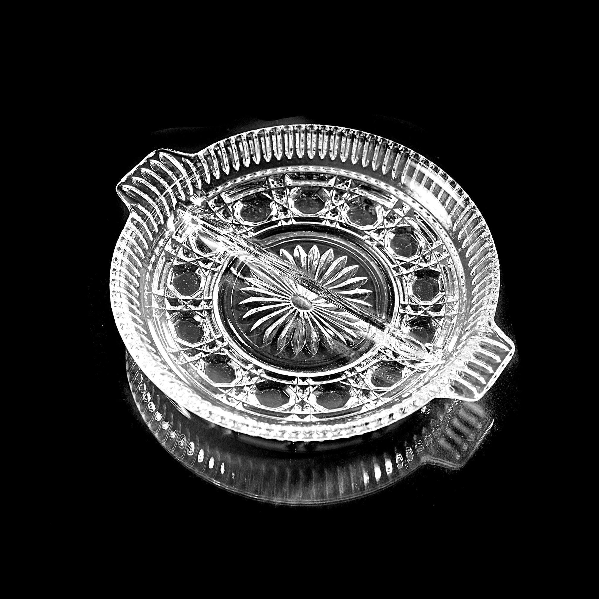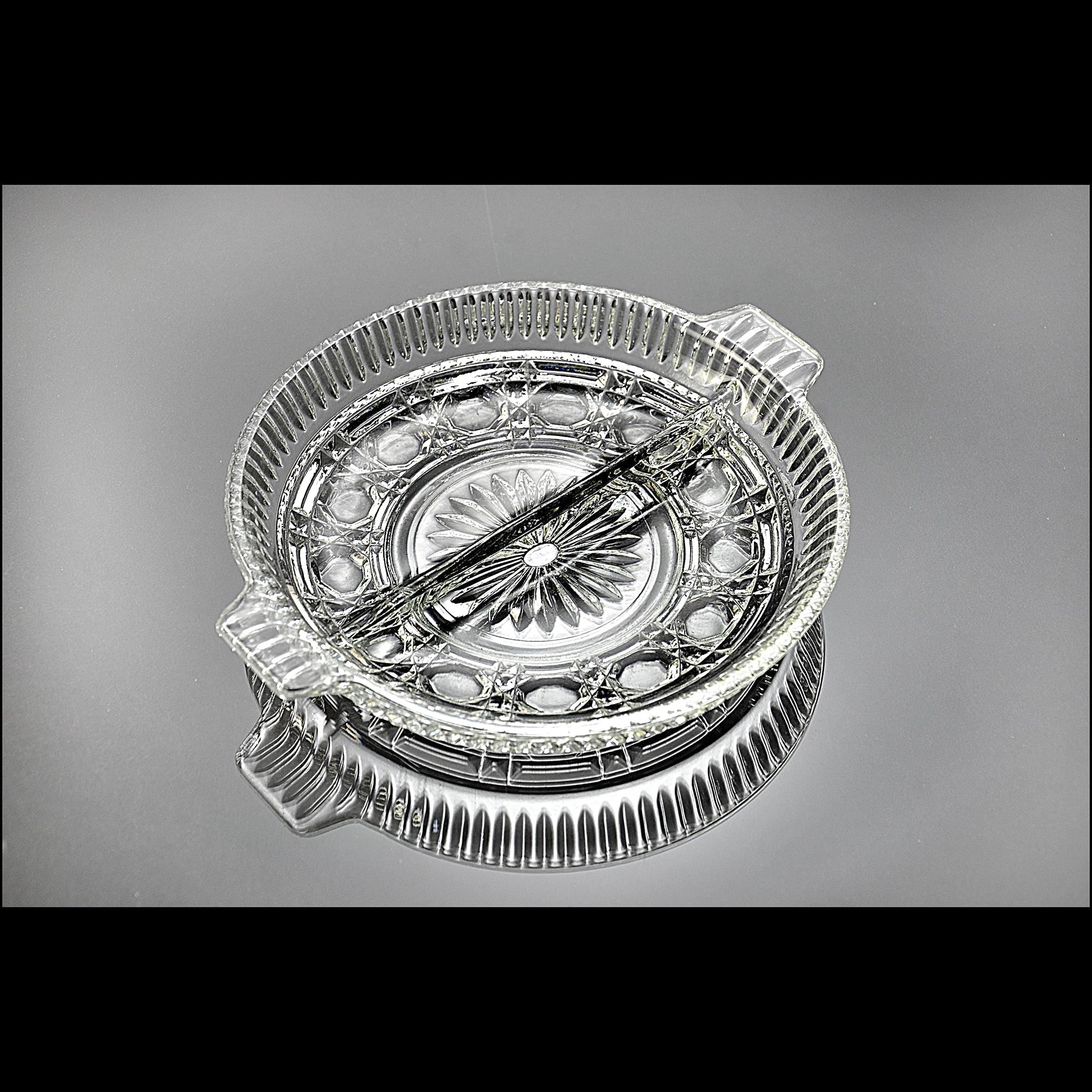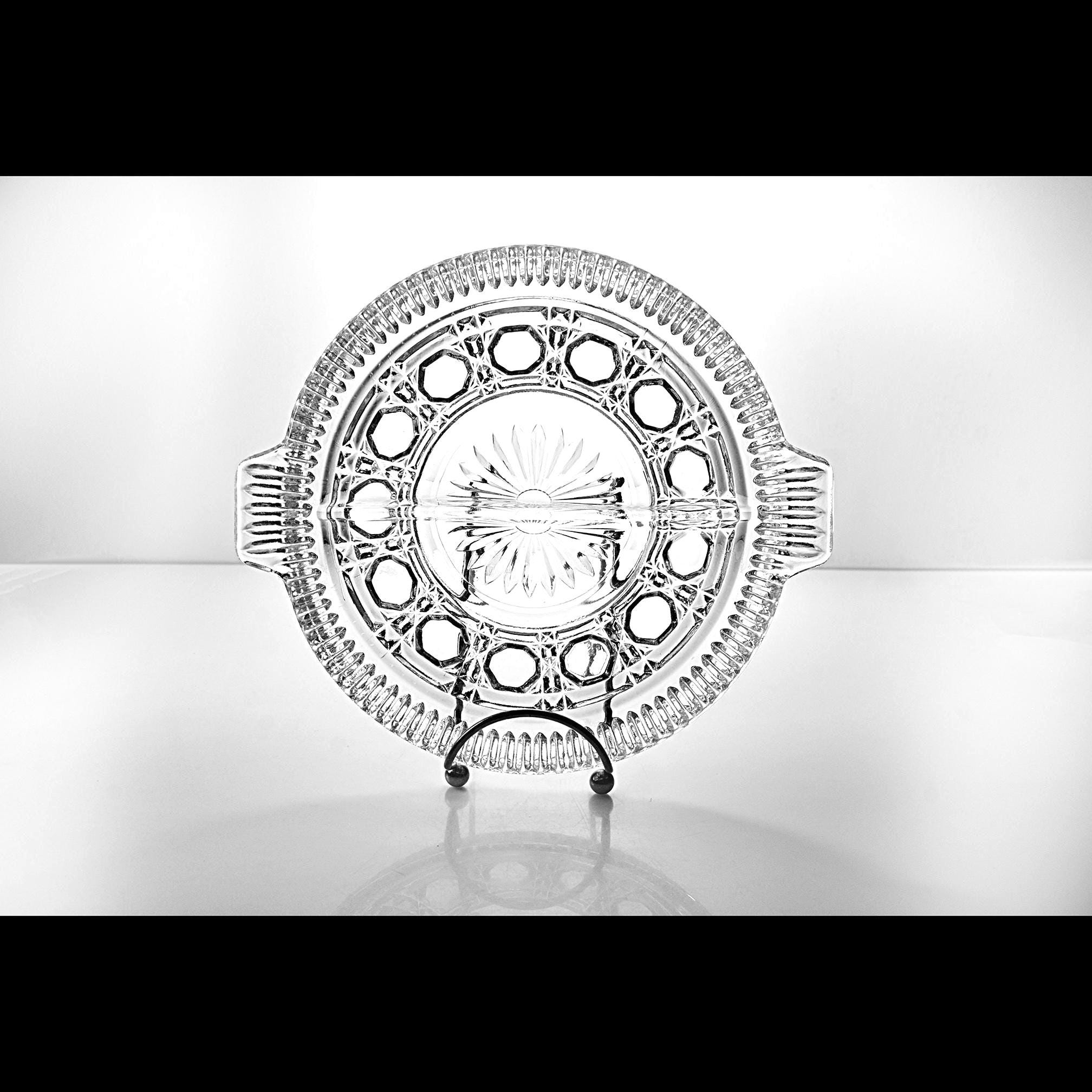 This is a Federal Glass relish dish in the Windsor pattern, made sometime between 1974 and 1979. It’s one of those sturdy, no-nonsense serving pieces that showed up at just about every family gathering back in the day. The pressed glass sparkles with that old-fashioned button and cane design, with a sunburst center that catches the light just right. It’s divided down the middle, so you can picture it holding celery and carrots on one side, and black olives or pickles on the other — the kinds of little touches that always showed up at Sunday dinners, holiday spreads, and neighborhood potlucks. It’s just the right size for entertaining without taking over the table. Federal Glass made Windsor near the end of their long run before closing in 1979, so this dish is both a nod to simpler times and a collectible piece of American glass history. Whether you use it for serving, for display, or to complete a Windsor set, this dish has that vintage charm that never really goes out of style.
