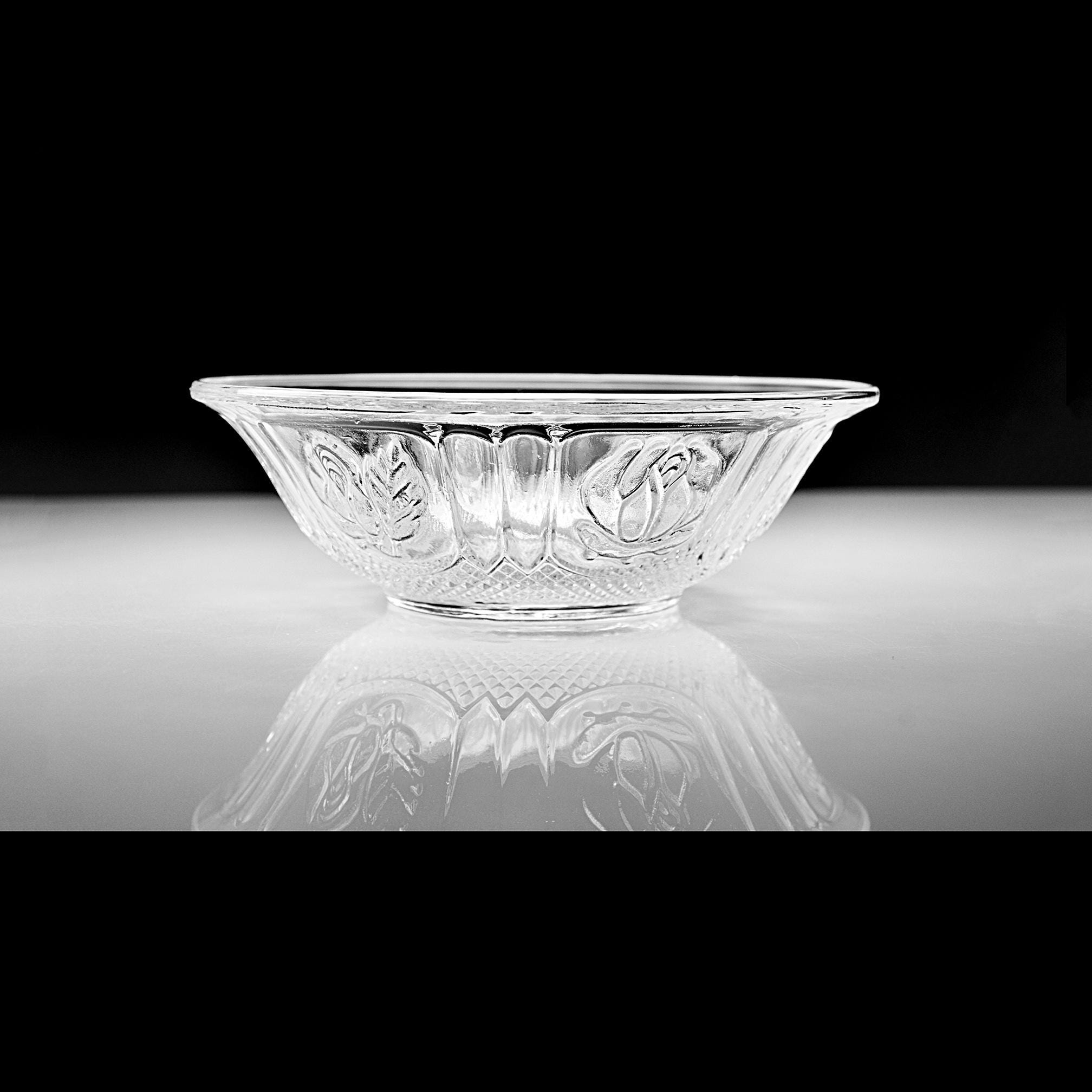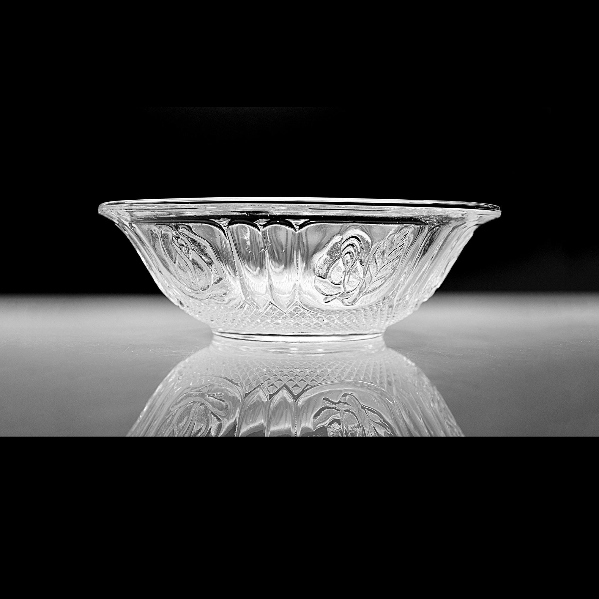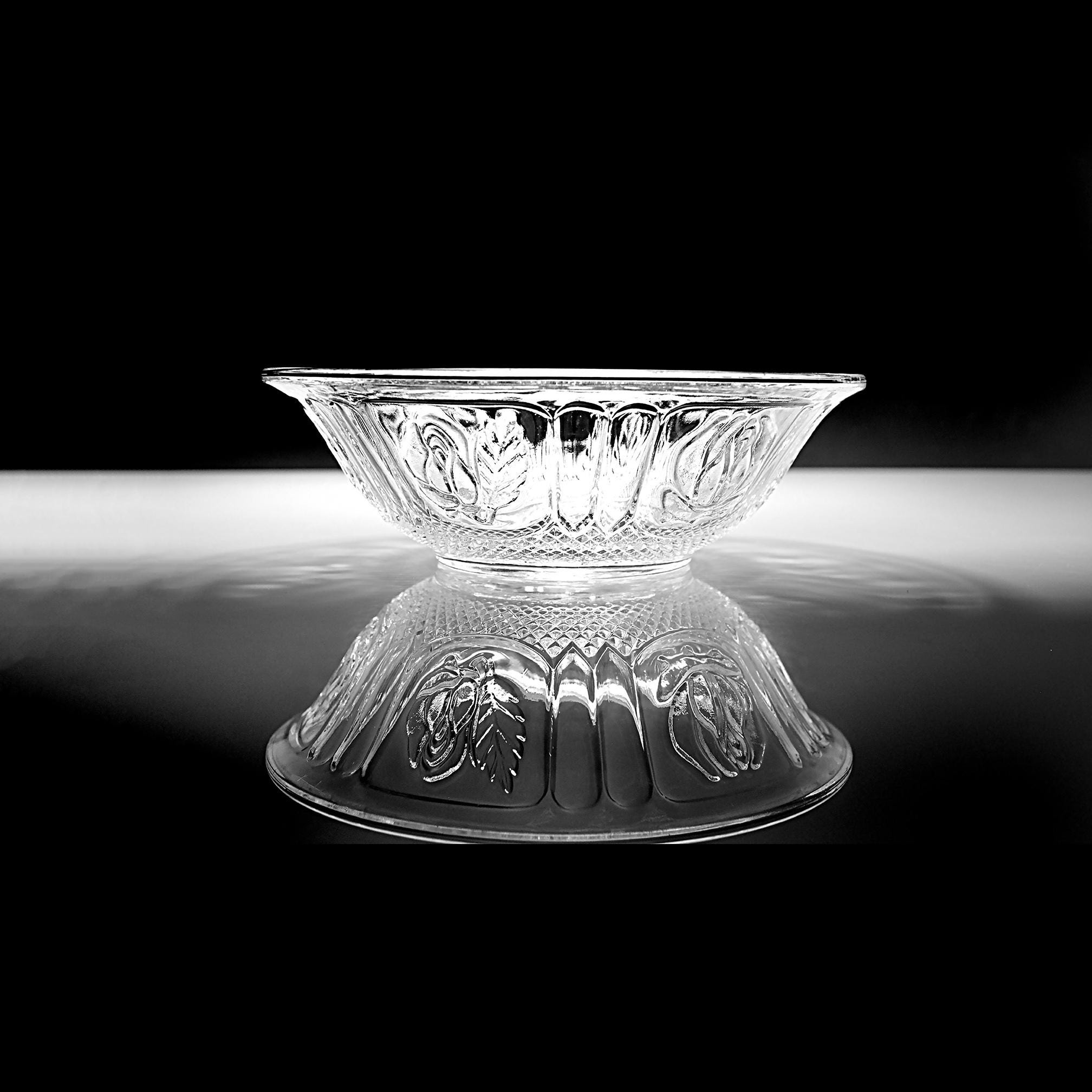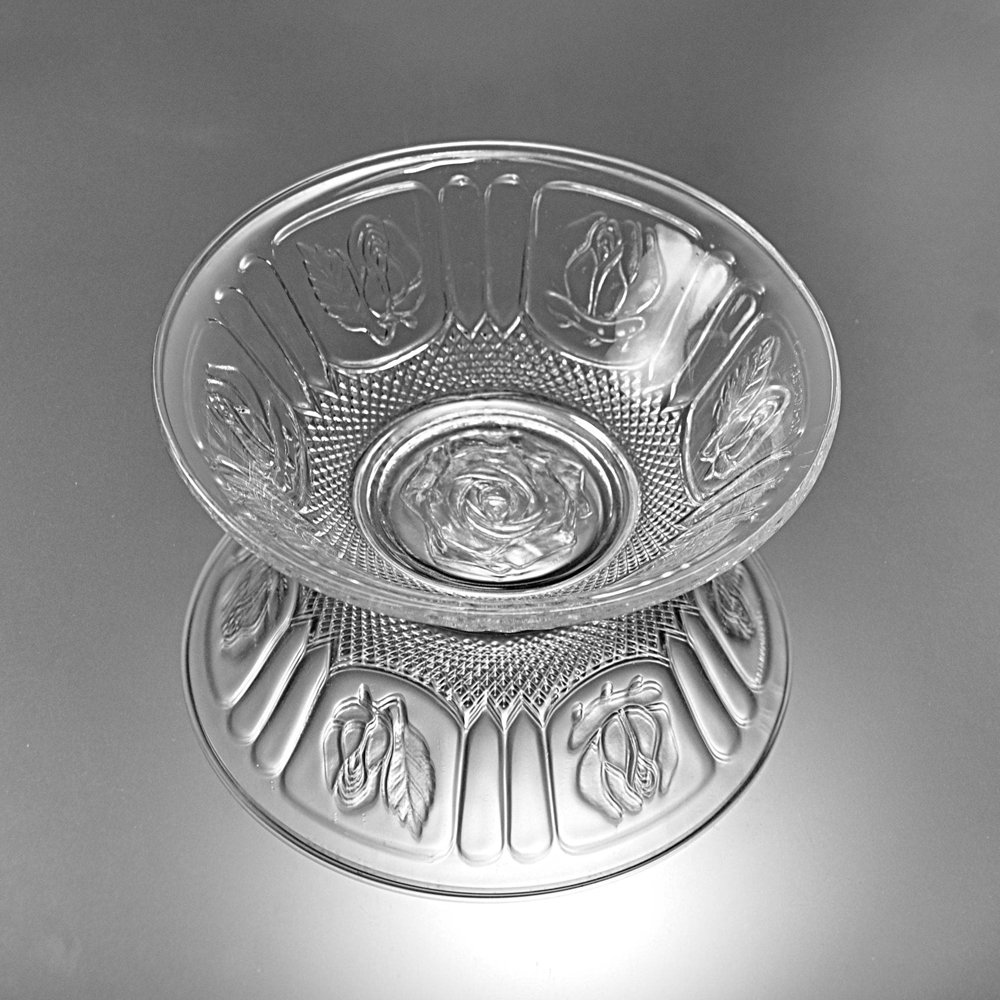 This clear glass bowl was made by KIG Indonesia, a company known for turning out sturdy, everyday glassware in the 1980s and 1990s. The pattern is easy to love – a bold rose in the bottom and rosebud-and-leaf panels around the sides, all set against a textured background. It’s pressed glass, the kind you saw on kitchen shelves, set out at church suppers, or filled with potato salad at family picnics.