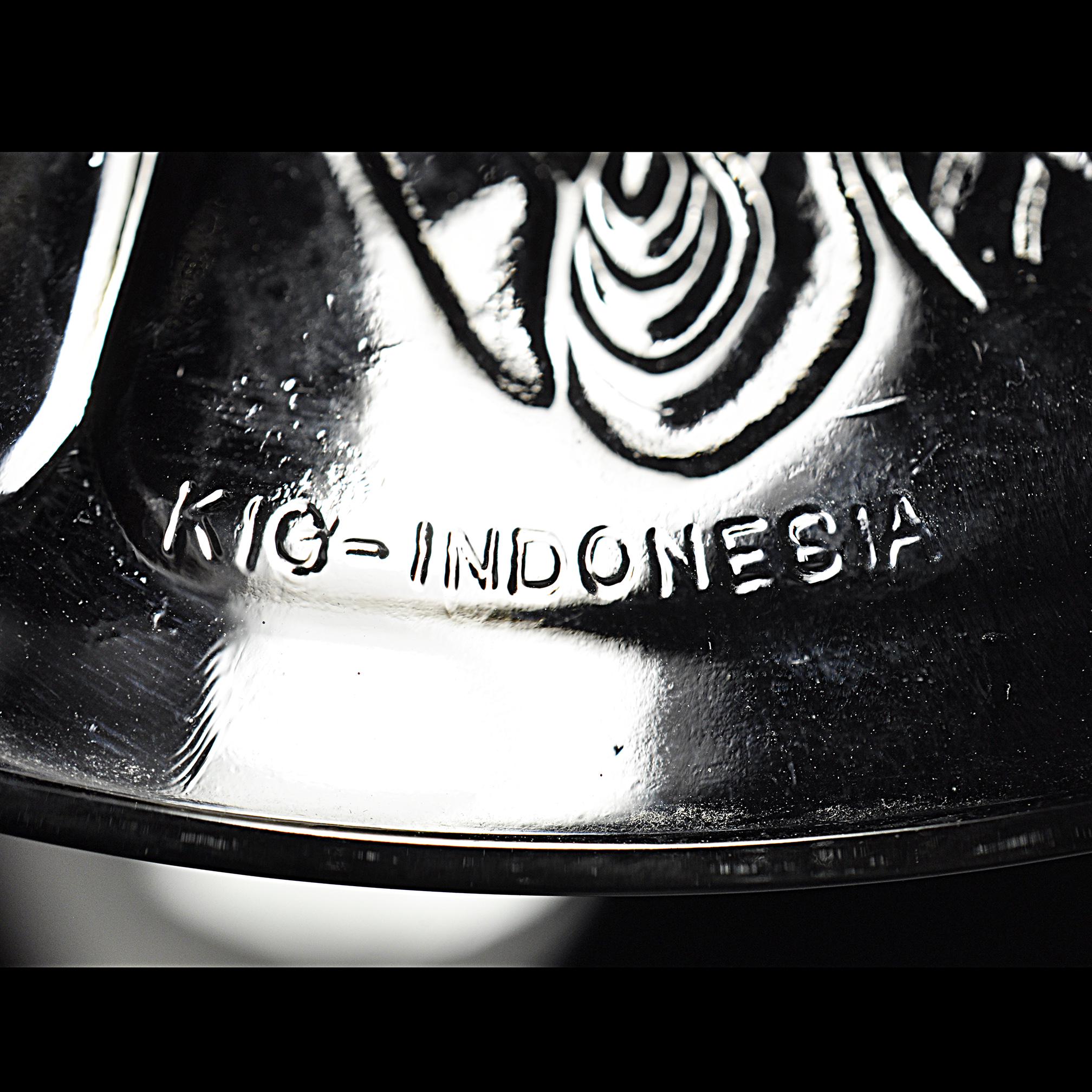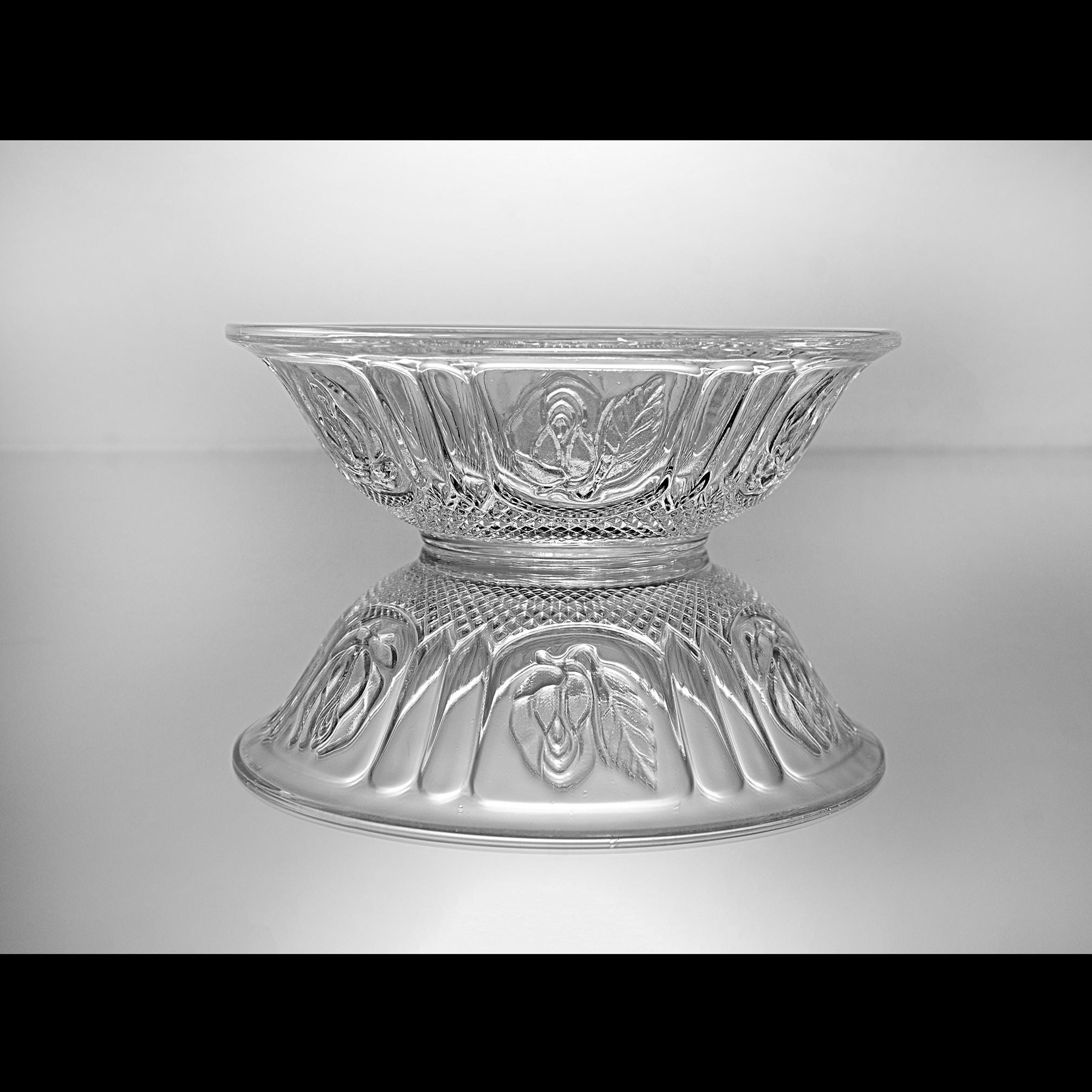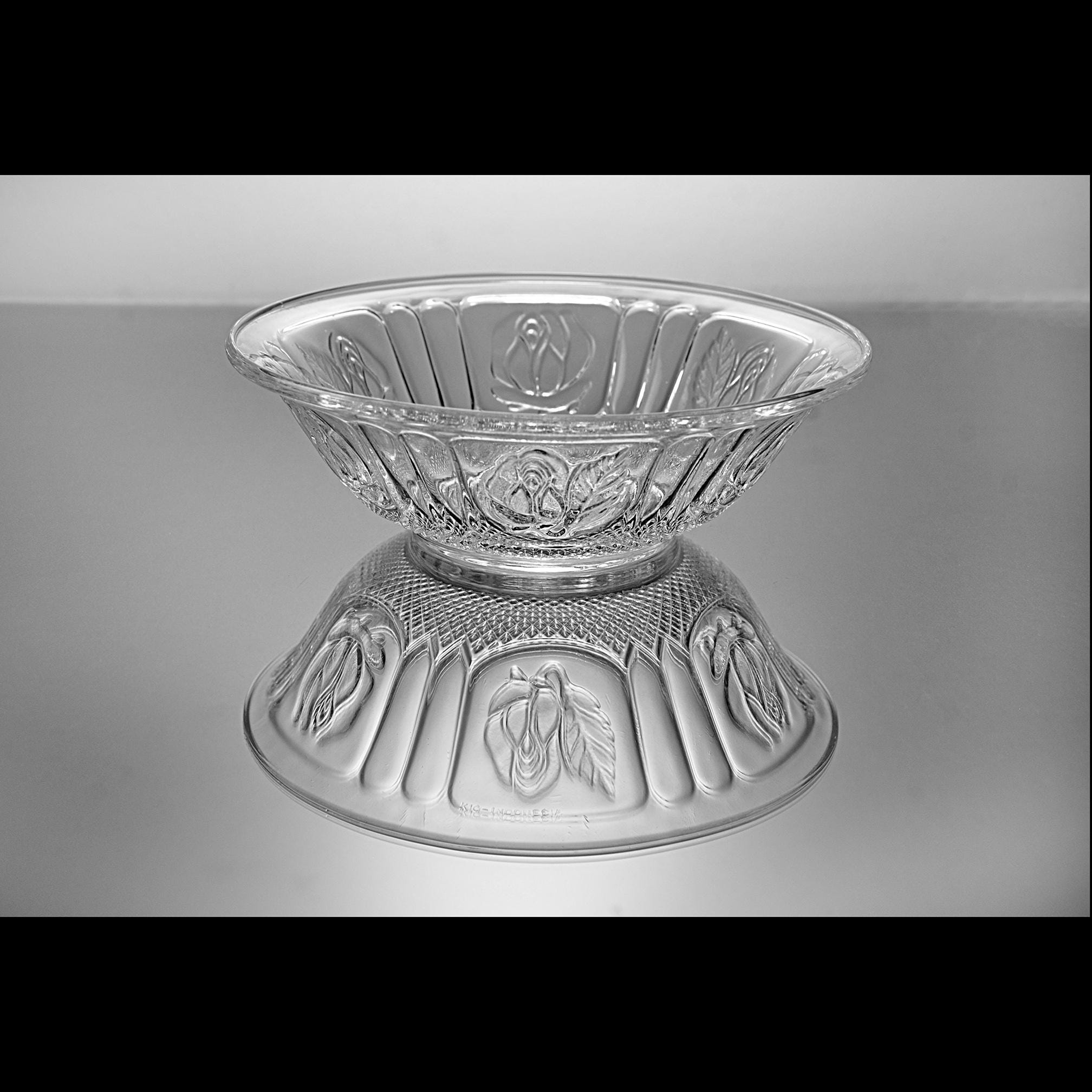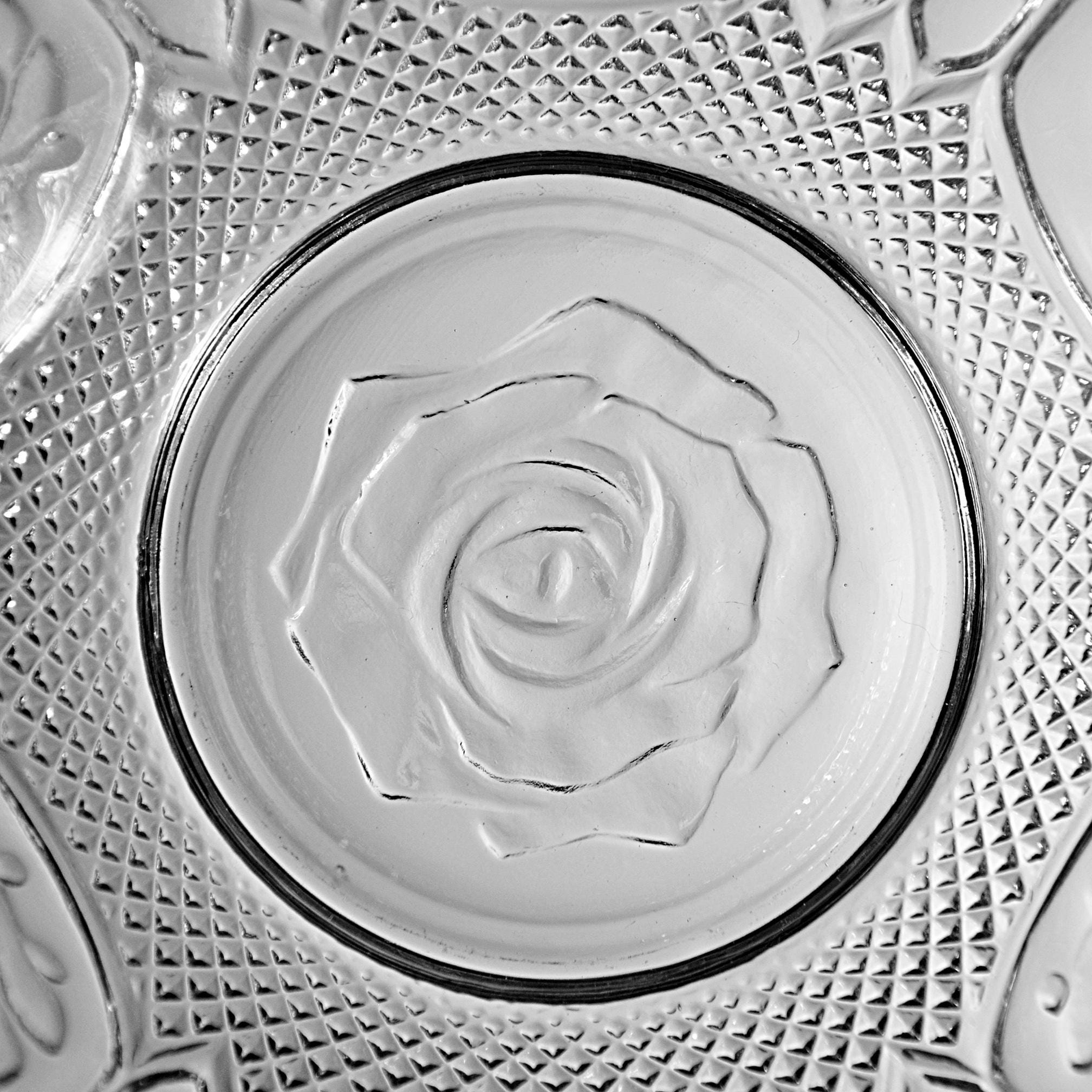 This clear glass bowl was made by KIG Indonesia, a company known for turning out sturdy, everyday glassware in the 1980s and 1990s. The pattern is easy to love – a bold rose in the bottom and rosebud-and-leaf panels around the sides, all set against a textured background. It’s pressed glass, the kind you saw on kitchen shelves, set out at church suppers, or filled with potato salad at family picnics.
