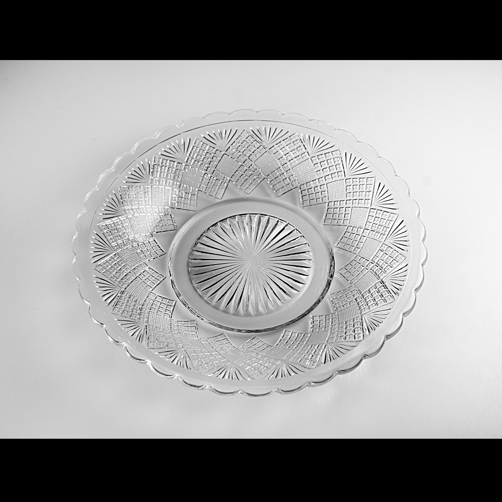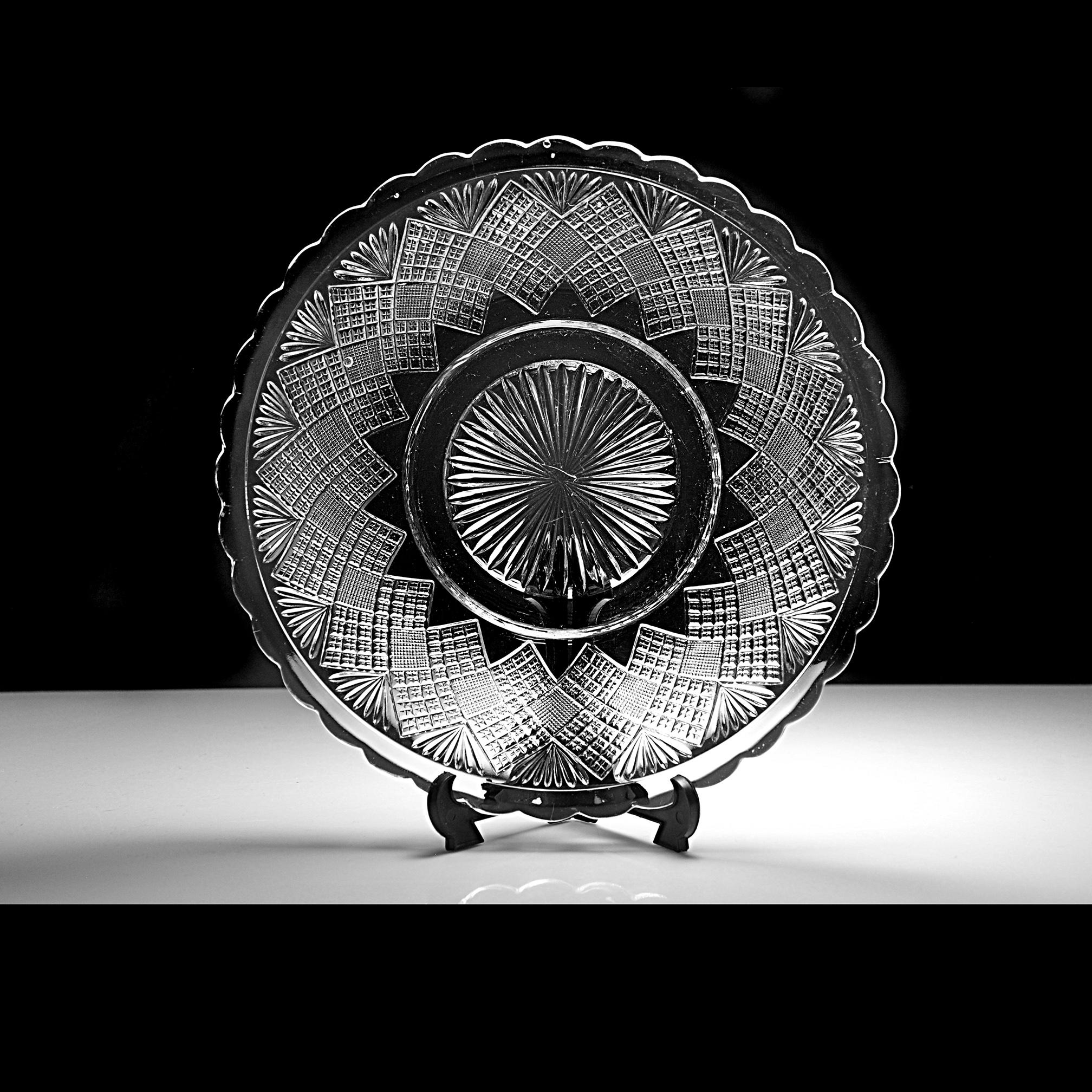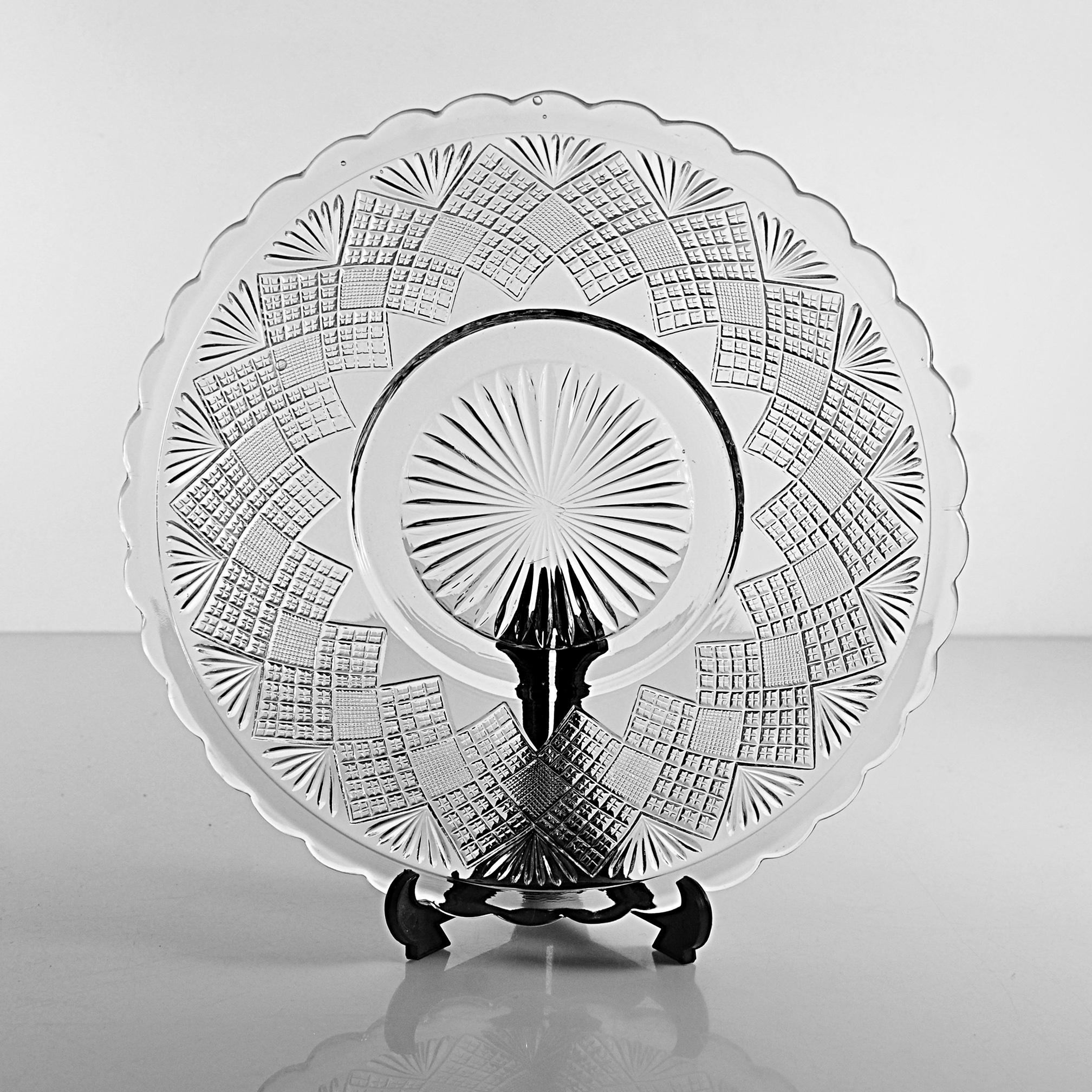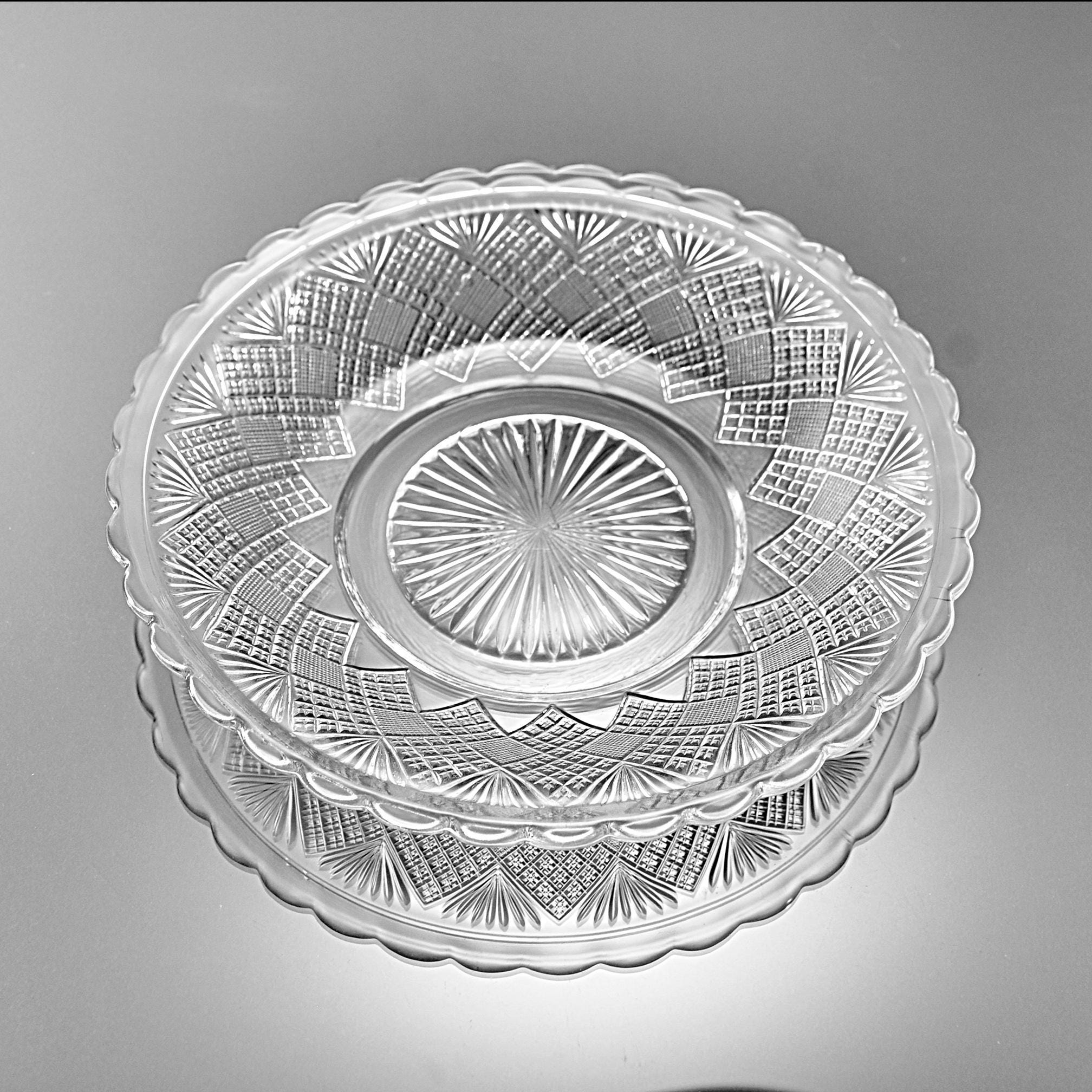 The glass is bright and clear with no chips, cracks, or utensil marks, only a small mold mark in the center from the original pressing and small air bubbles show — a little trace of 19th-century craftsmanship.