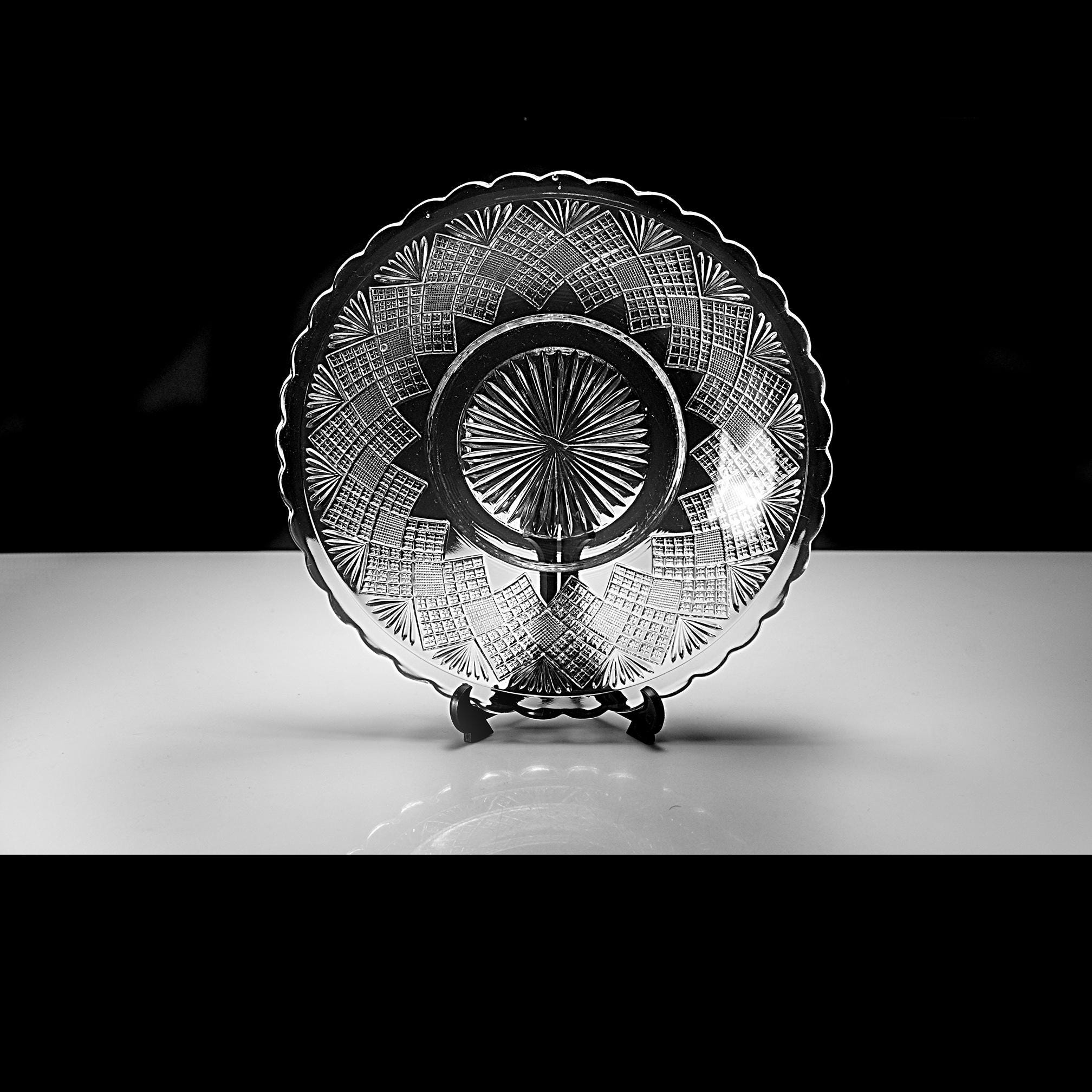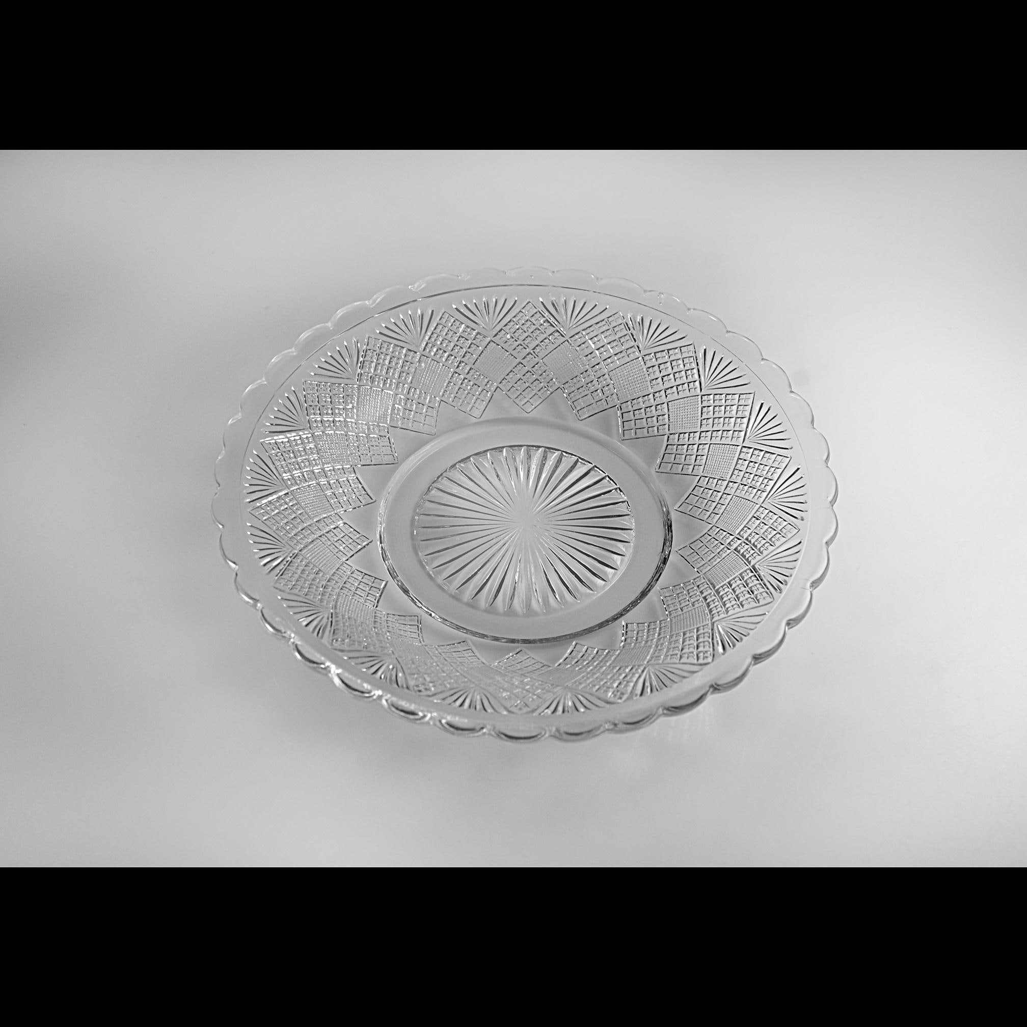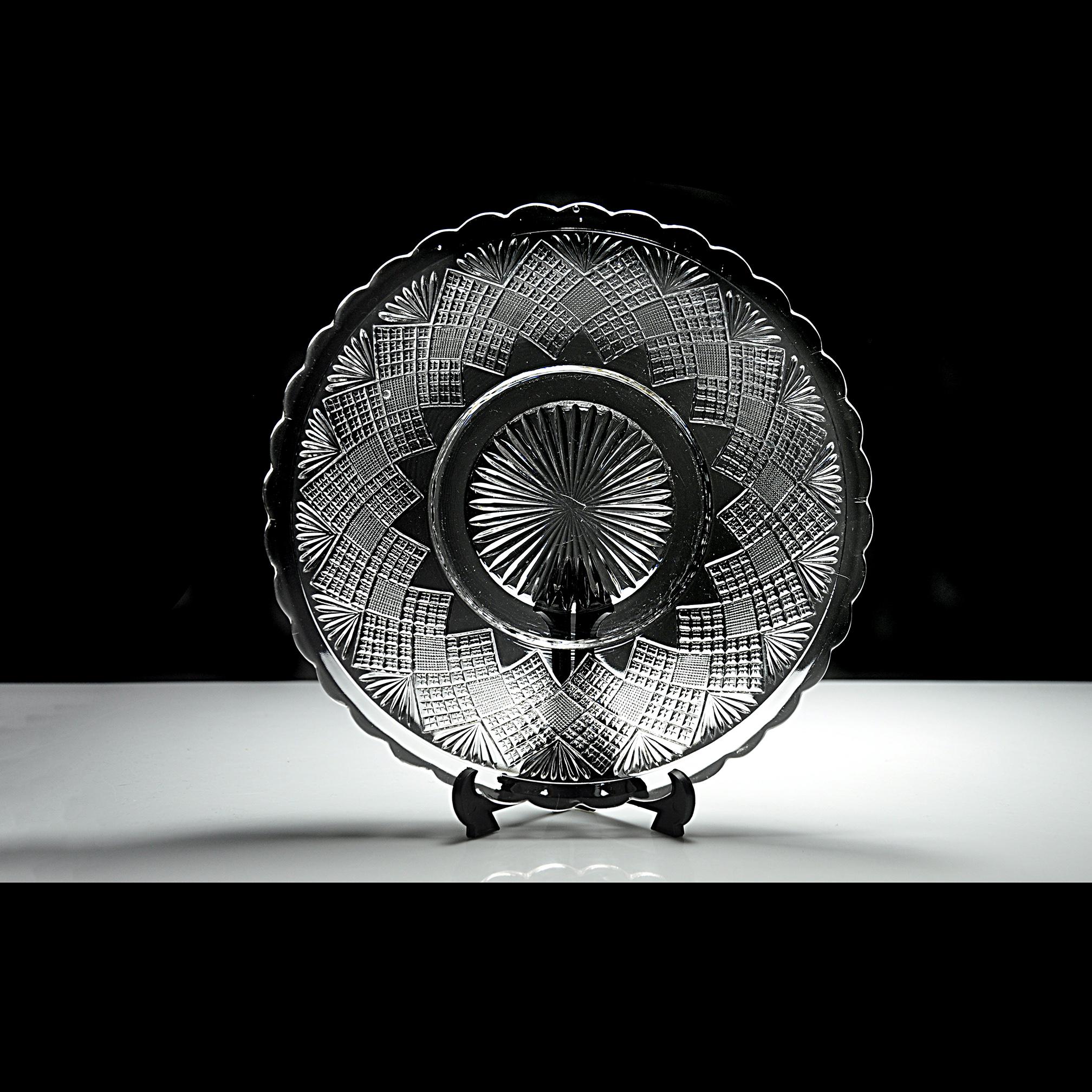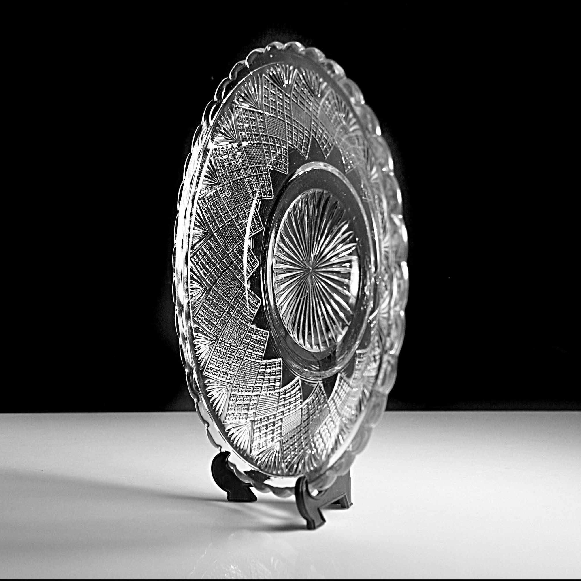 The glass is bright and clear with no chips, cracks, or utensil marks, only a small mold mark in the center from the original pressing and small air bubbles show — a little trace of 19th-century craftsmanship.